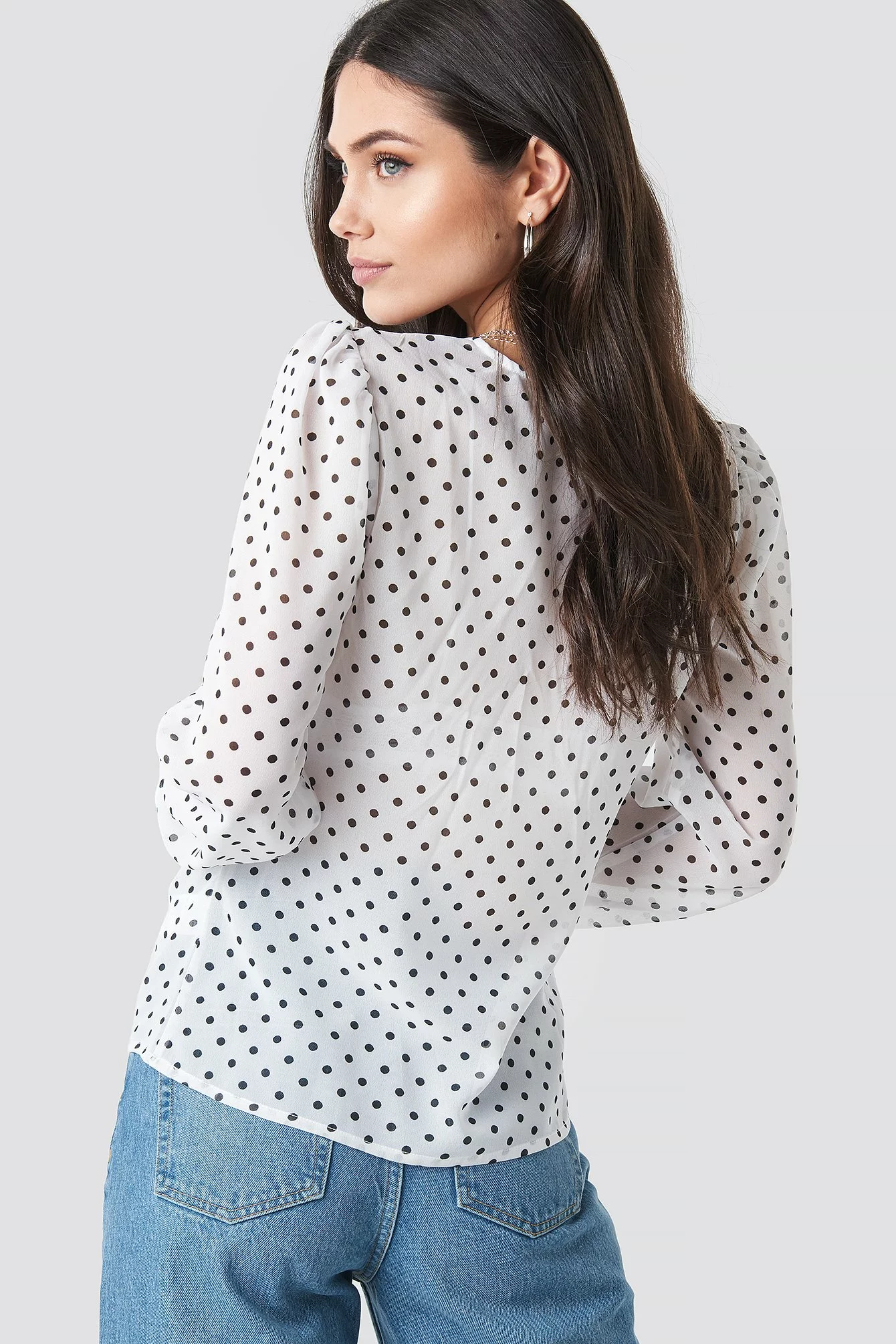 The Gathered Front LS Blouse by NA-KD features a v-neckline in a sheer material. Elastic at sleeves hem.