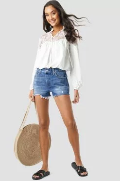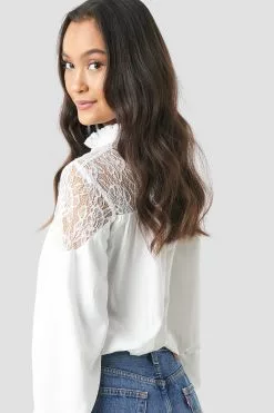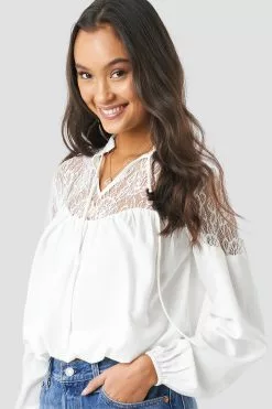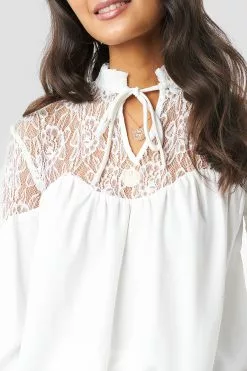 This blouse by NA-KD Boho features balloon sleeves, lace details, a frill neckline with a self-tie drawstring and a v-neck cut and an elasticized waist and cuff.
