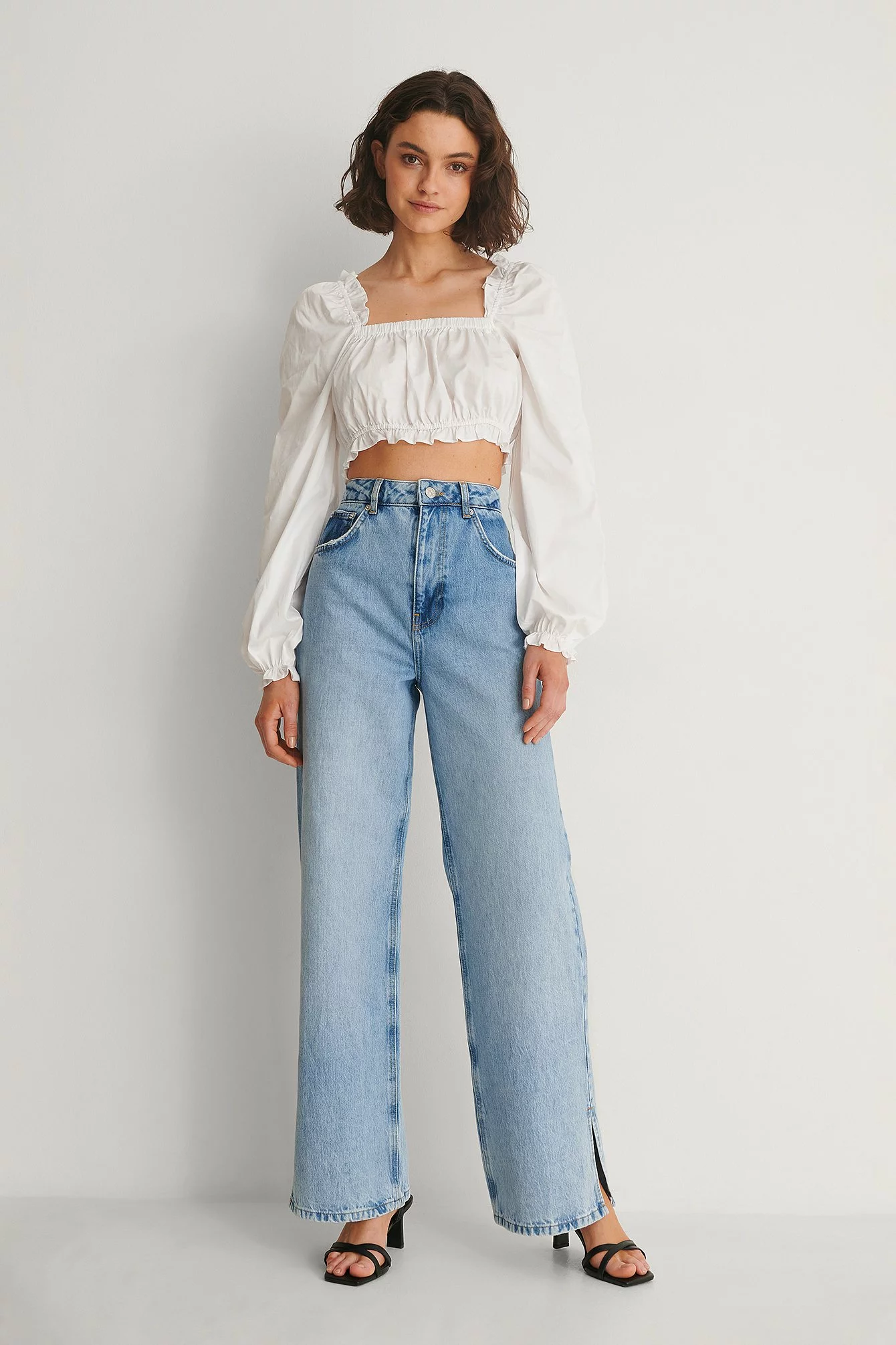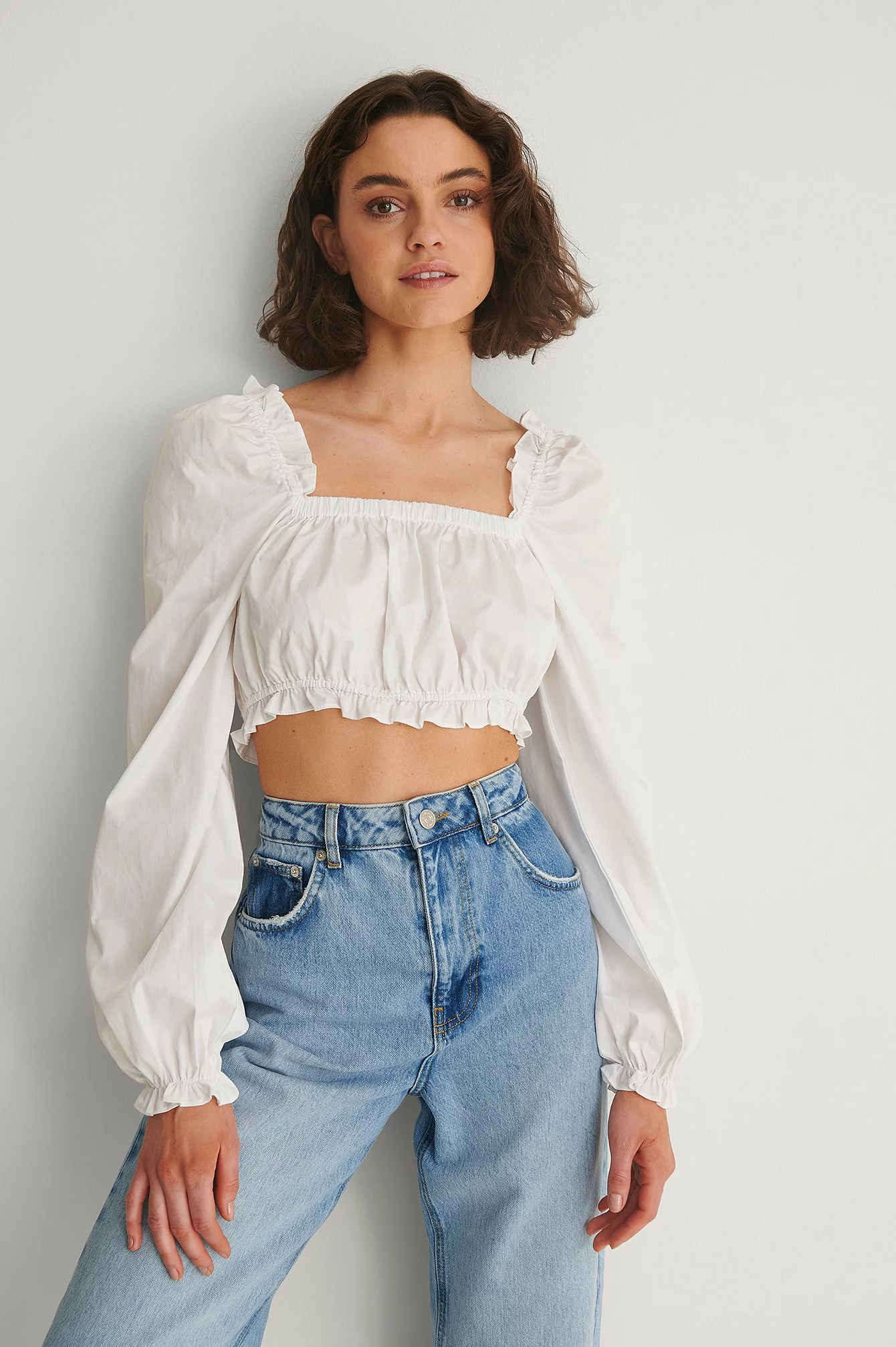This top features an elasticized, squared neckline, long puff sleeves, elasticized waist and cuffs, frill details and a cropped length.