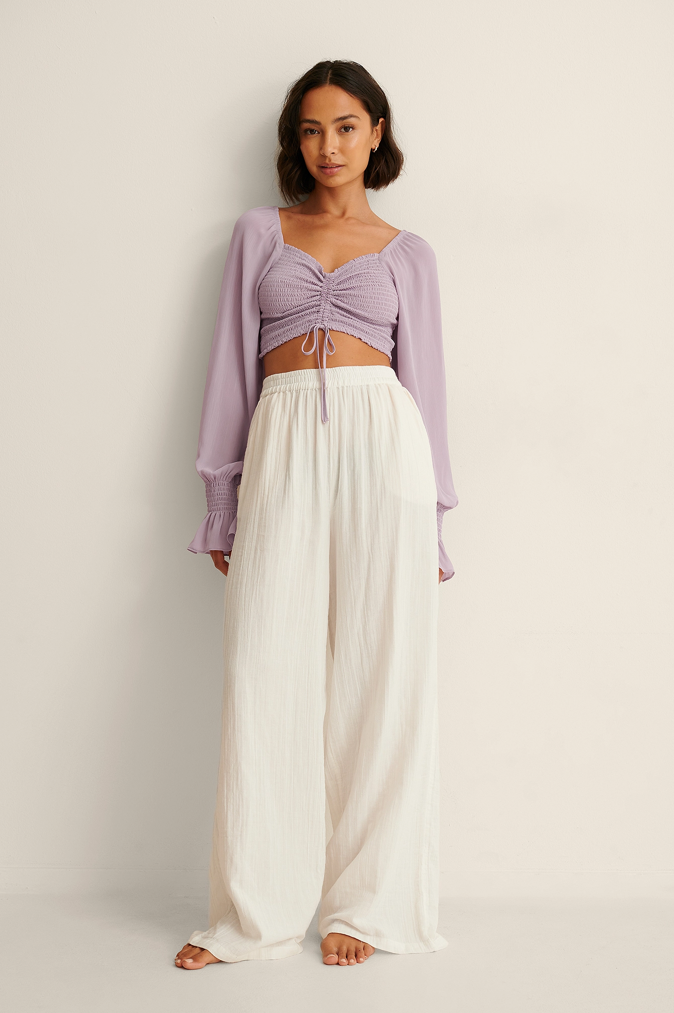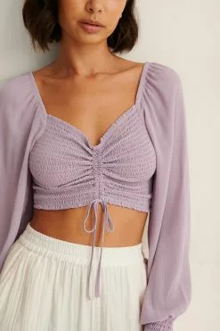 This blouse features a slightly transparent balloon sleeve with a smocking and a frill design at the hem, inner silicone trims at the shoulders, a heart-shaped neckline, a self-tie drawstring on the chest, a smocking and cropped length.