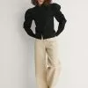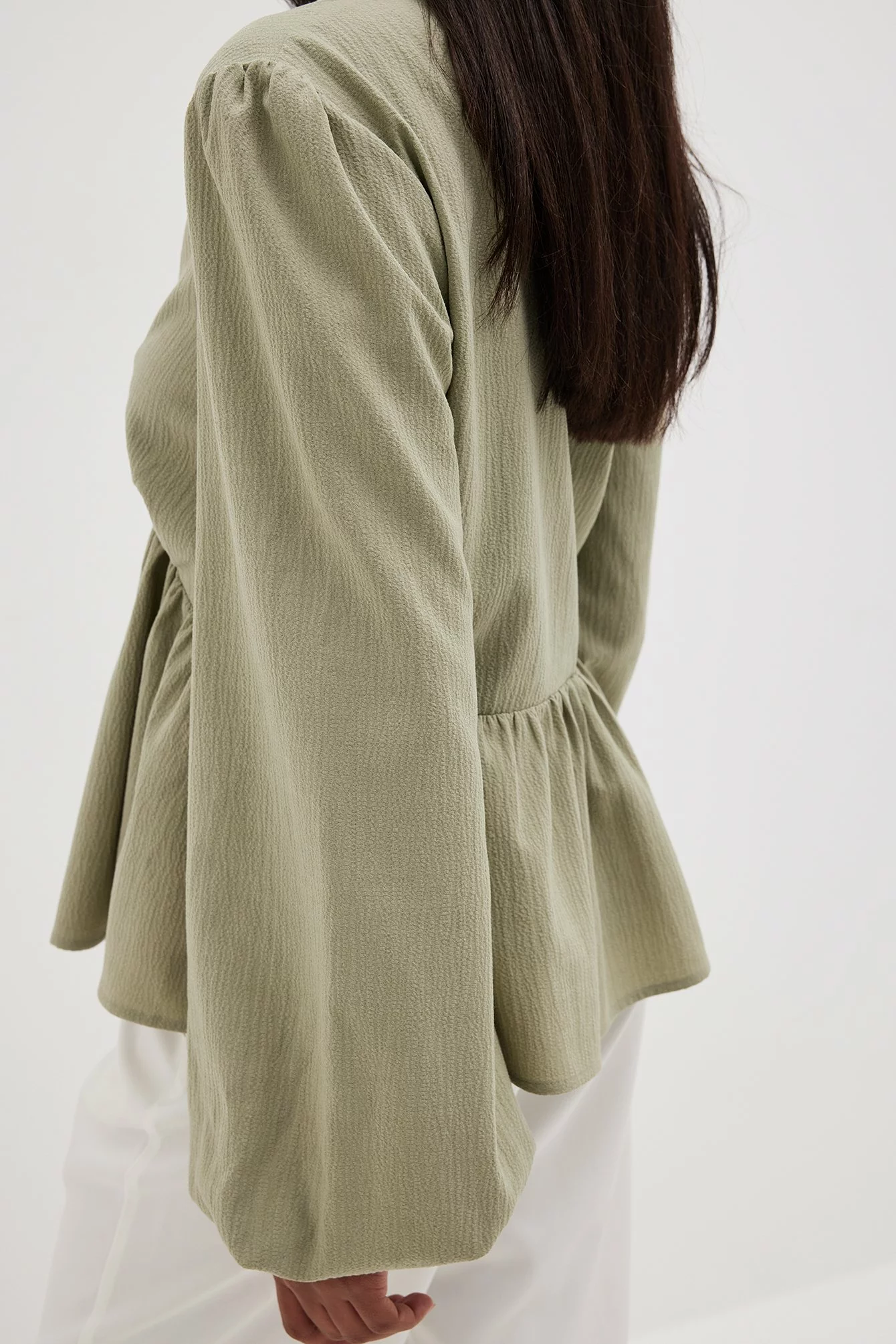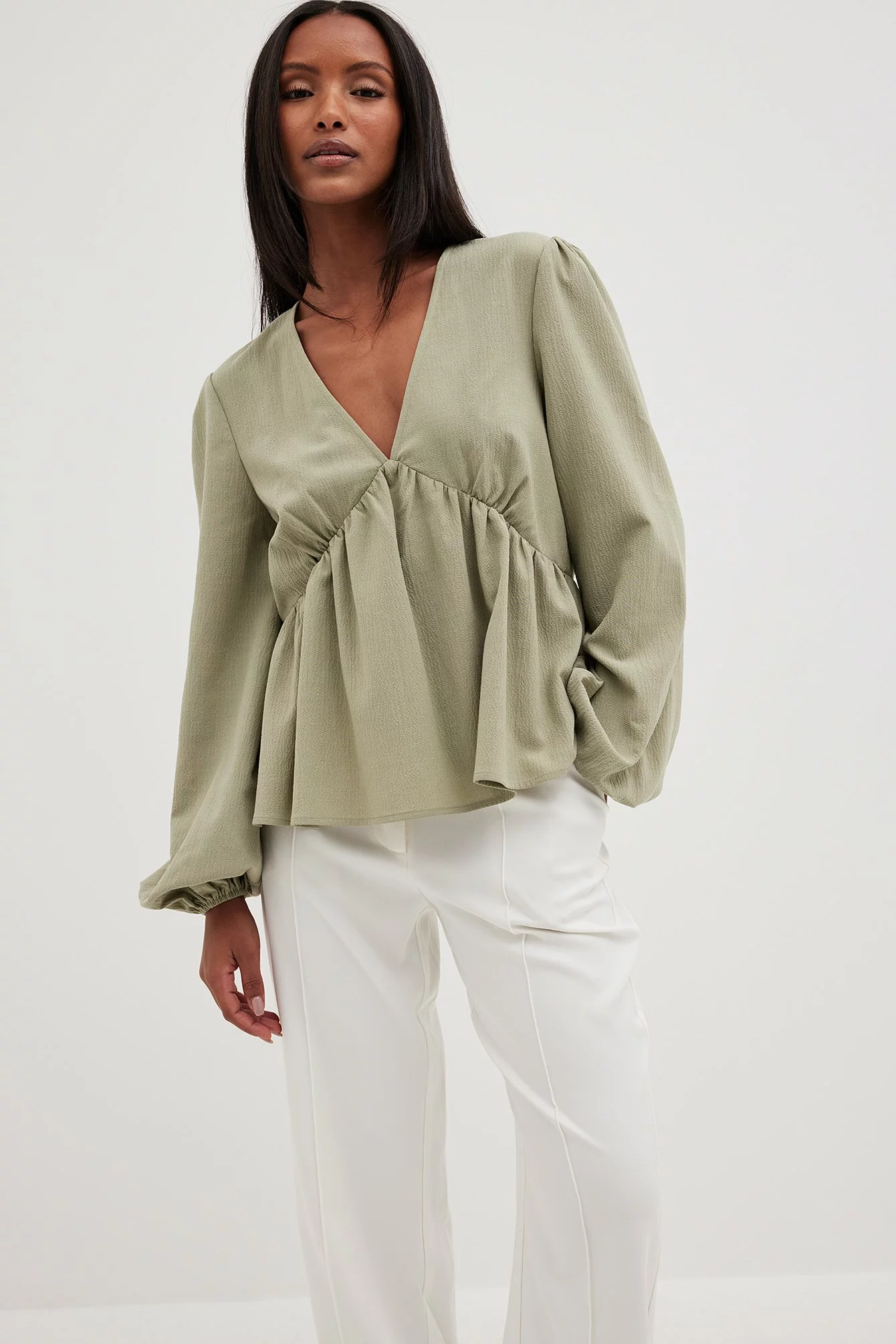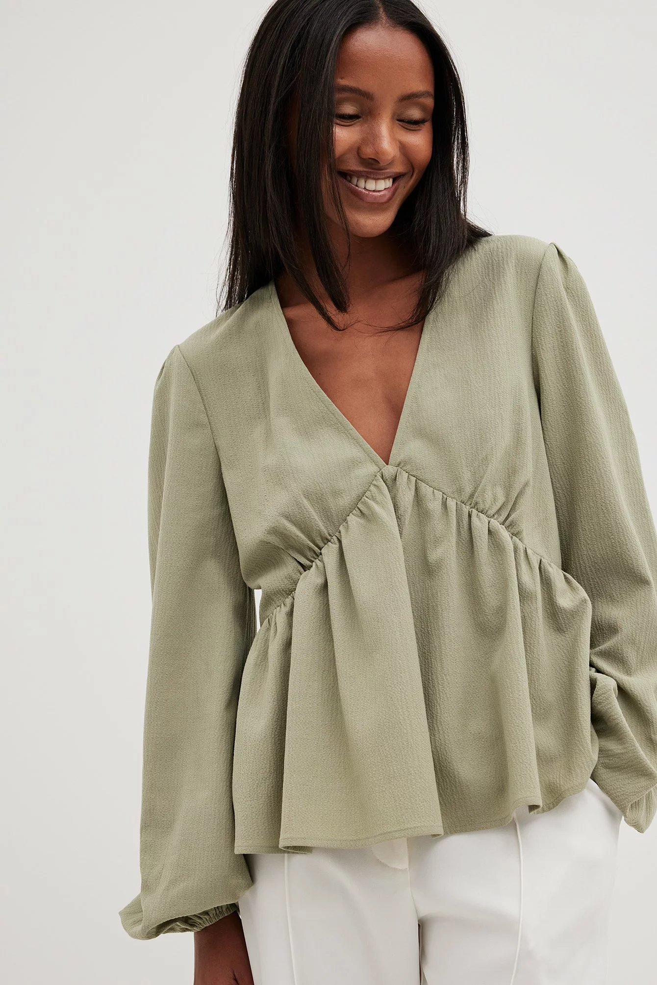 This blouse features a deep v neckline. It has a balloon sleeve and elasticized cuffs. This blouse features an elasticized, ruched waistband and a flowy bottom half.