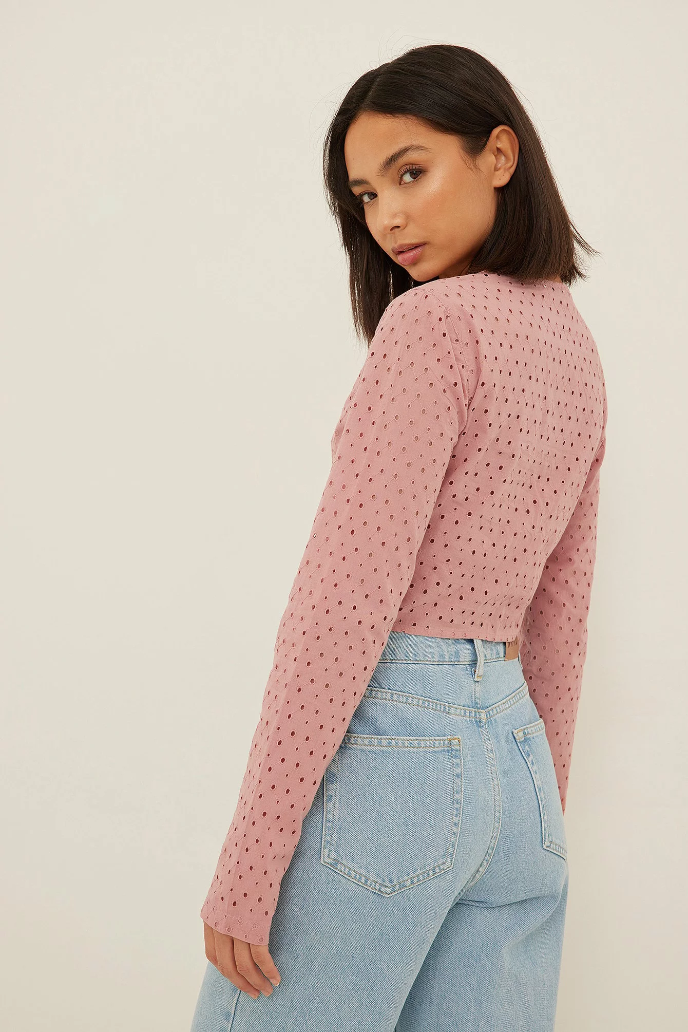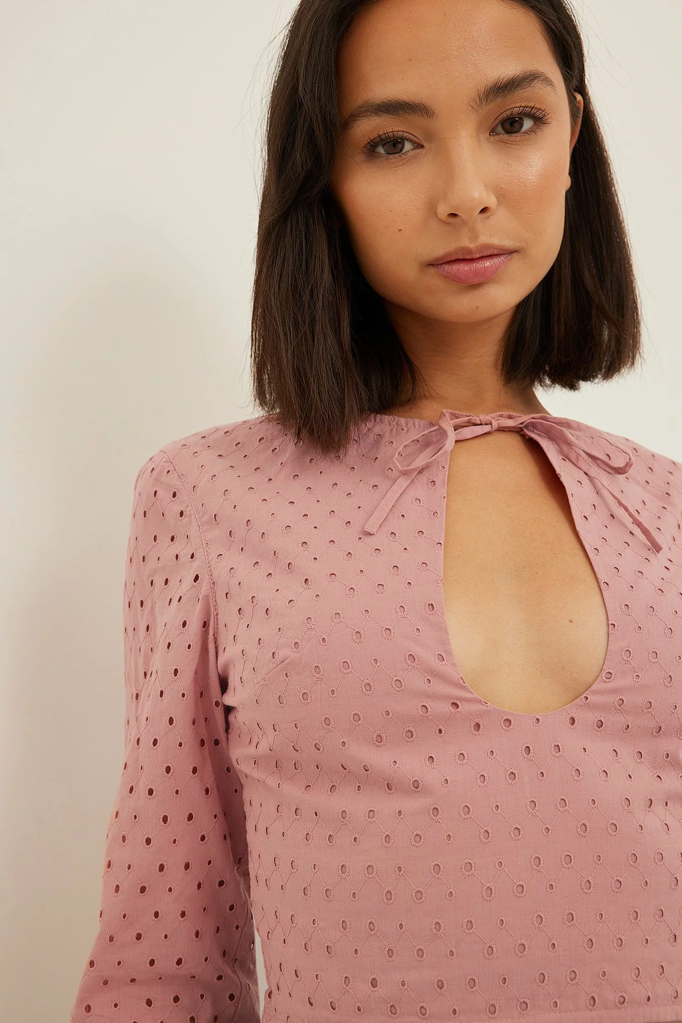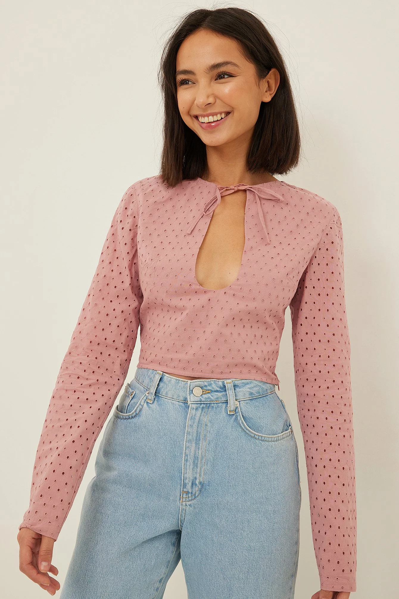 This blouse features a round neckline with a self-tie knot on the front. It has a keyhole cutout and seethrough long sleeves. This blouse features a seethrough back, cropped length and a side zipper closure.