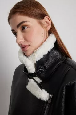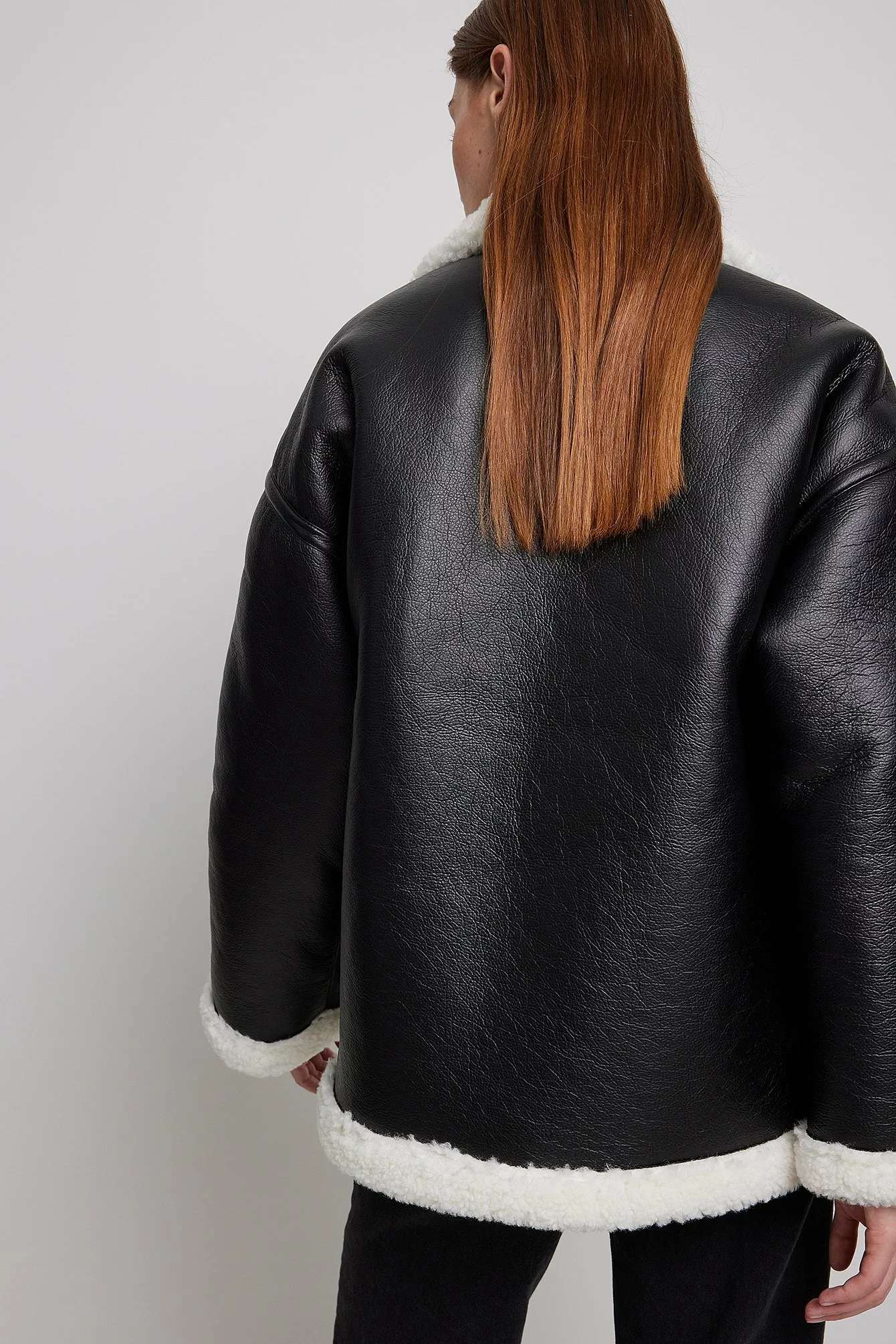 This jacket is made of PU and features aviator style, a collar with a belt detail, long sleeves, a zipper closure, front pockets, teddy details and a teddy lining.