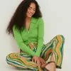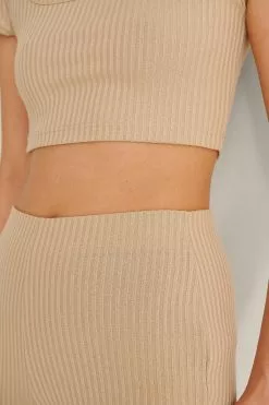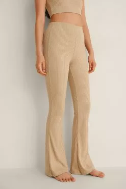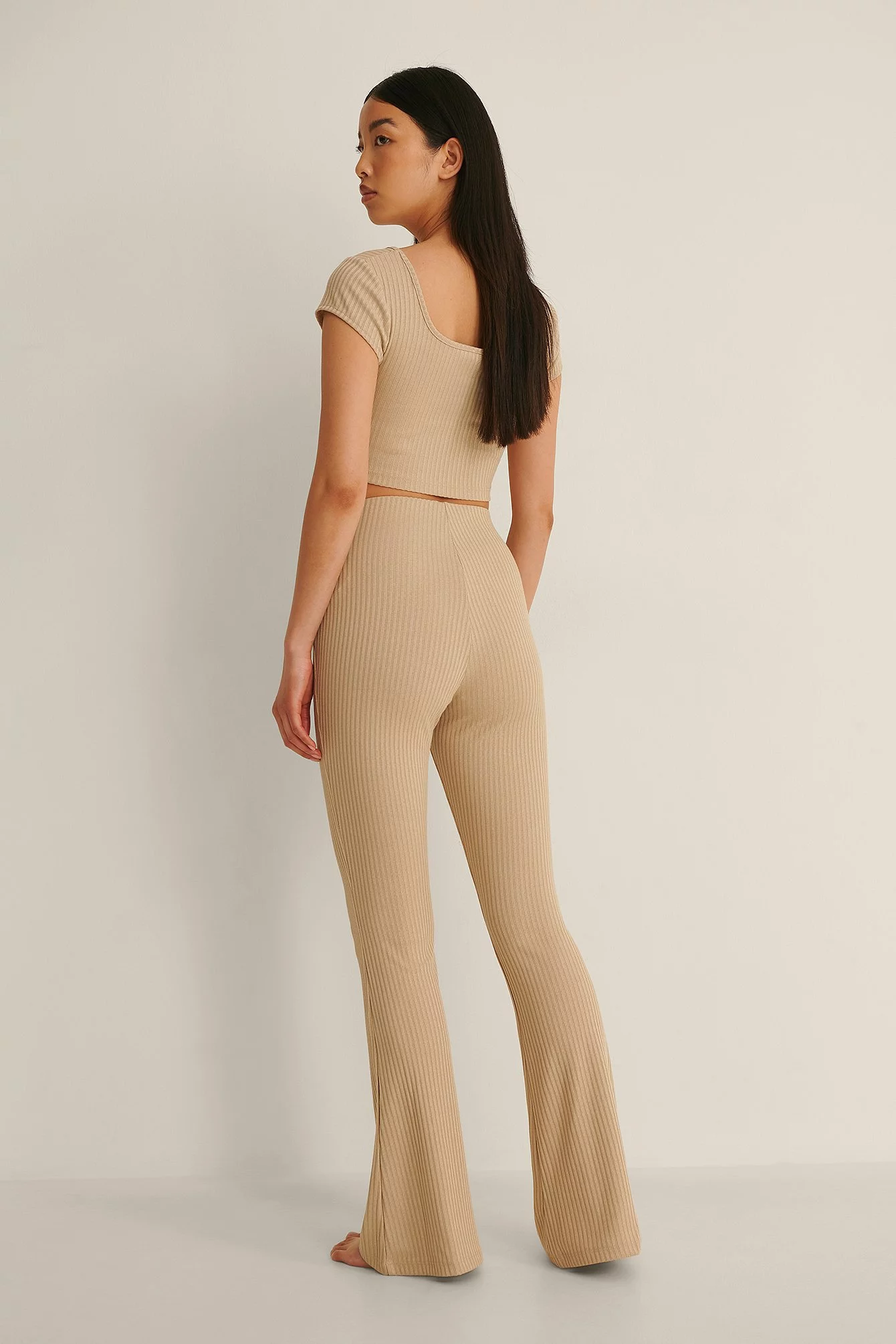 These pants feature an elasticized high waist, a boot cut style and a ribbed material.