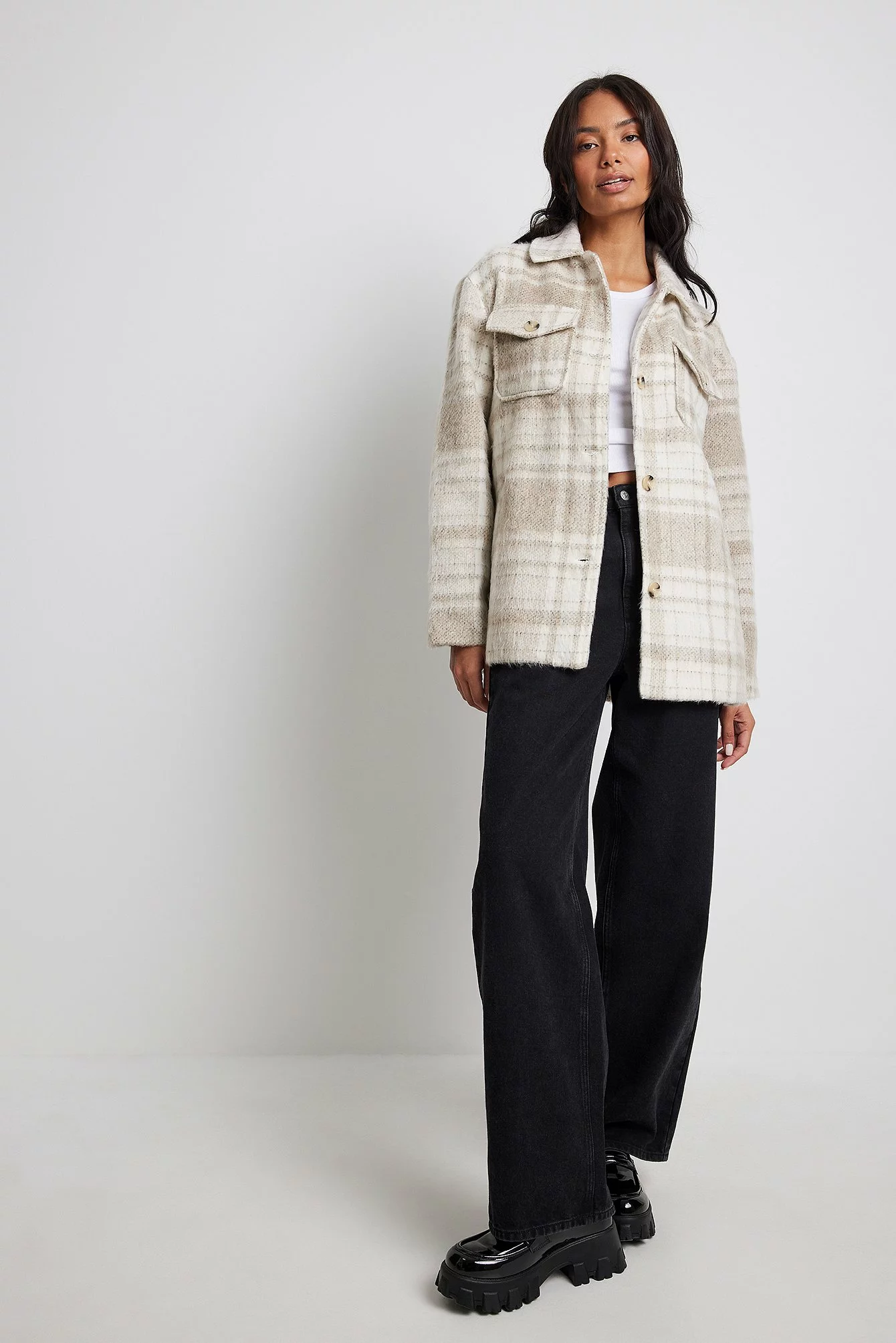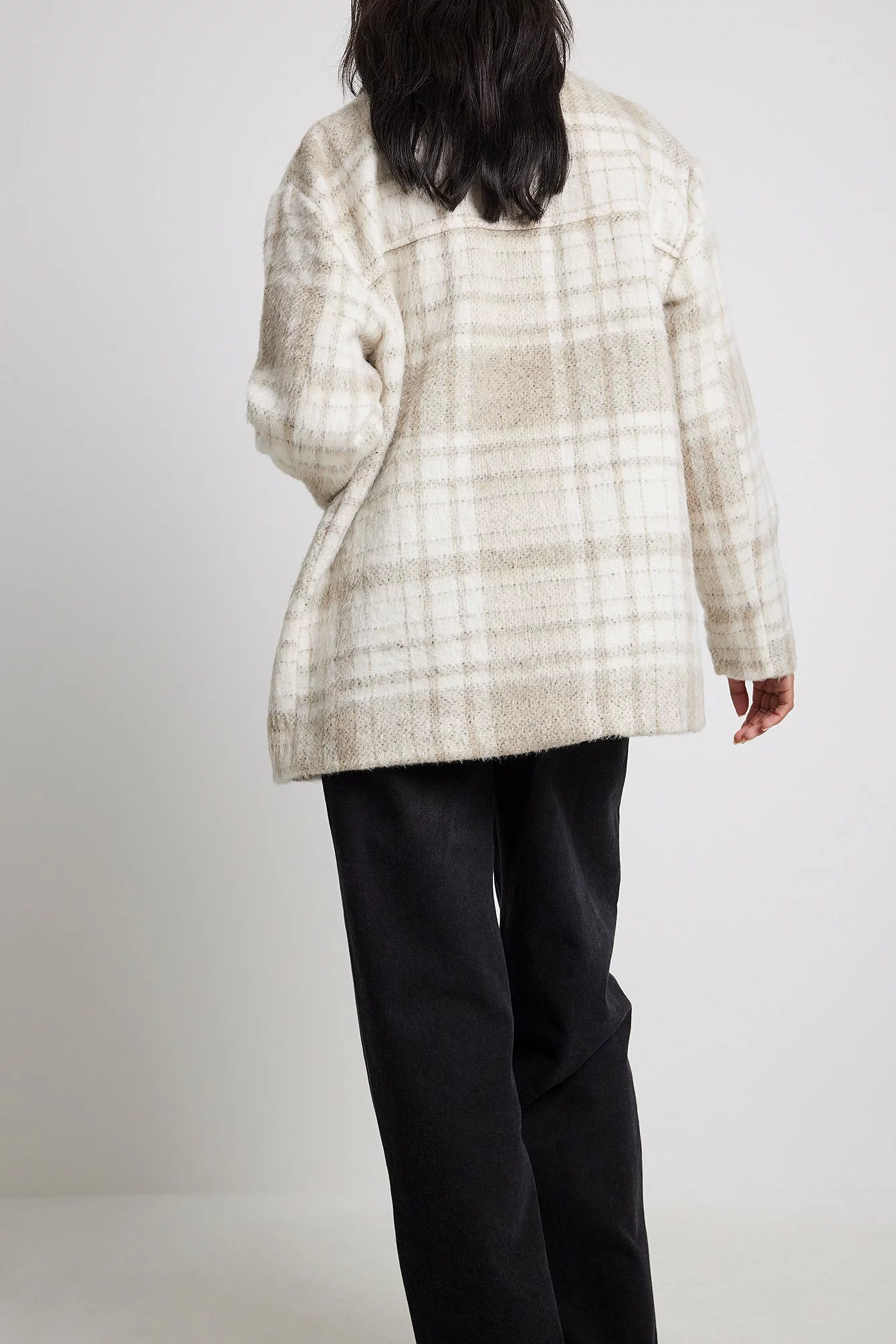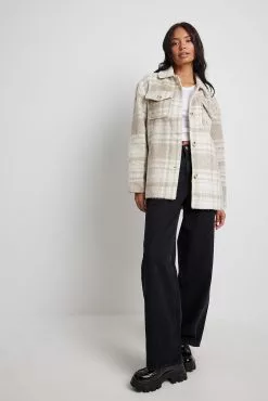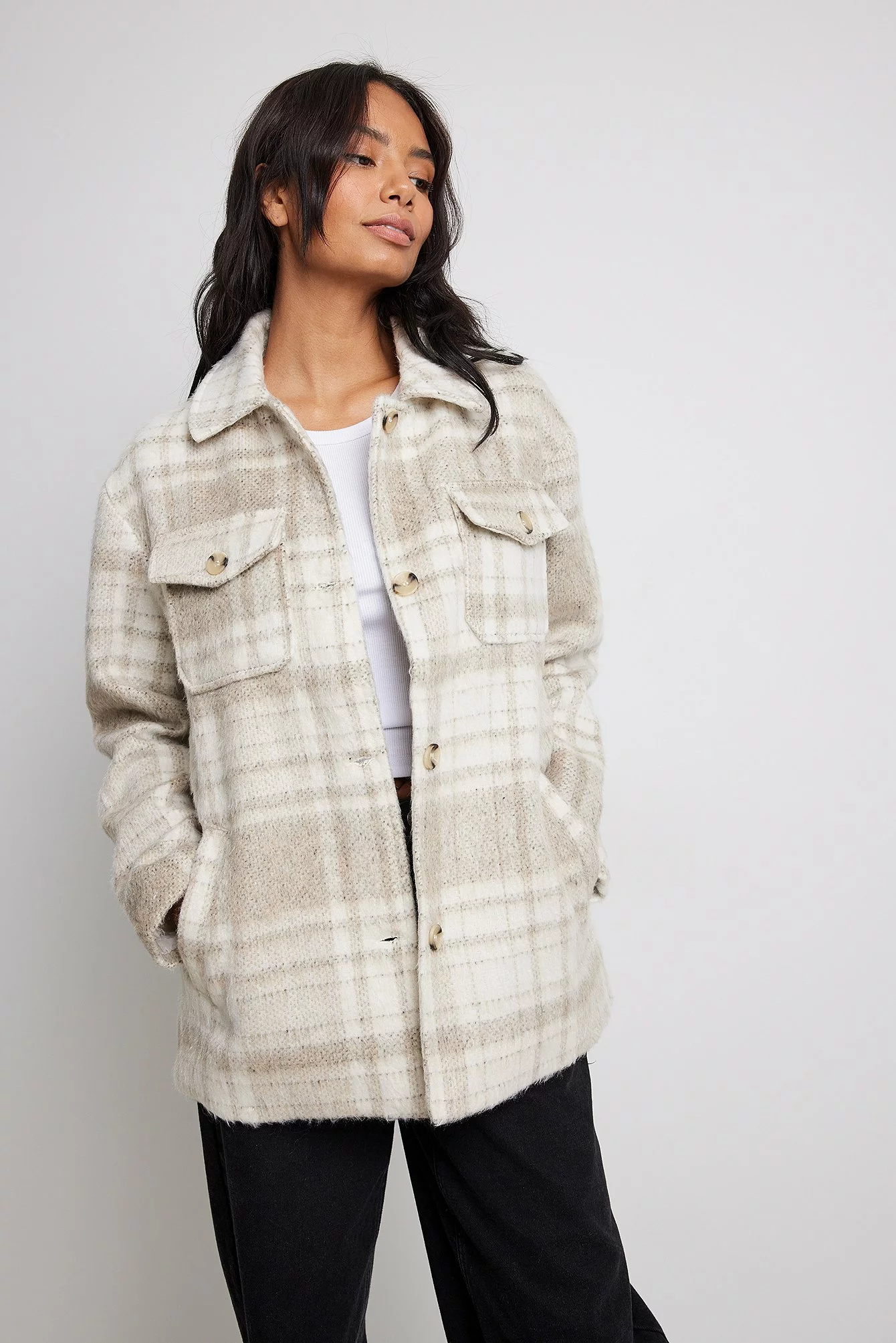 This jacket features a classic collar, two chest pockets with button closures, a button closure down the front, slightly dropped shoulders, an oversized fit, a fuzzy material and a lining.