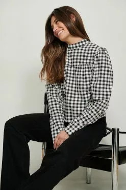 This blouse features a high neck with a button closure on the back. It has puffy long sleeves and a seam detail on the chest and on the back. This blouse features a crisp material.