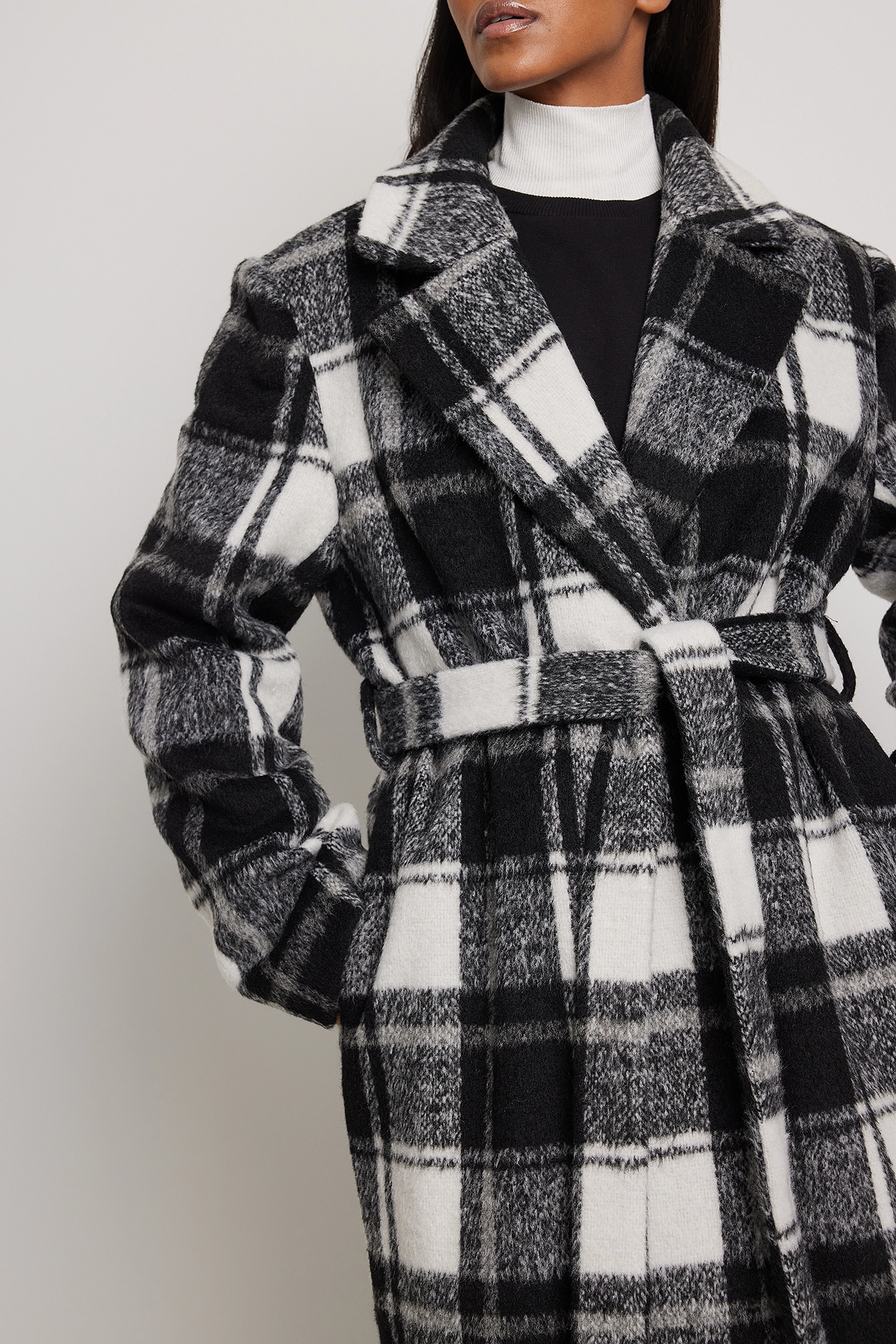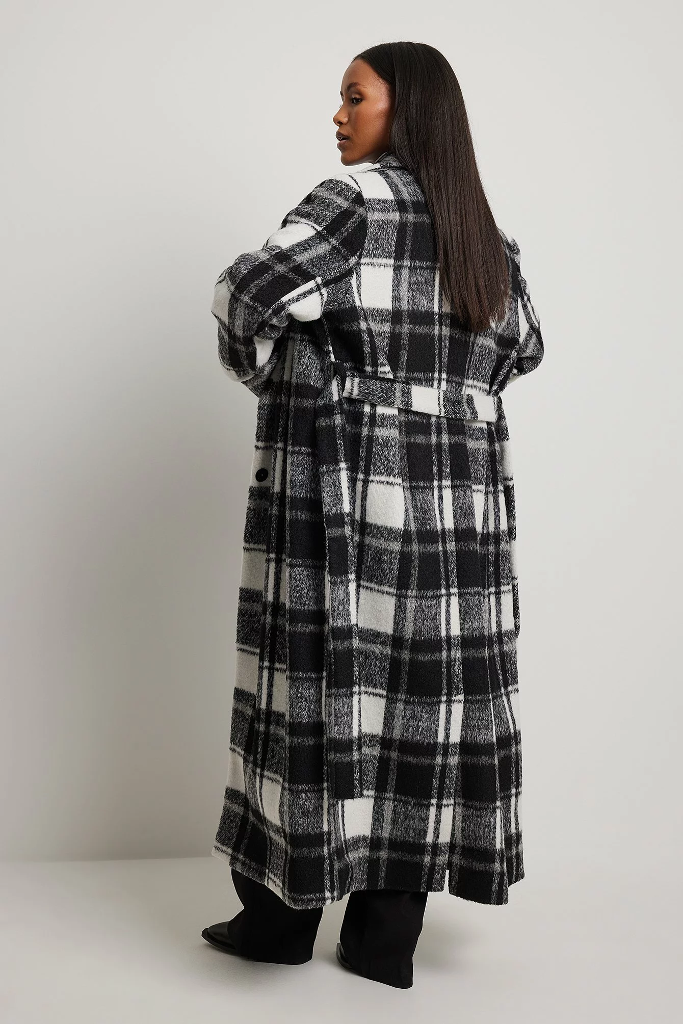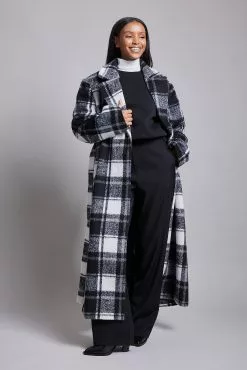 This coat is long and belted and features an overlap style with a snap button closure. It is checked and has side pockets and a back slit detail.