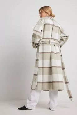 This coat features a lapel neckline, long sleeves with button cuffs on the ends, a button closure down the front, two front flap pockets, belt loops at the waist with a removable self-tie band, a long, oversized fit and a lining.
