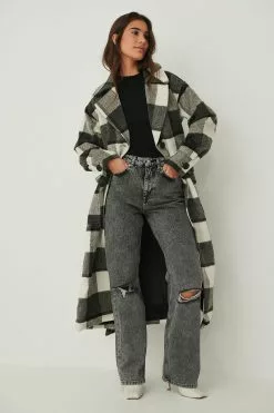 This coat features a lapel neckline, long sleeves with button cuffs on the ends, a button closure down the front, two front flap pockets, belt loops at the waist with a removable self-tie band, a long, oversized fit and a lining.