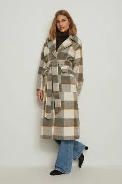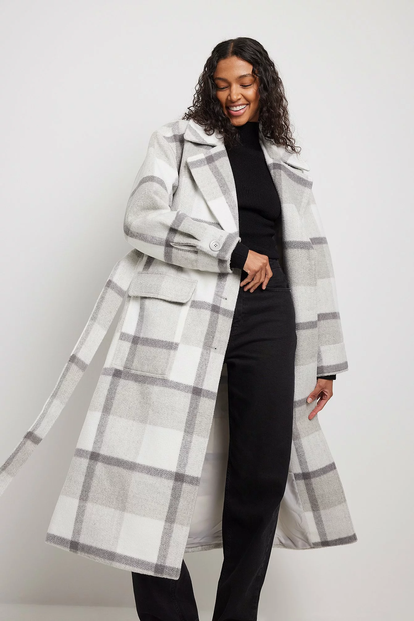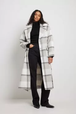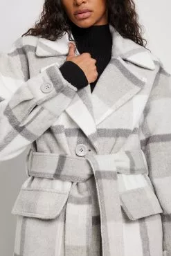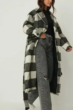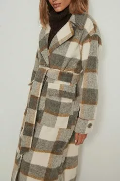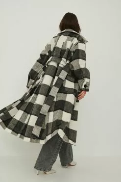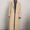 This coat features a lapel neckline, long sleeves with button cuffs on the ends, a button closure down the front, two front flap pockets, belt loops at the waist with a removable self-tie band, a long, oversized fit and a lining.