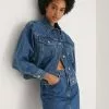 This denim shirt features a classic collar. It has a button placket and chest pockets. This denim shirt features cropped length with a raw hem, an oversized fit and a rigid material.