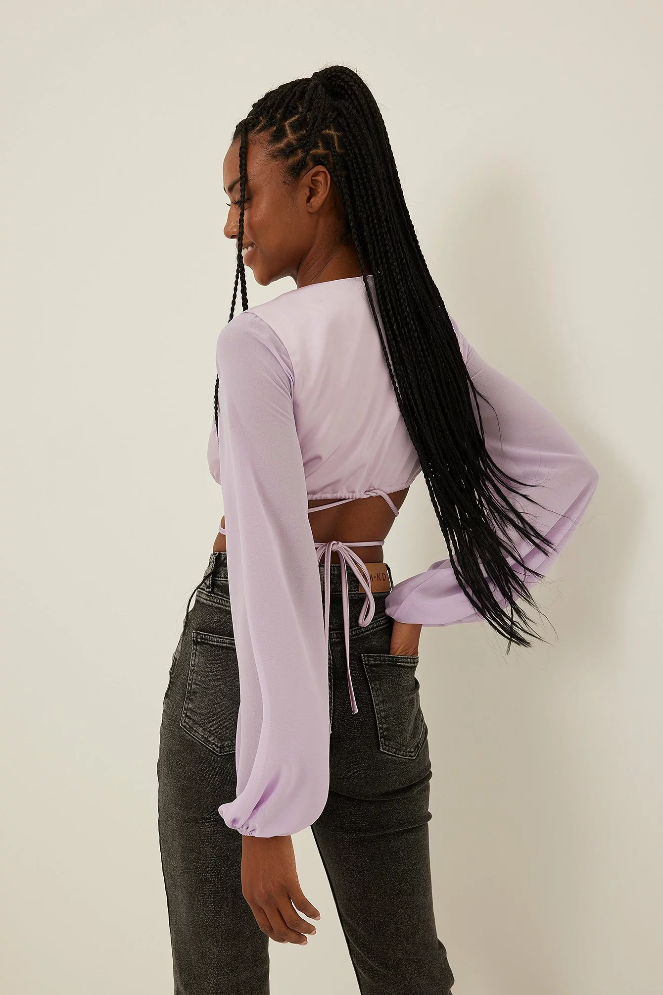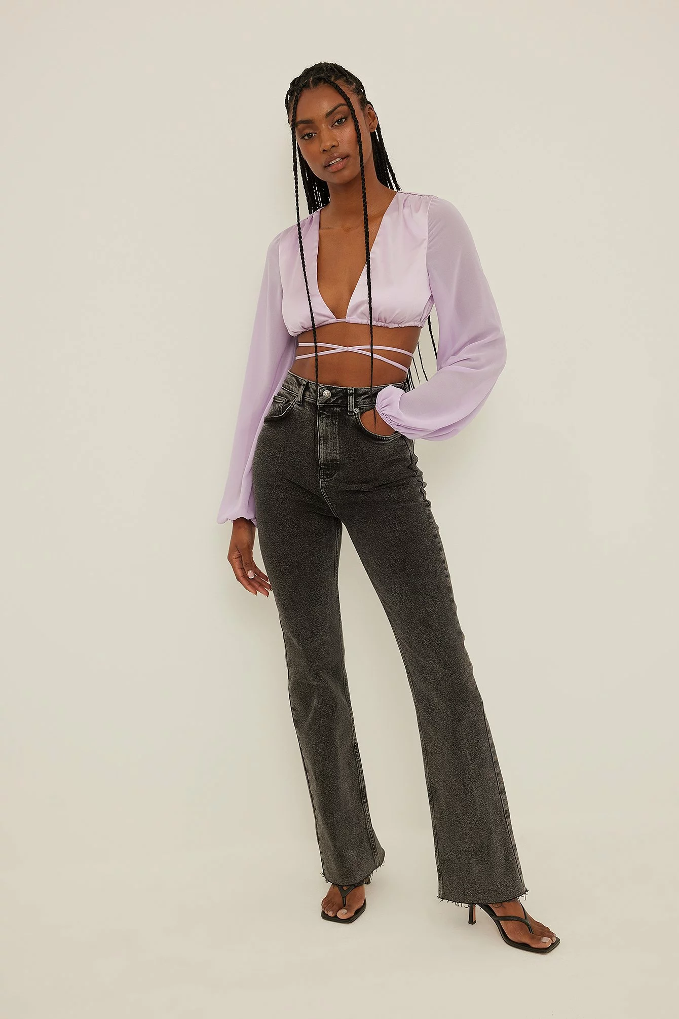 This blouse features a deep v neckline, an adjustable drawstring at the waist with a self-tie knot and seethrough balloon sleeves in chiffon.