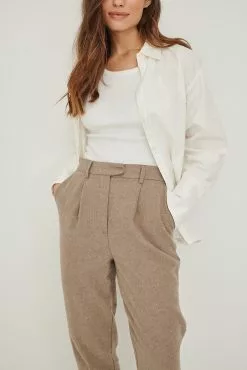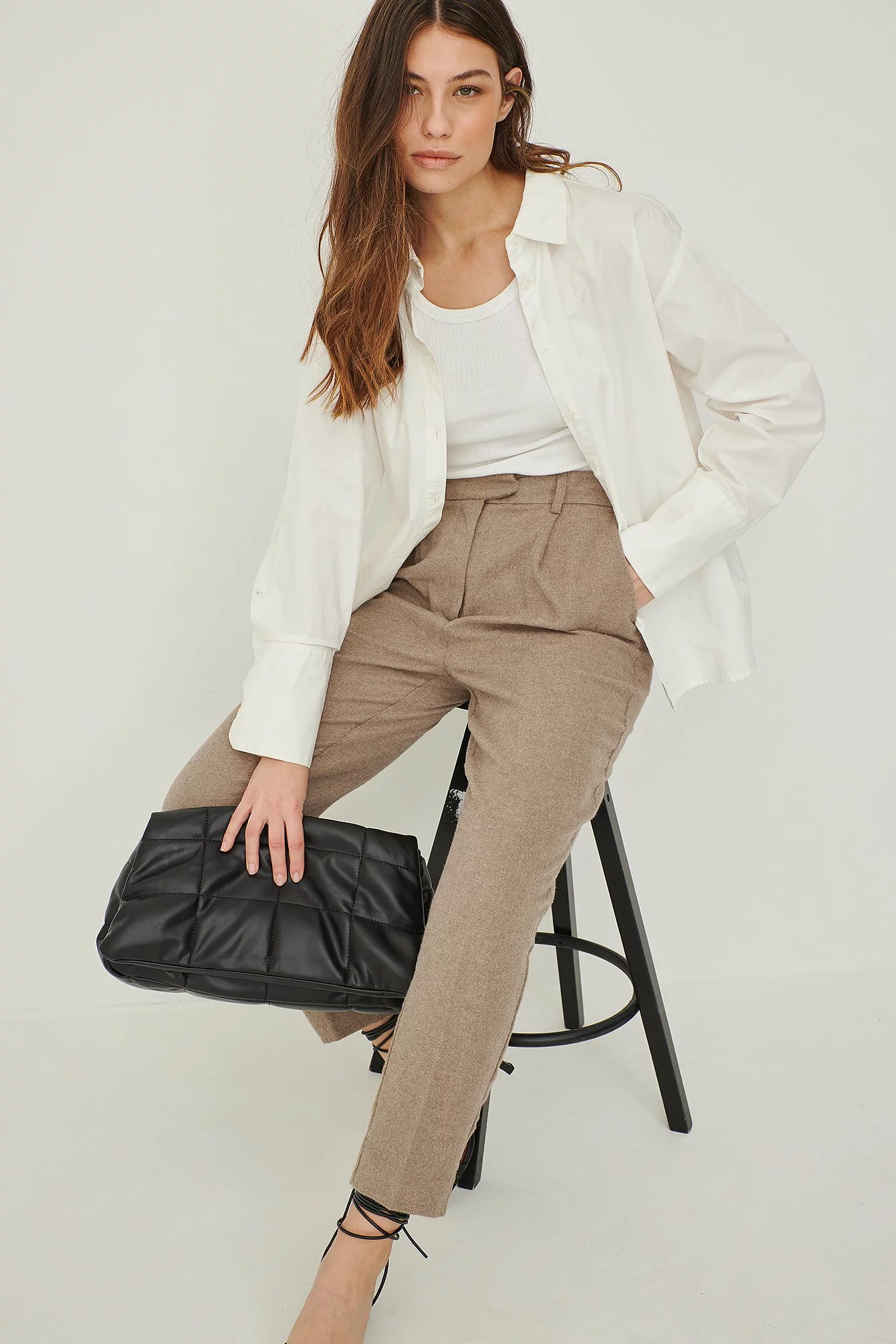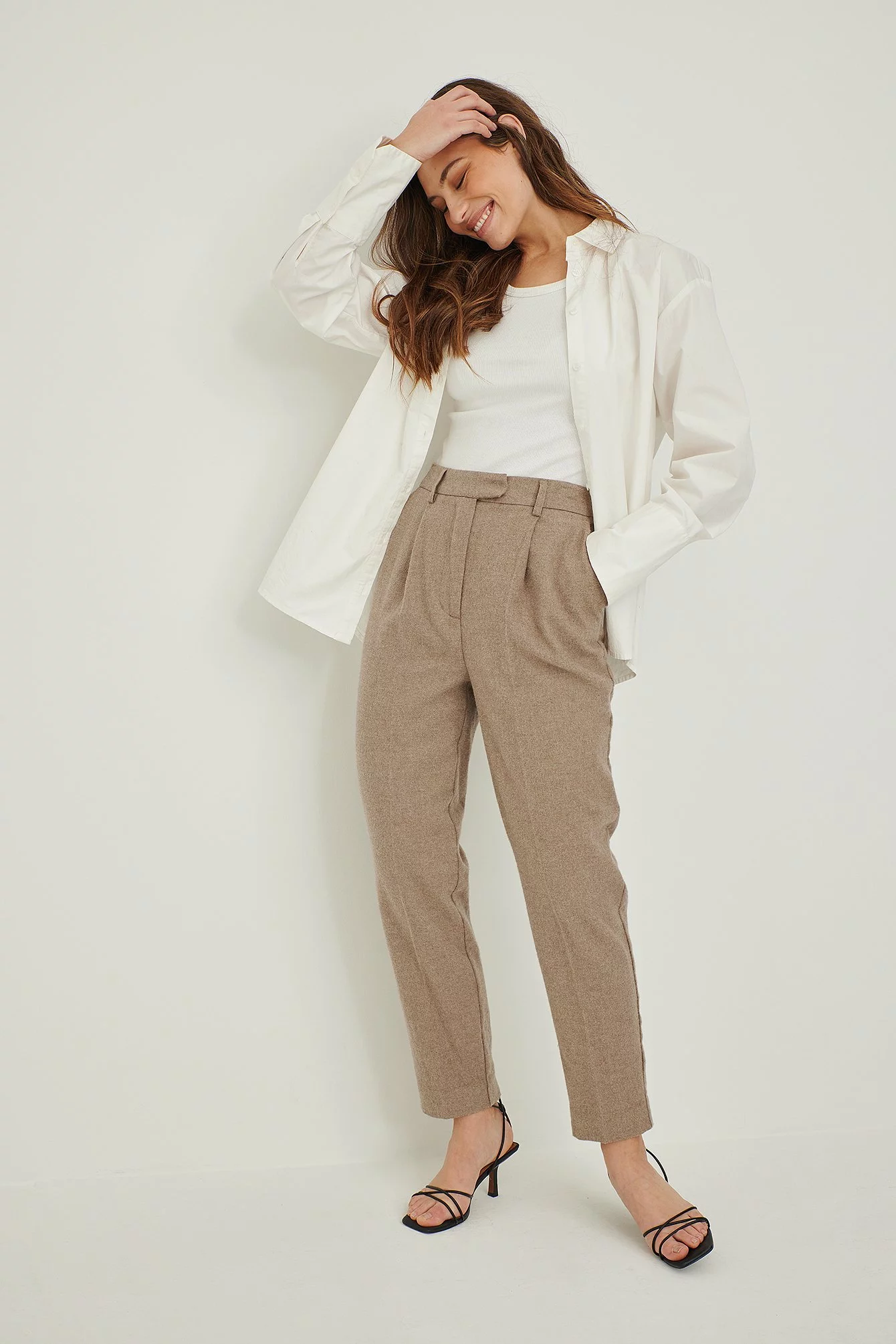 These suit pants feature a high waist, side slanting pockets, back mock pockets, a zipper, hook and button closure, belt loops, a straight leg, ankle length and a soft material in flannel.