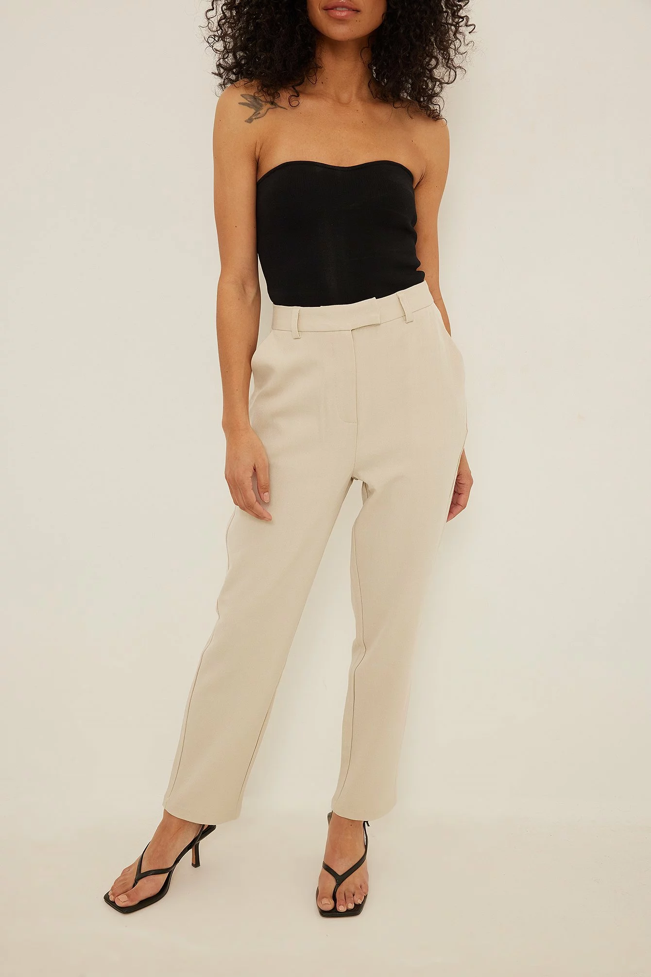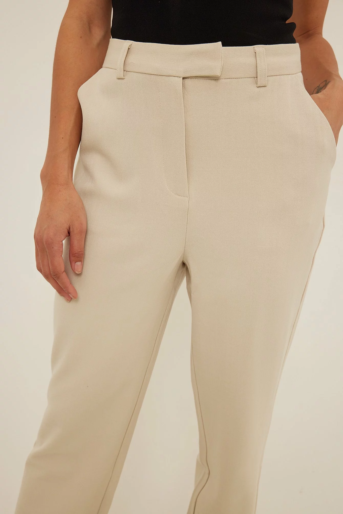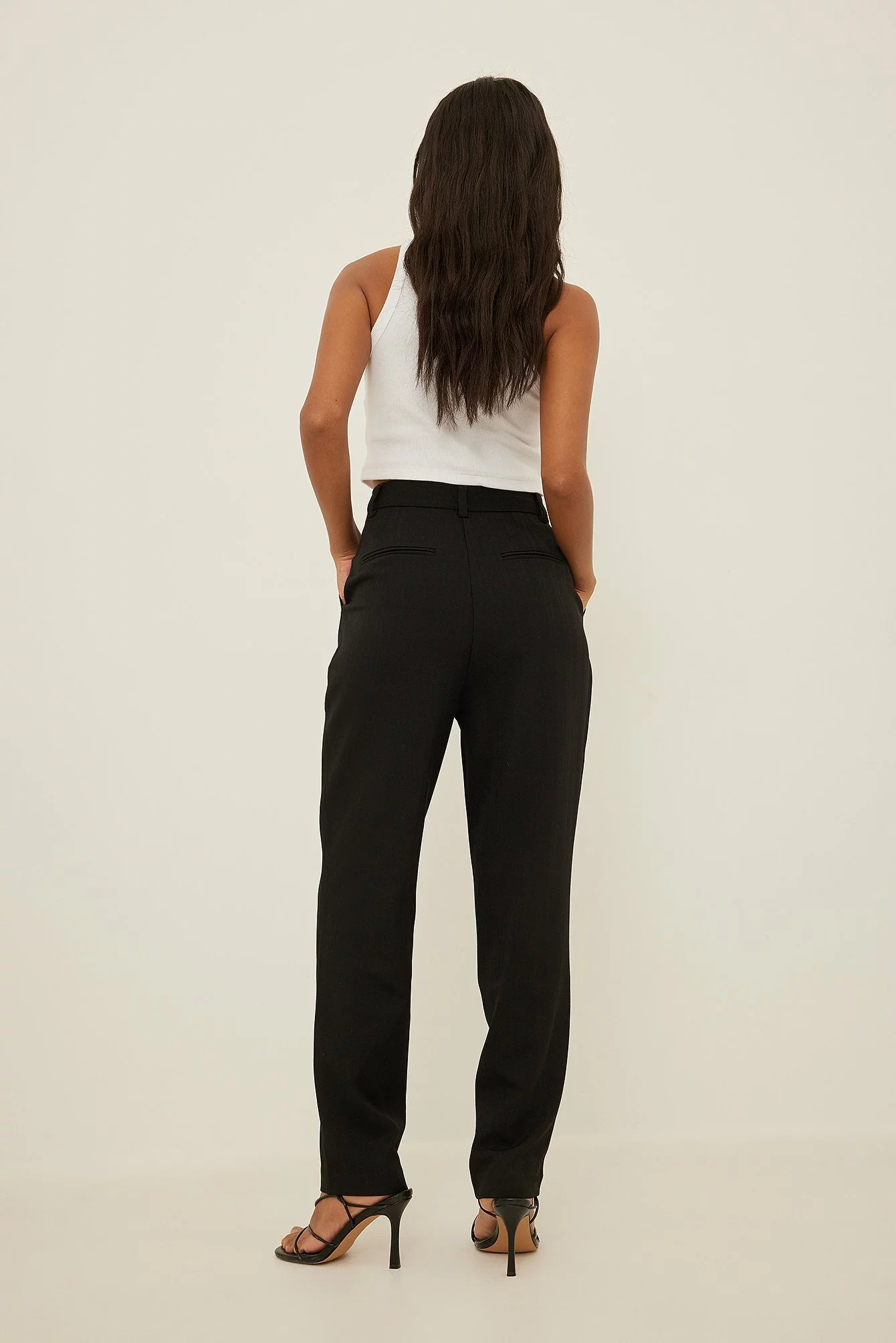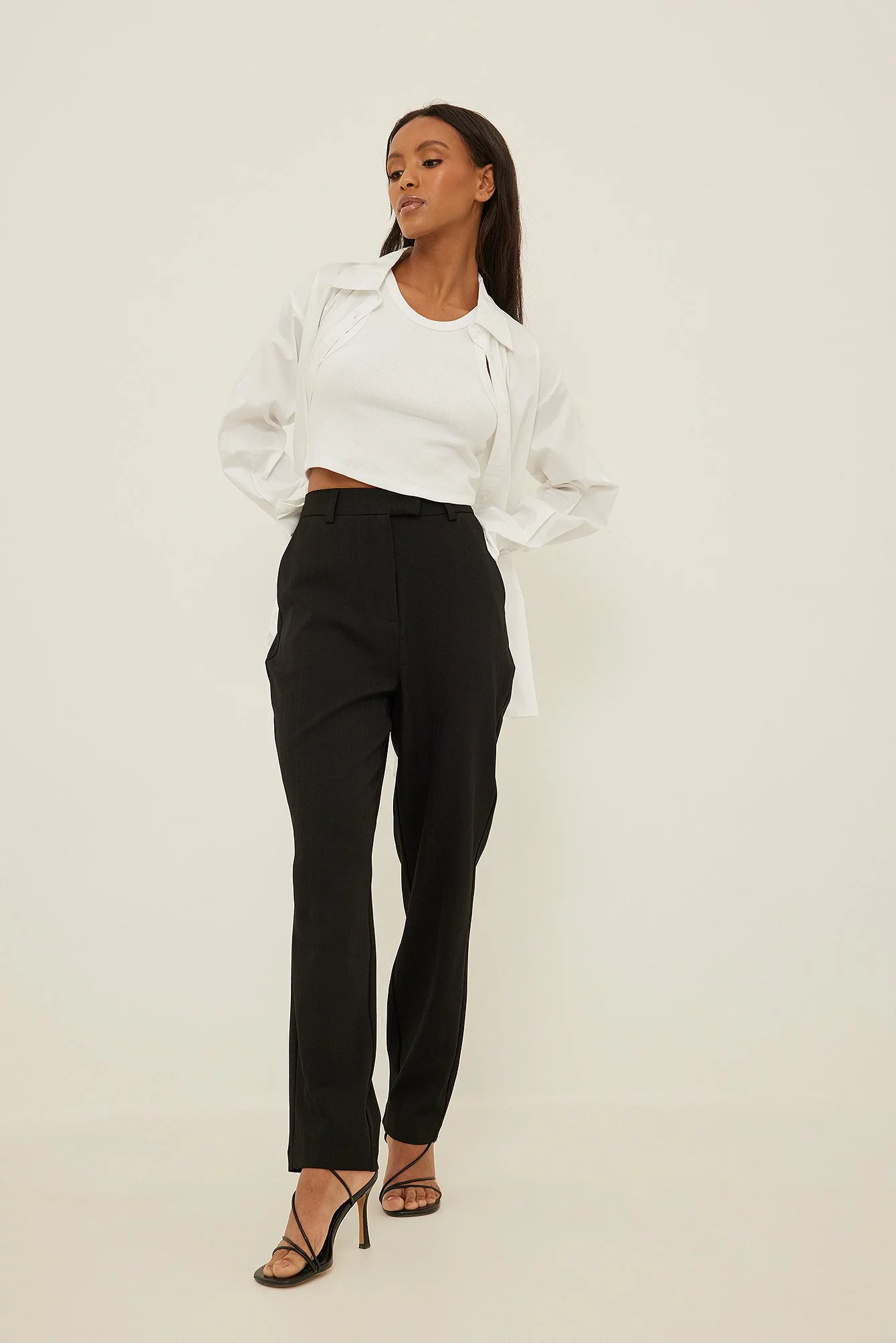 These suit pants feature a high waist with a belt loop and a zipper, hook and button closure, side pockets, cropped wide legs and back mock pockets.