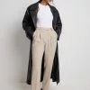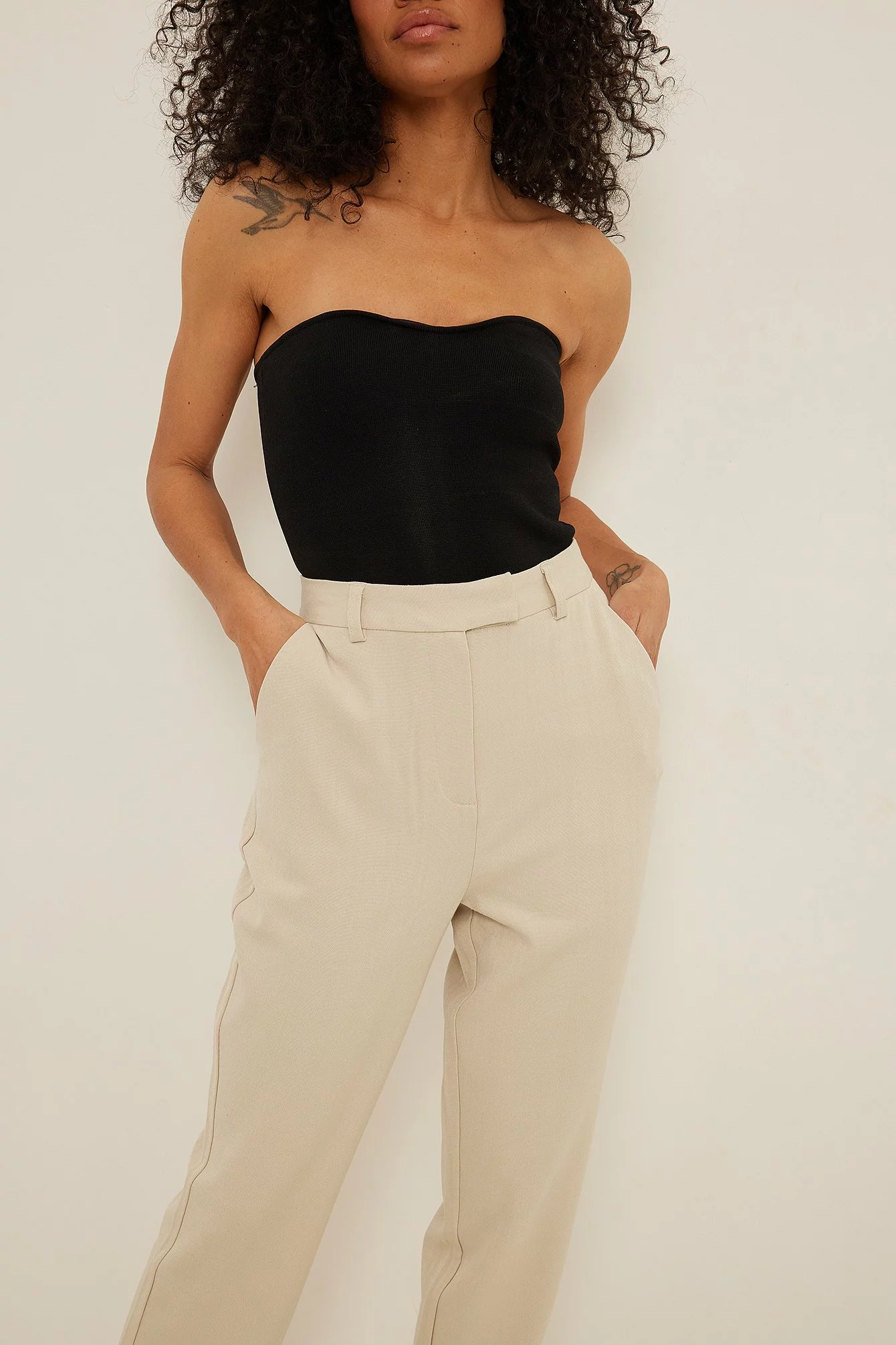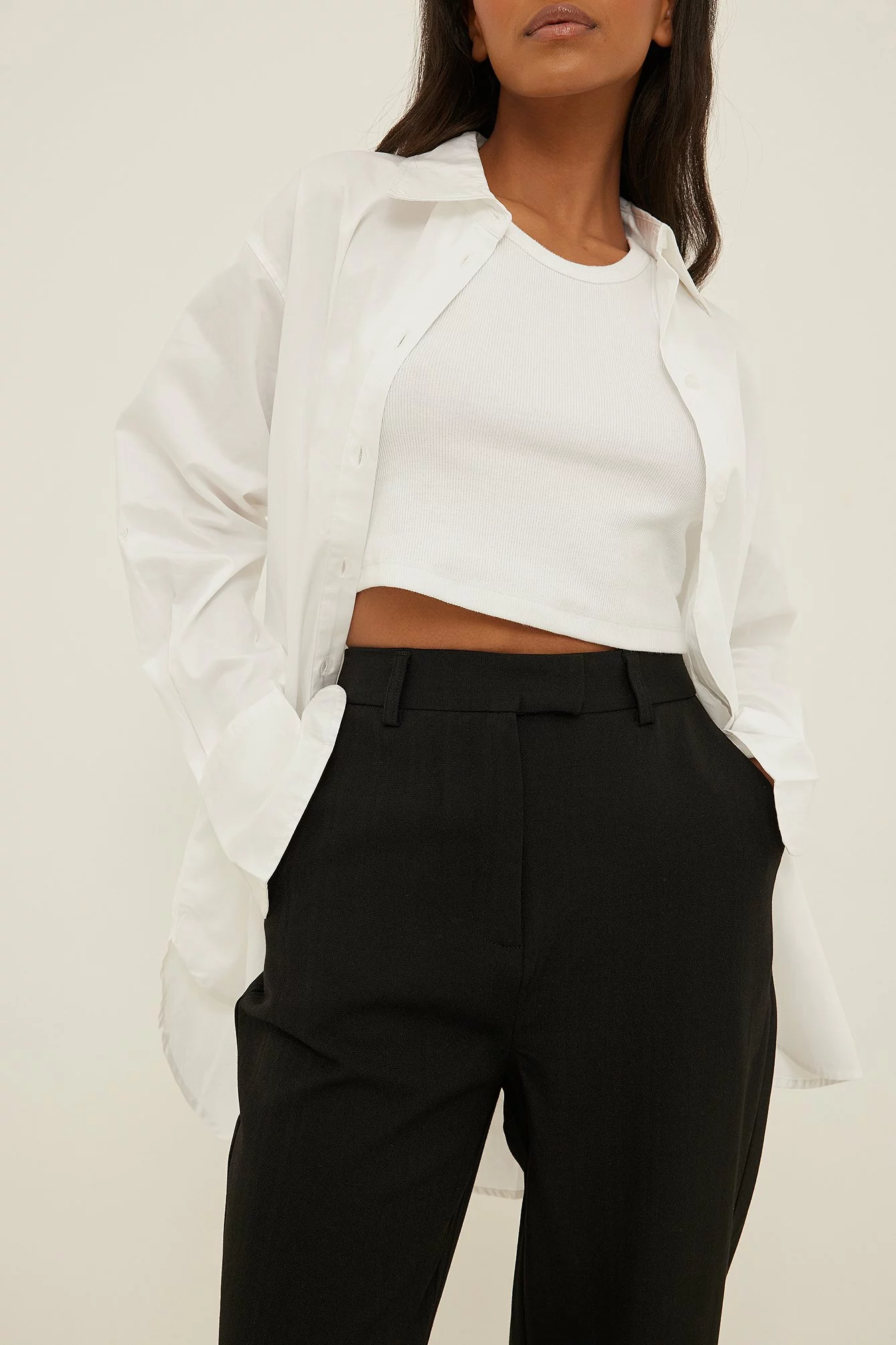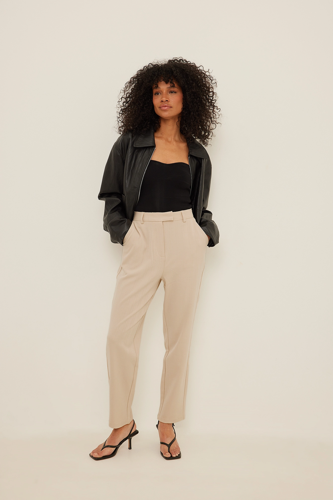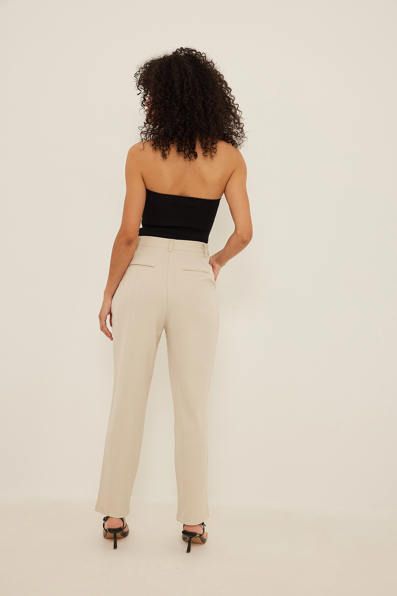These suit pants feature a high waist with a belt loop and a zipper, hook and button closure, side pockets, cropped wide legs and back mock pockets.