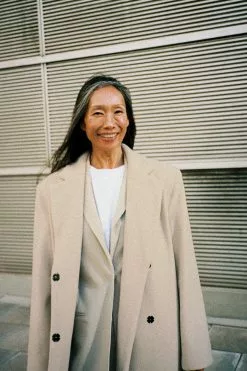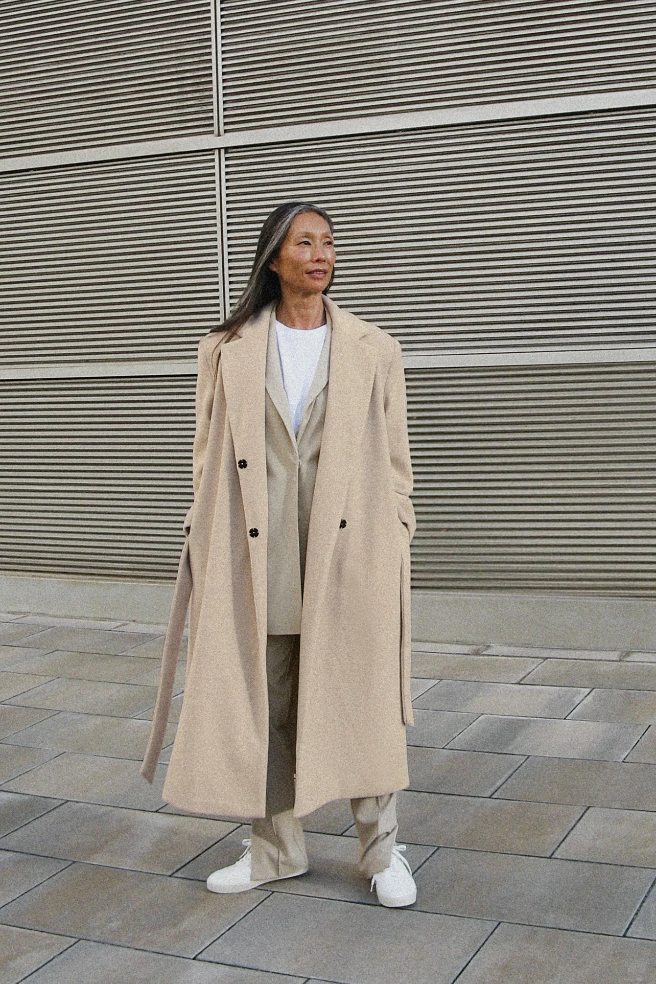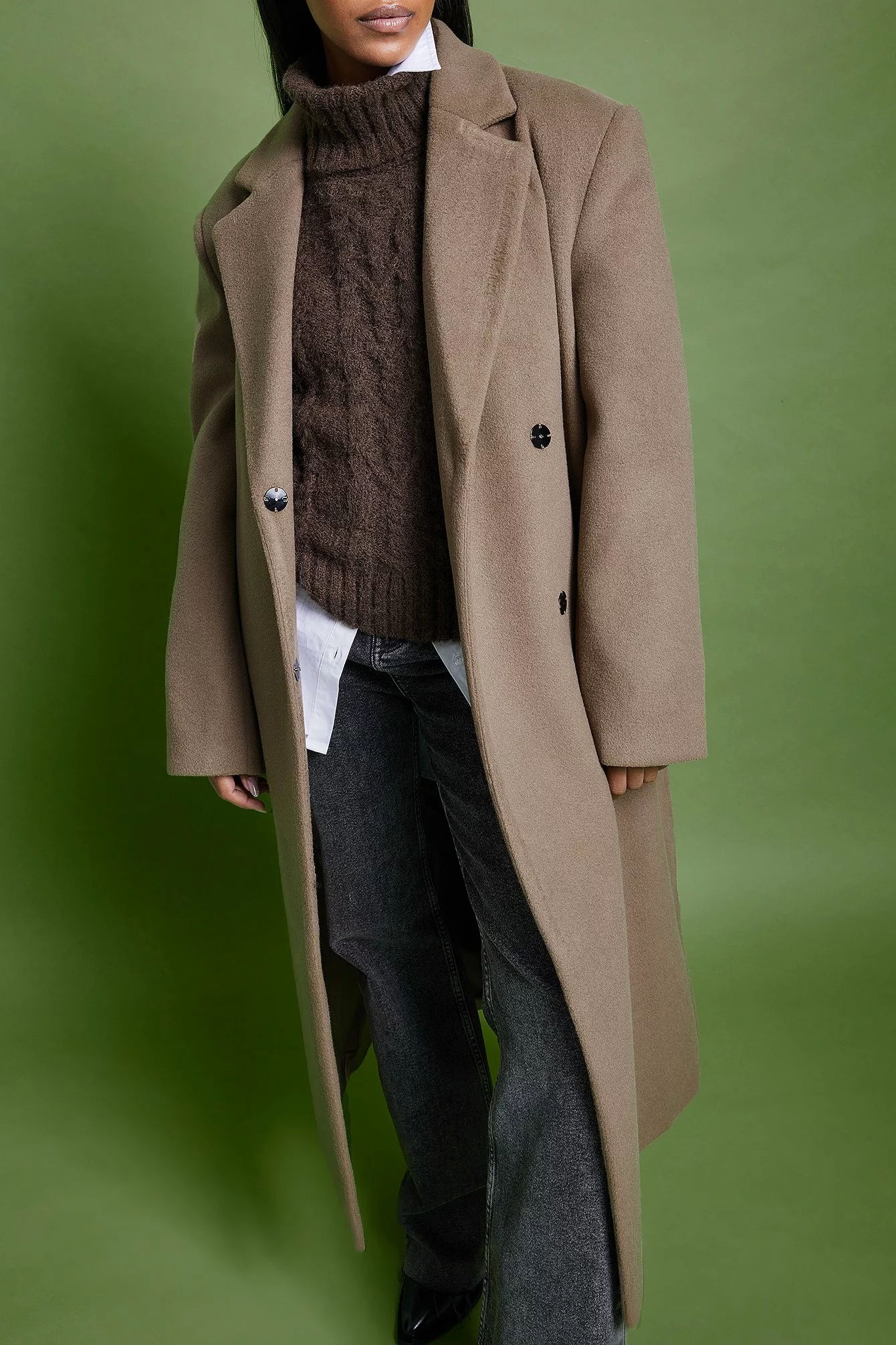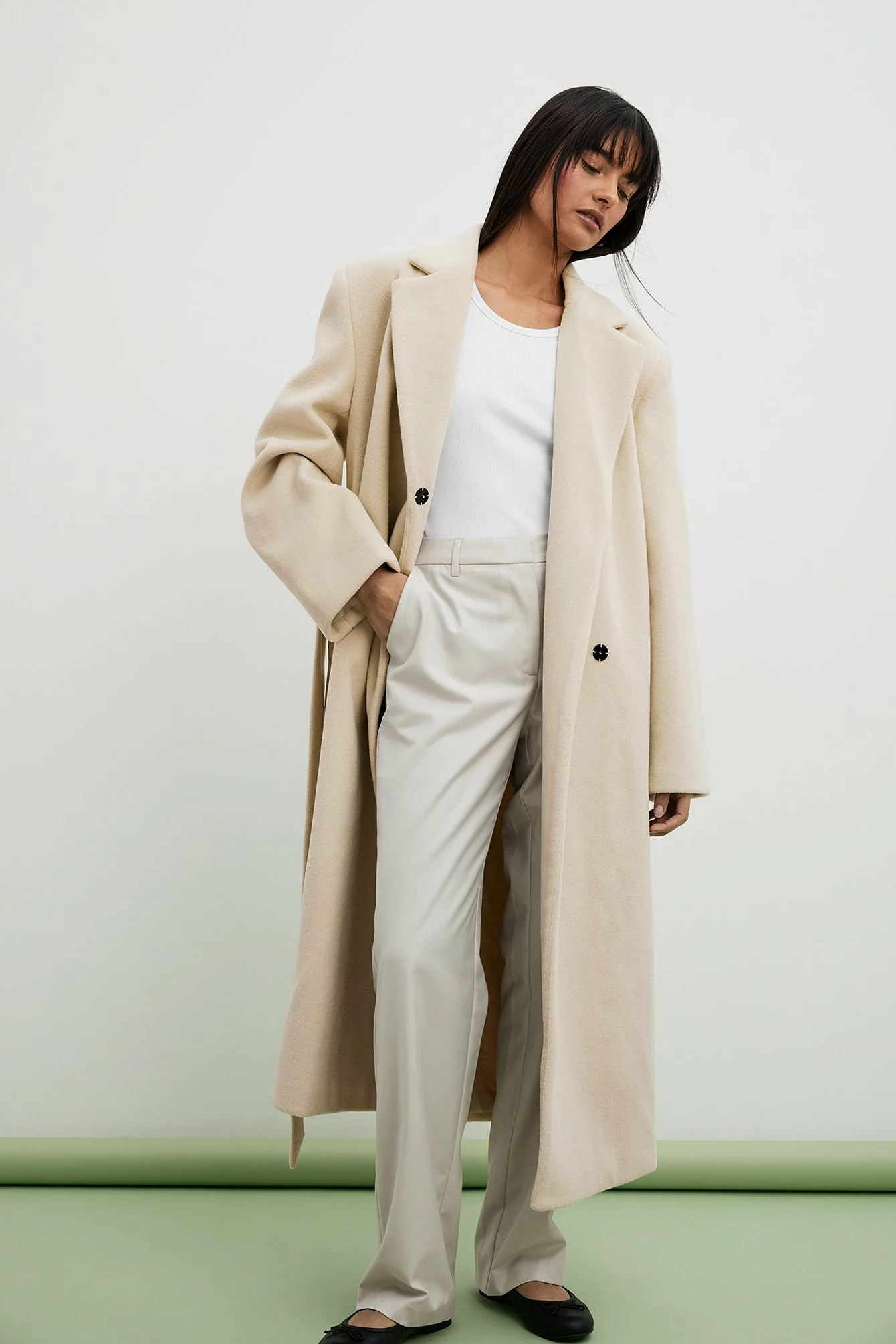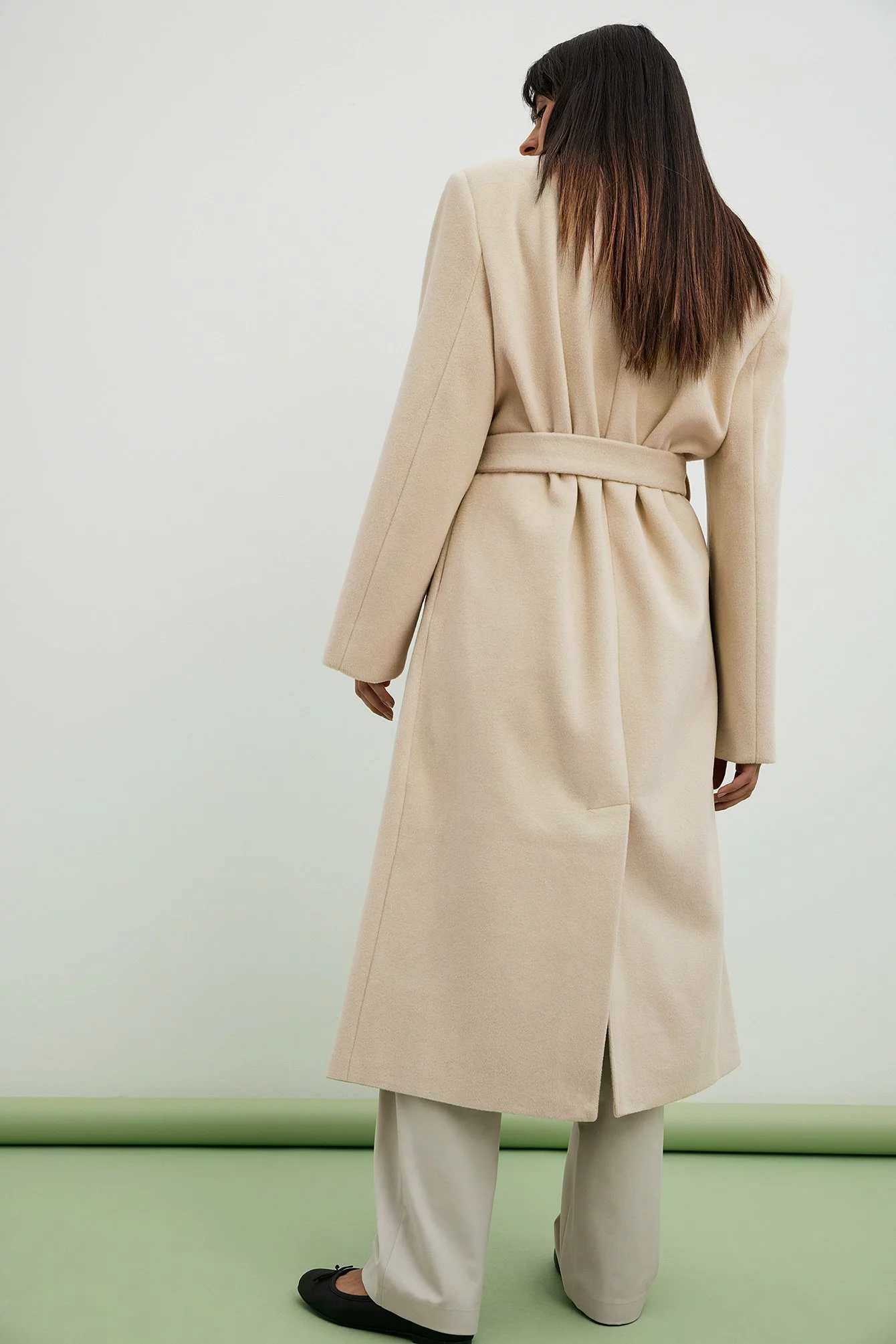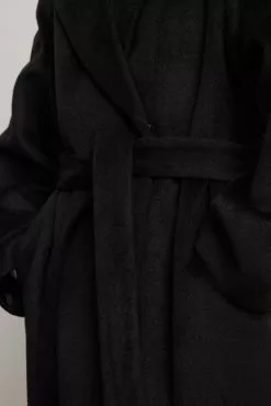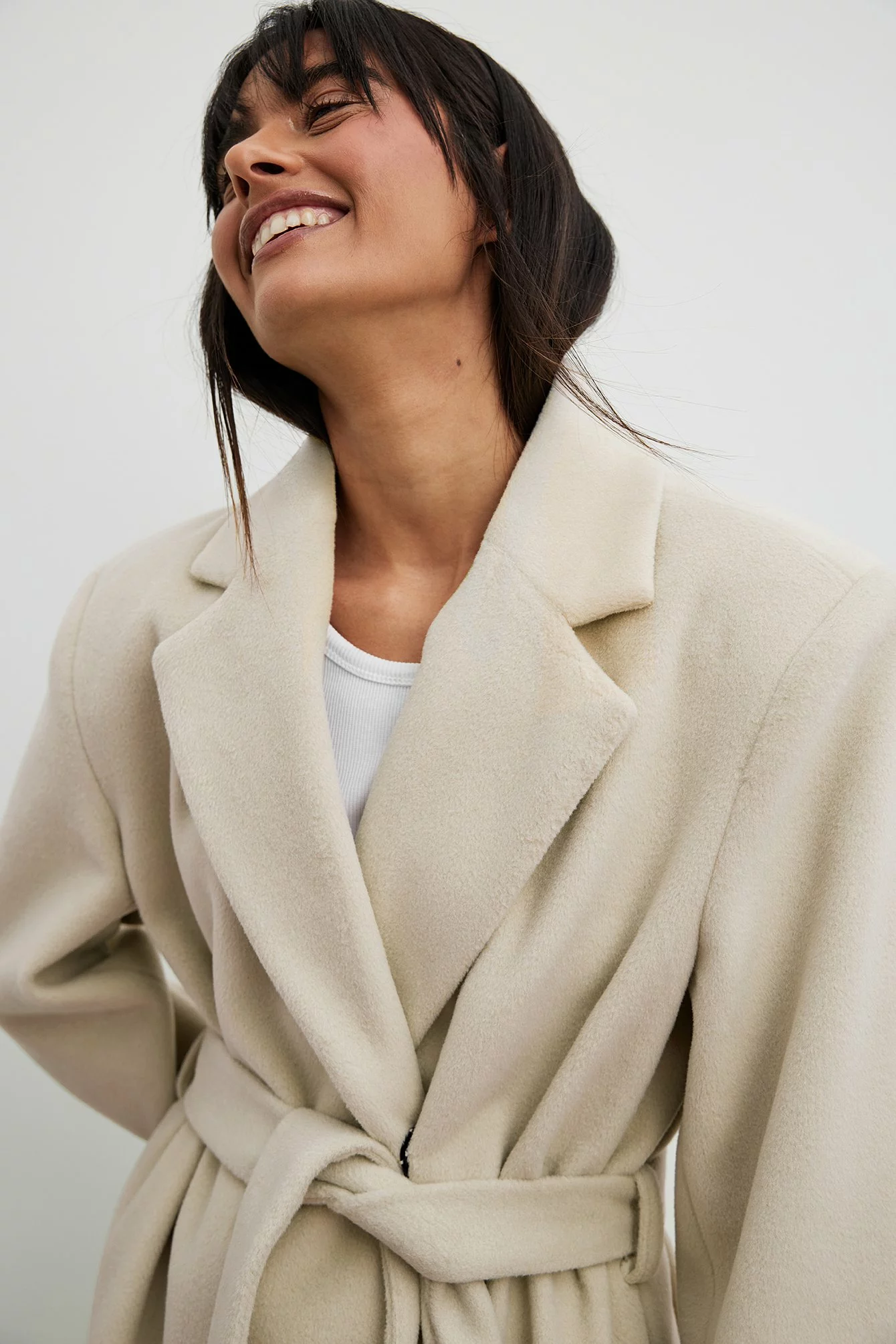 This coat is belted and features a lapel detail, a padded shoulder, an overlap design with a hidden snap button closure, side pockets and a back slit detail.