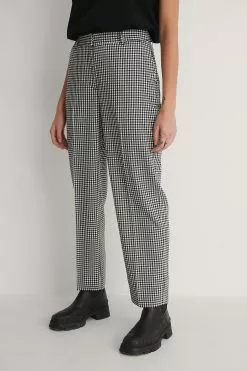 These pants feature a high waist, two side pockets, a zipper, hook and button closure, back mock pockets, cropped length, a straight leg and a checkered pattern.