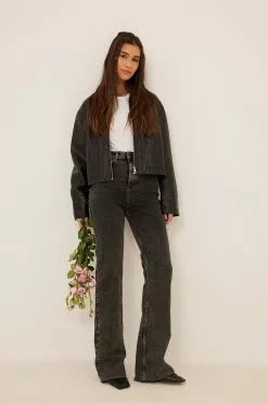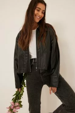 This jacket is thin, short and made of PU and features a classic collar, a zipper closure down the front, front pockets and long sleeves with double button cuffs.