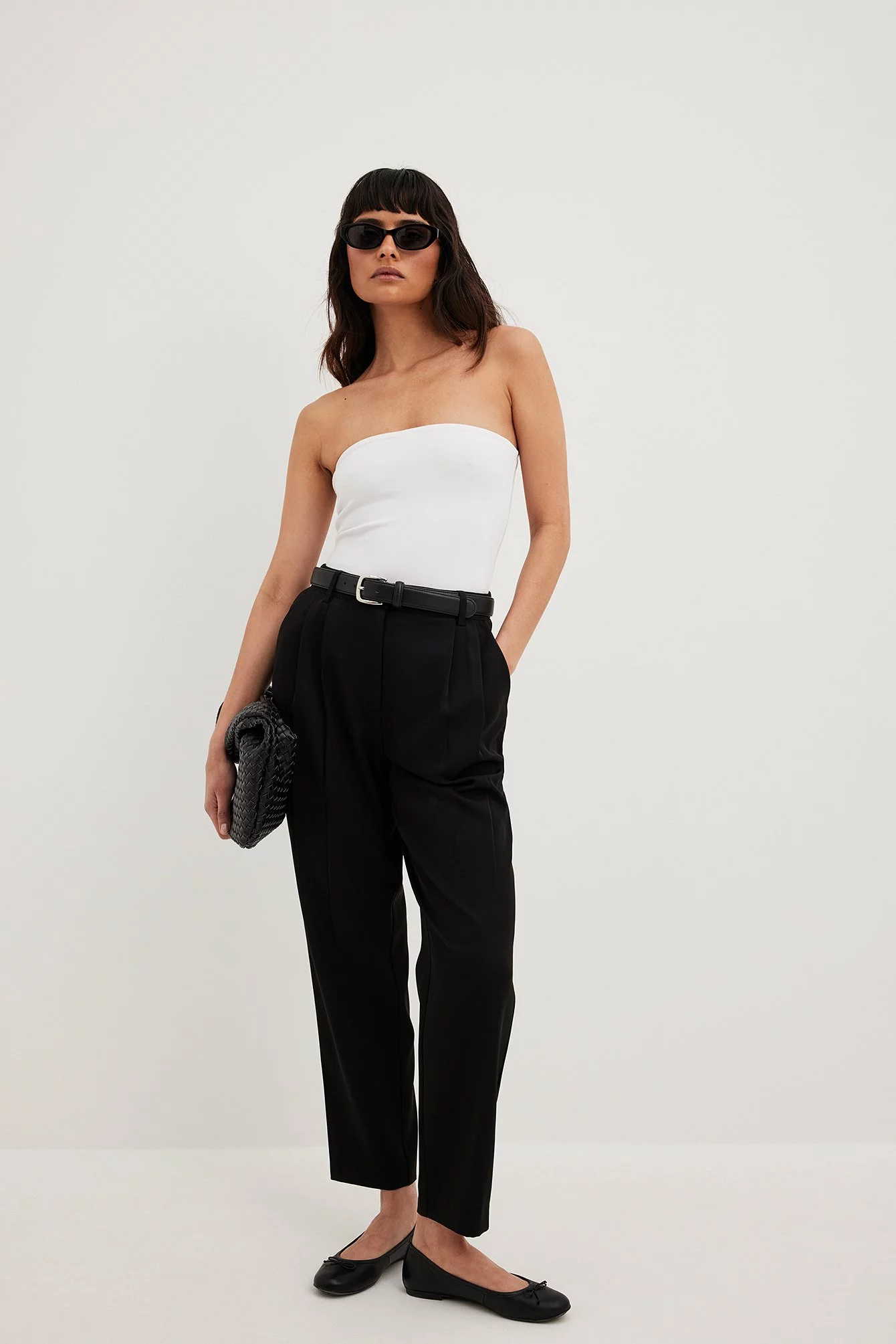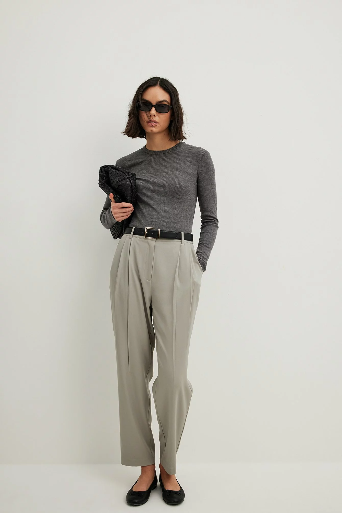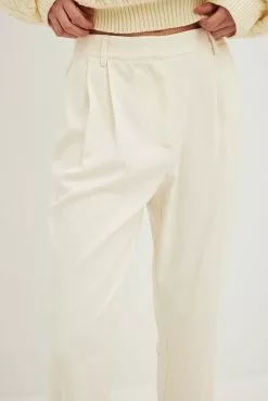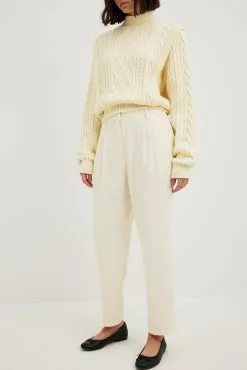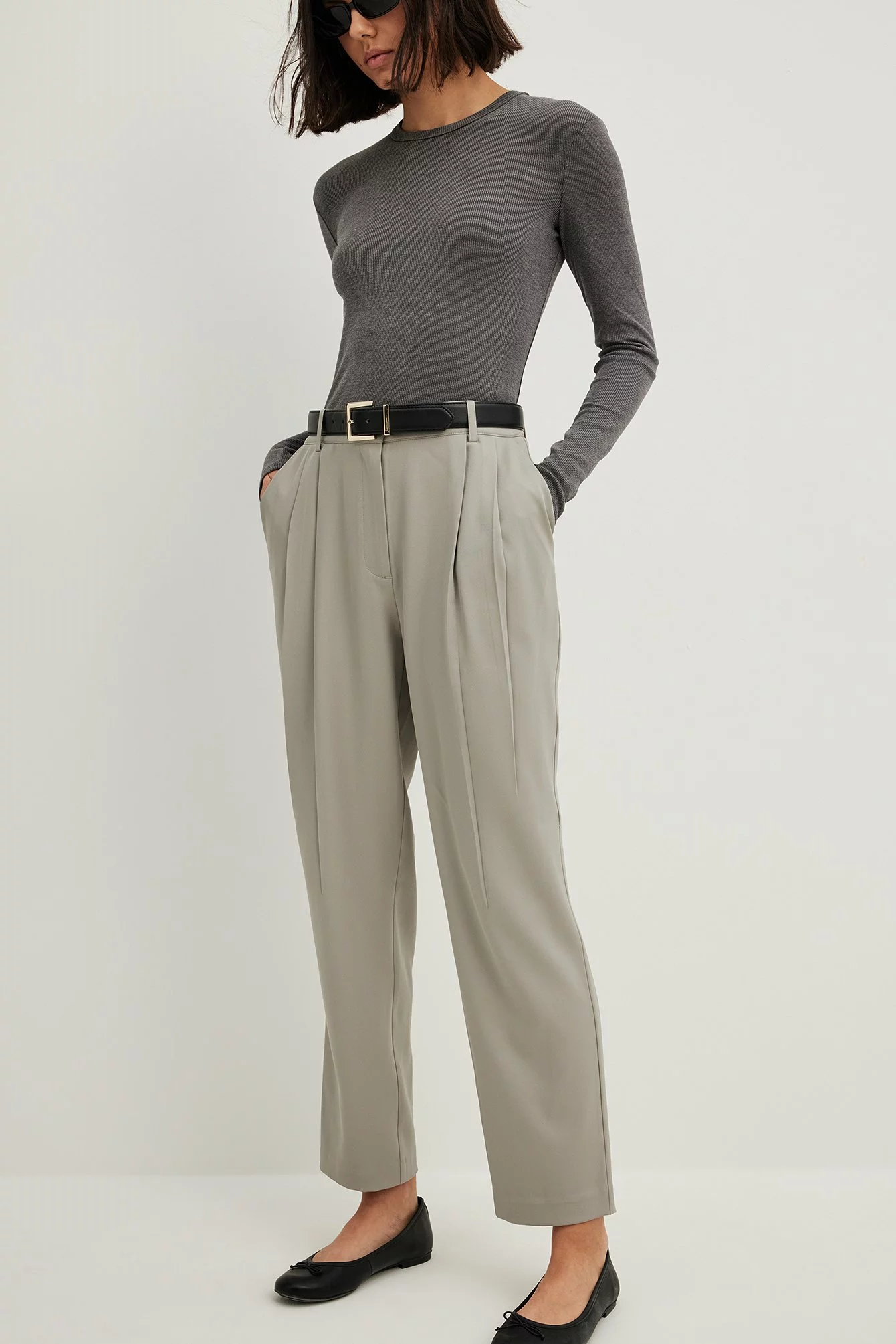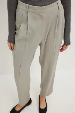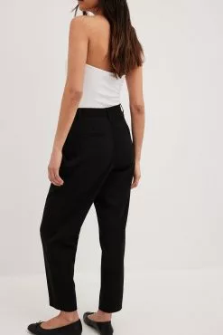 These trousers are pleated and feature a slim fit. They have a high waist with belt loops and open side pockets. Our trousers feature cropped length, back mock pockets and a zip and hook closure. Inseam length in size 36: 70 cm / 27.55 in.