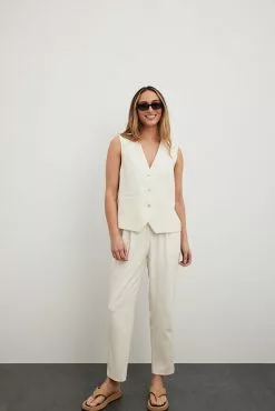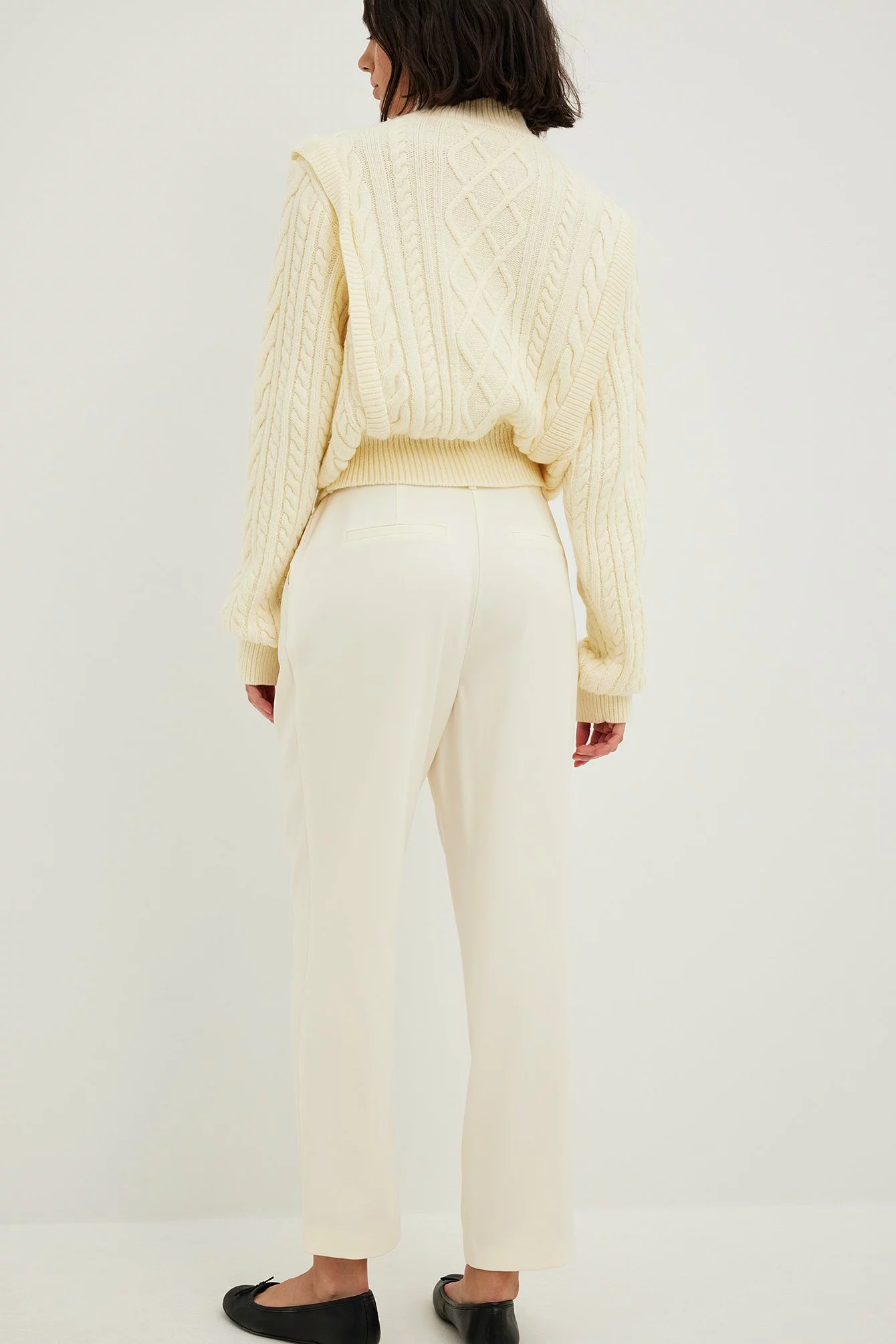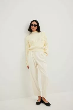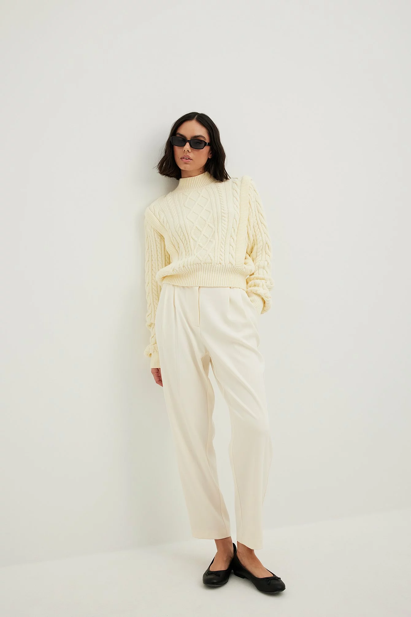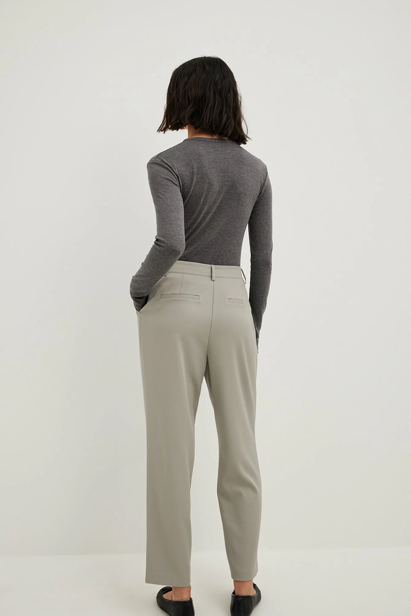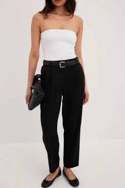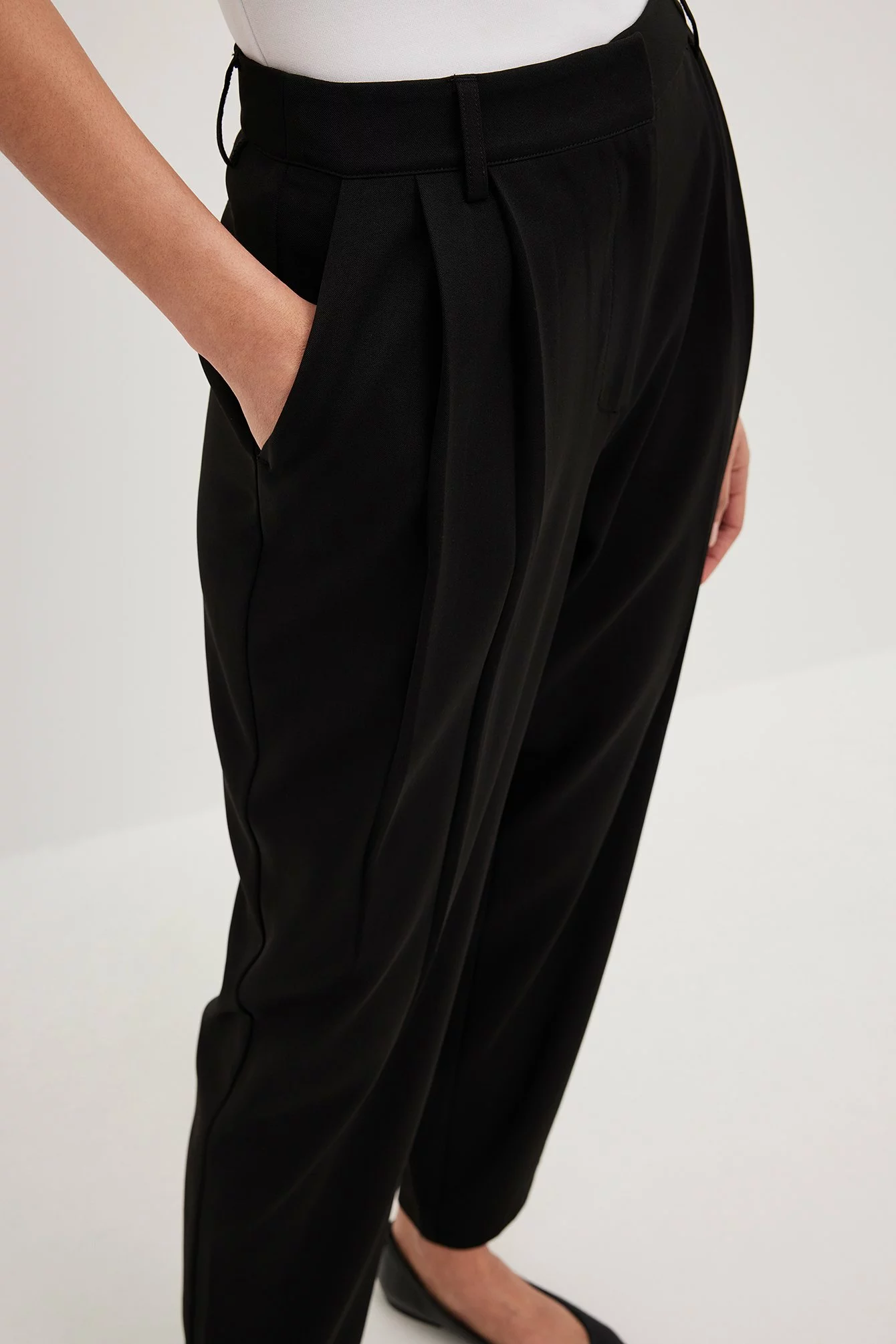 These trousers are pleated and feature a slim fit. They have a high waist with belt loops and open side pockets. Our trousers feature cropped length, back mock pockets and a zip and hook closure. Inseam length in size 36: 70 cm / 27.55 in.