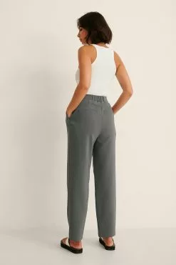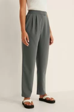 These pants feature an elastic high waist, pleat details, a zipper and hook closure, 2 side pockets, 2 back mock pockets and straight legs.