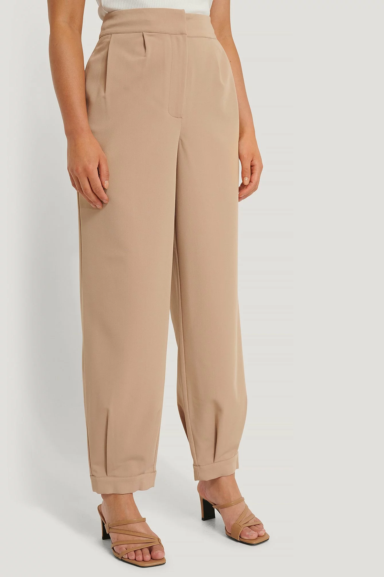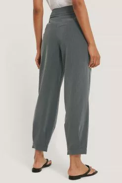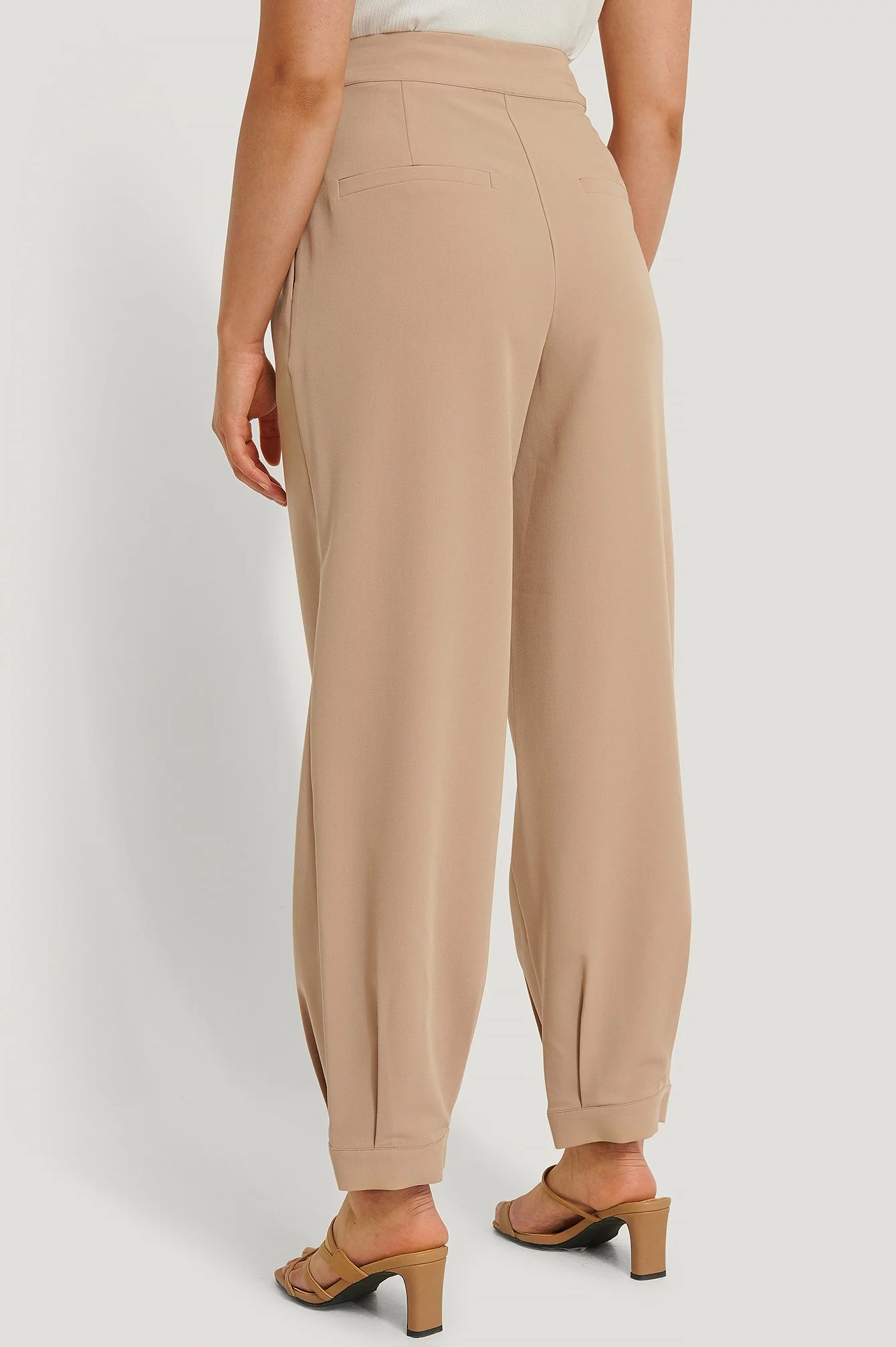 These suit pants feature a zipper and hook closure, two back mock pockets, two side pockets and gathered, pleated designs at the bottom.