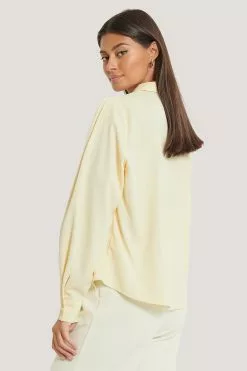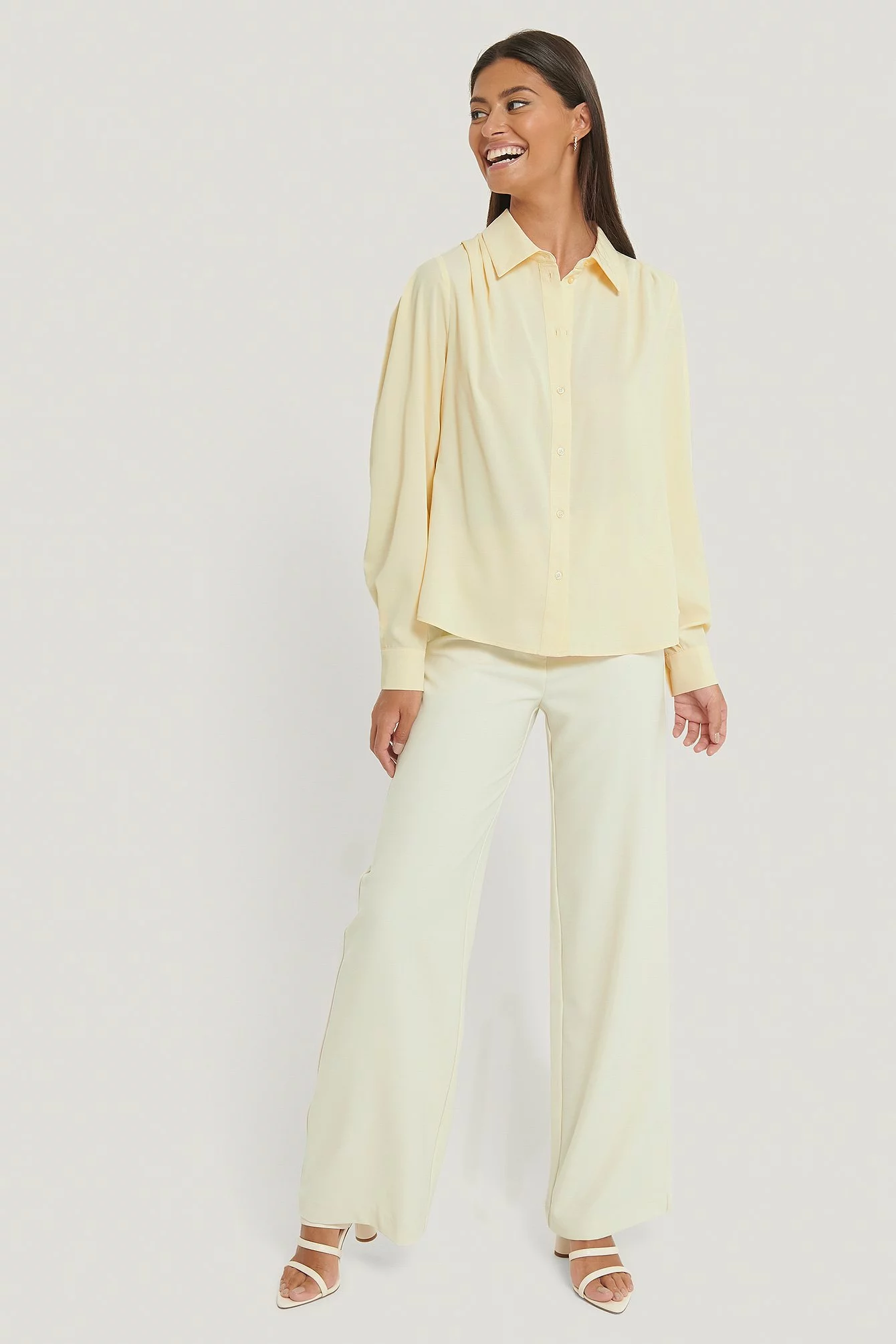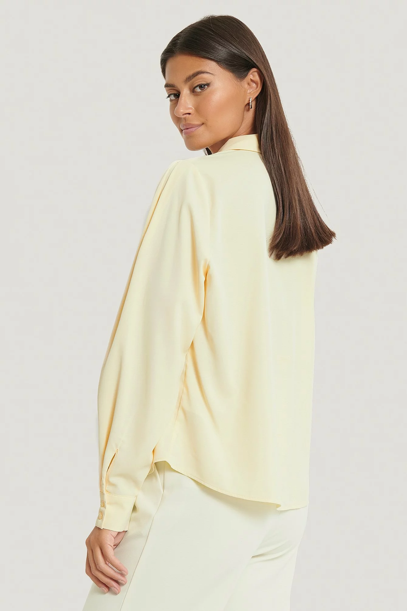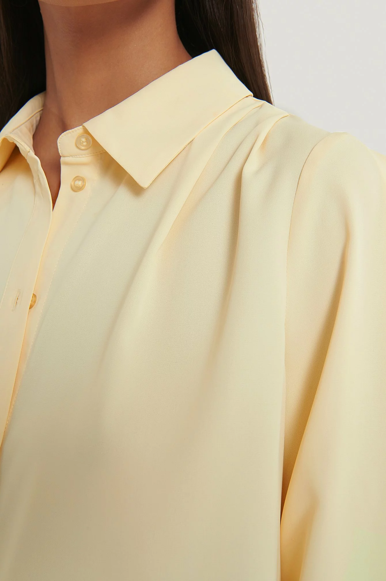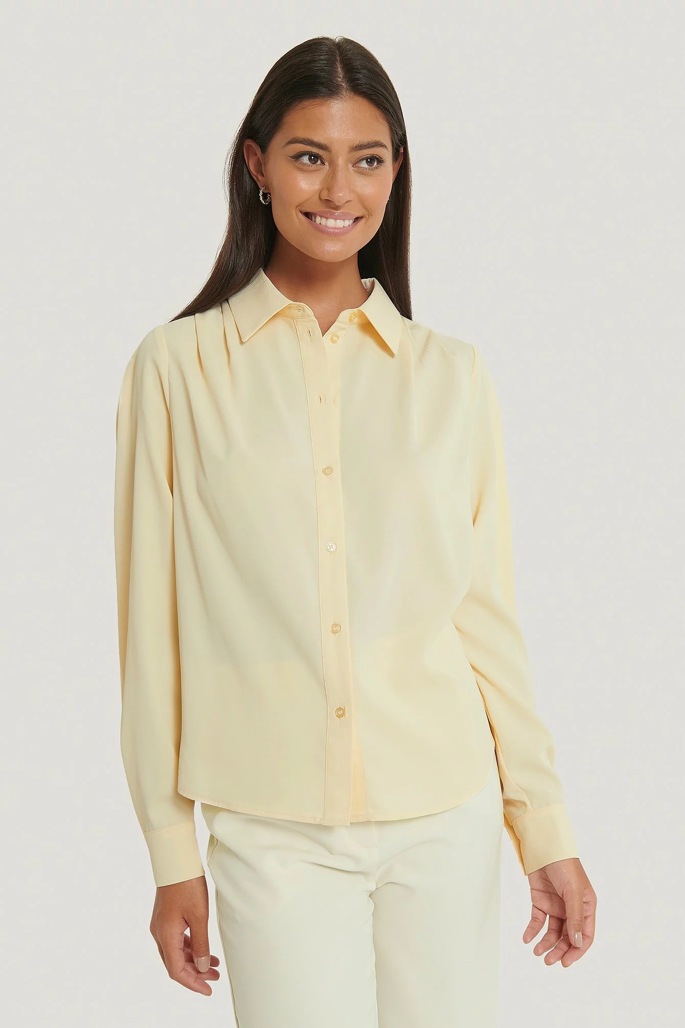 This blouse features a high neck with a classic shirt collar, gathered shoulders, long sleeves with two button closures at the cuffs, a button closure down the front and a relaxed fit.