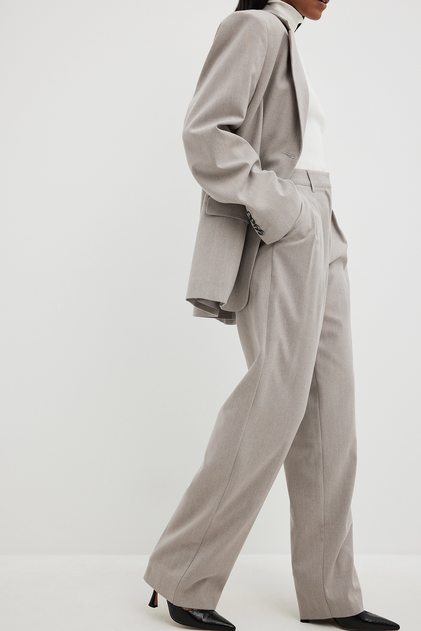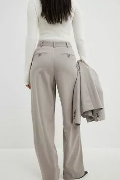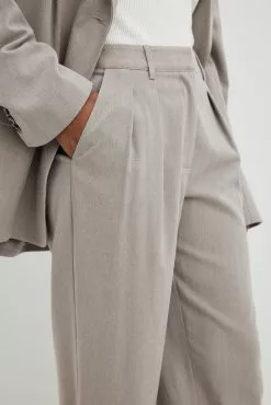 These suit pants feature a herringbone pattern and a high waist fit. They have a wide leg and side slant pockets. These suit pants feature a back mock pocket with a button fly closure.