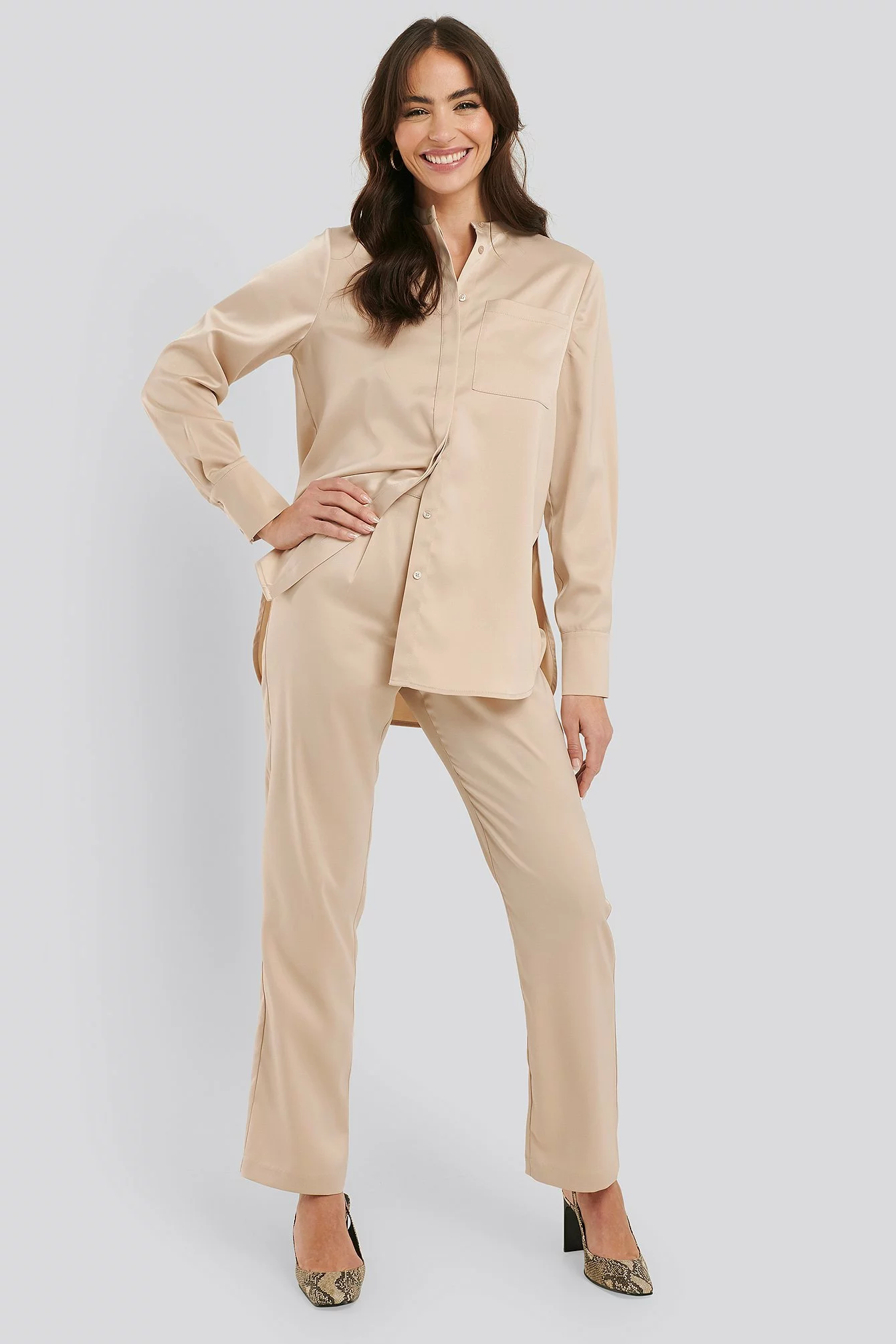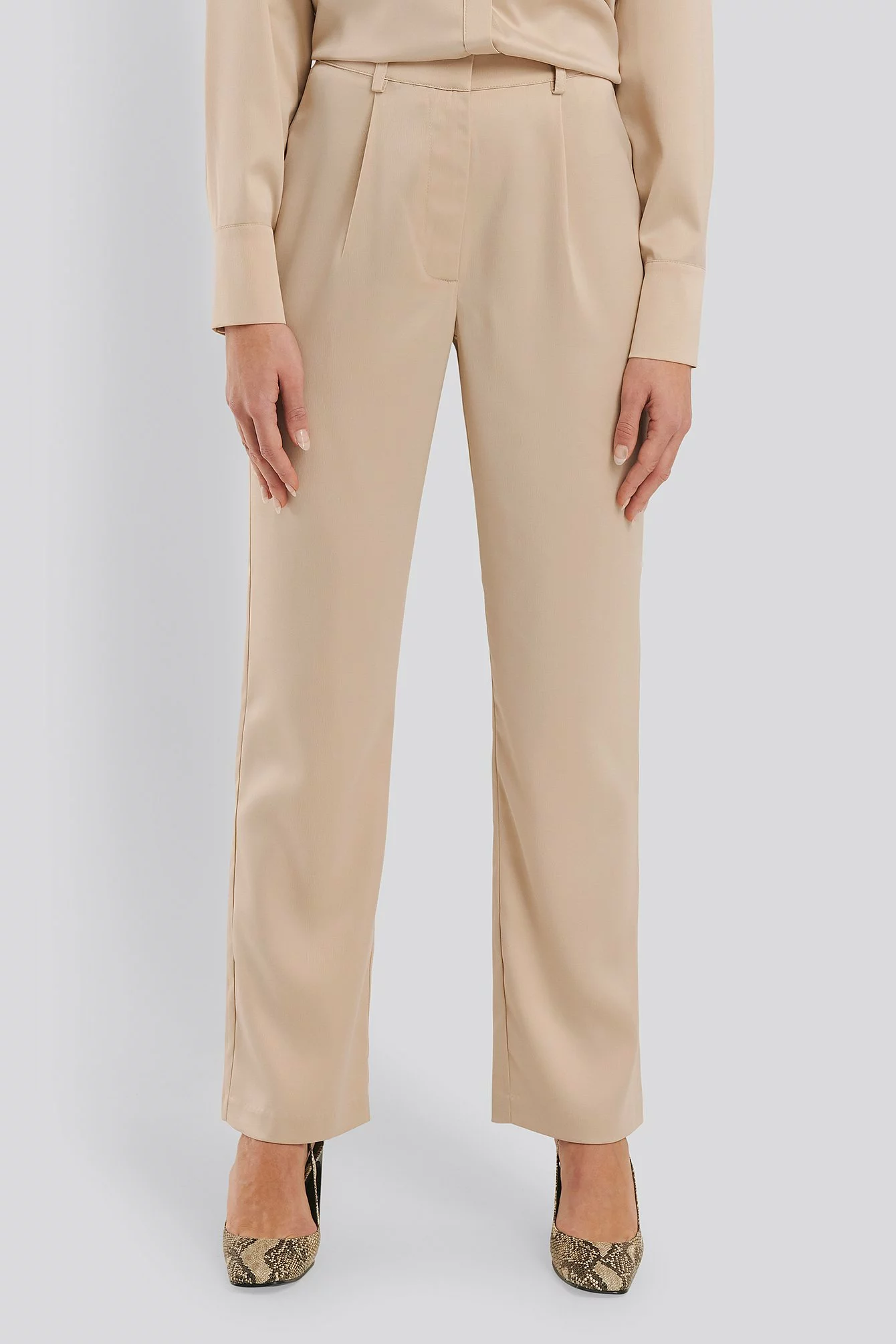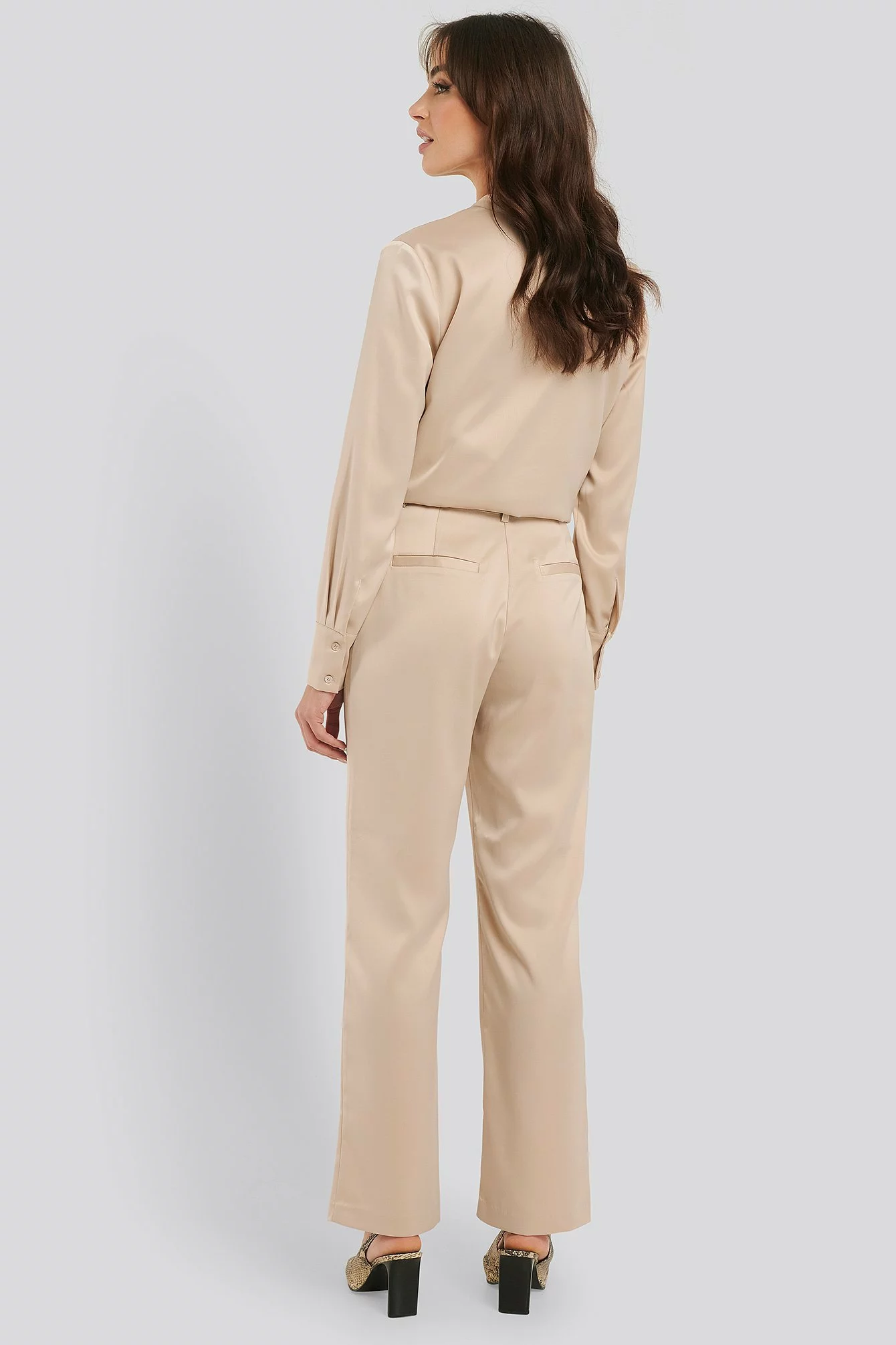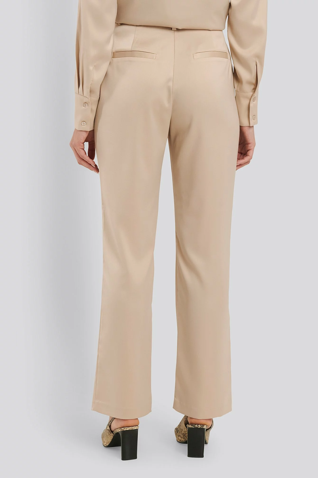 These pants feature a high waist, belt loops, a zipper, hook and button closure, two back mock pockets, straight legs and a silky touch.
