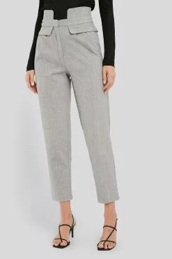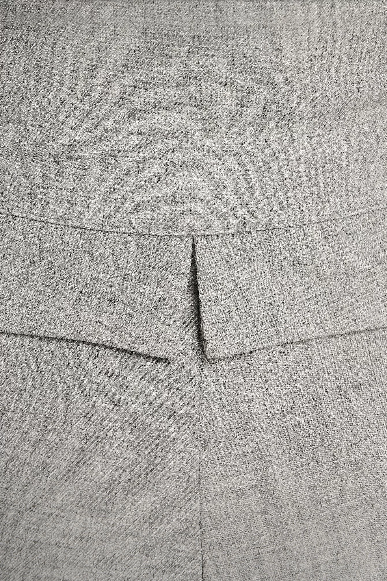 These pants feature a high waist with flared details, a zipper, hook and button closure, two side slanting pockets, straight legs and ankle length.