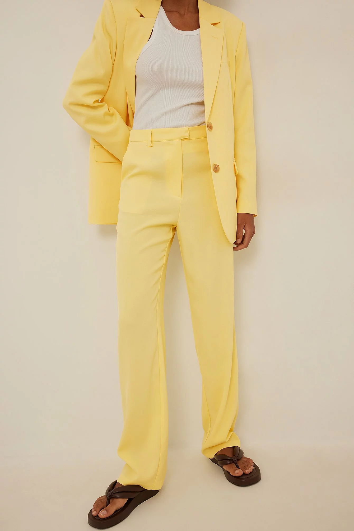 These suit pants feature a high waist, a zipper, hook and button closure, belt loops, two side pockets, two mock back pockets and a straight leg.