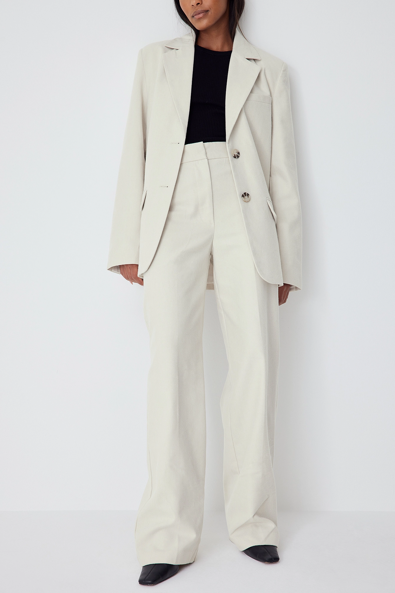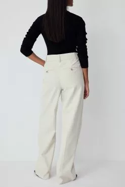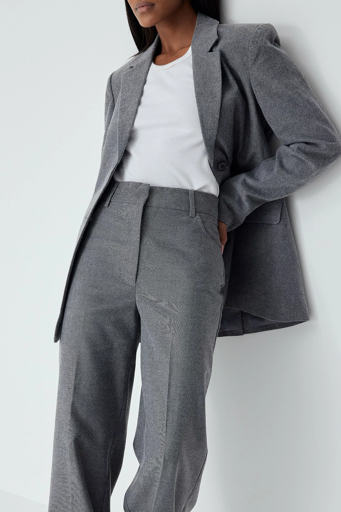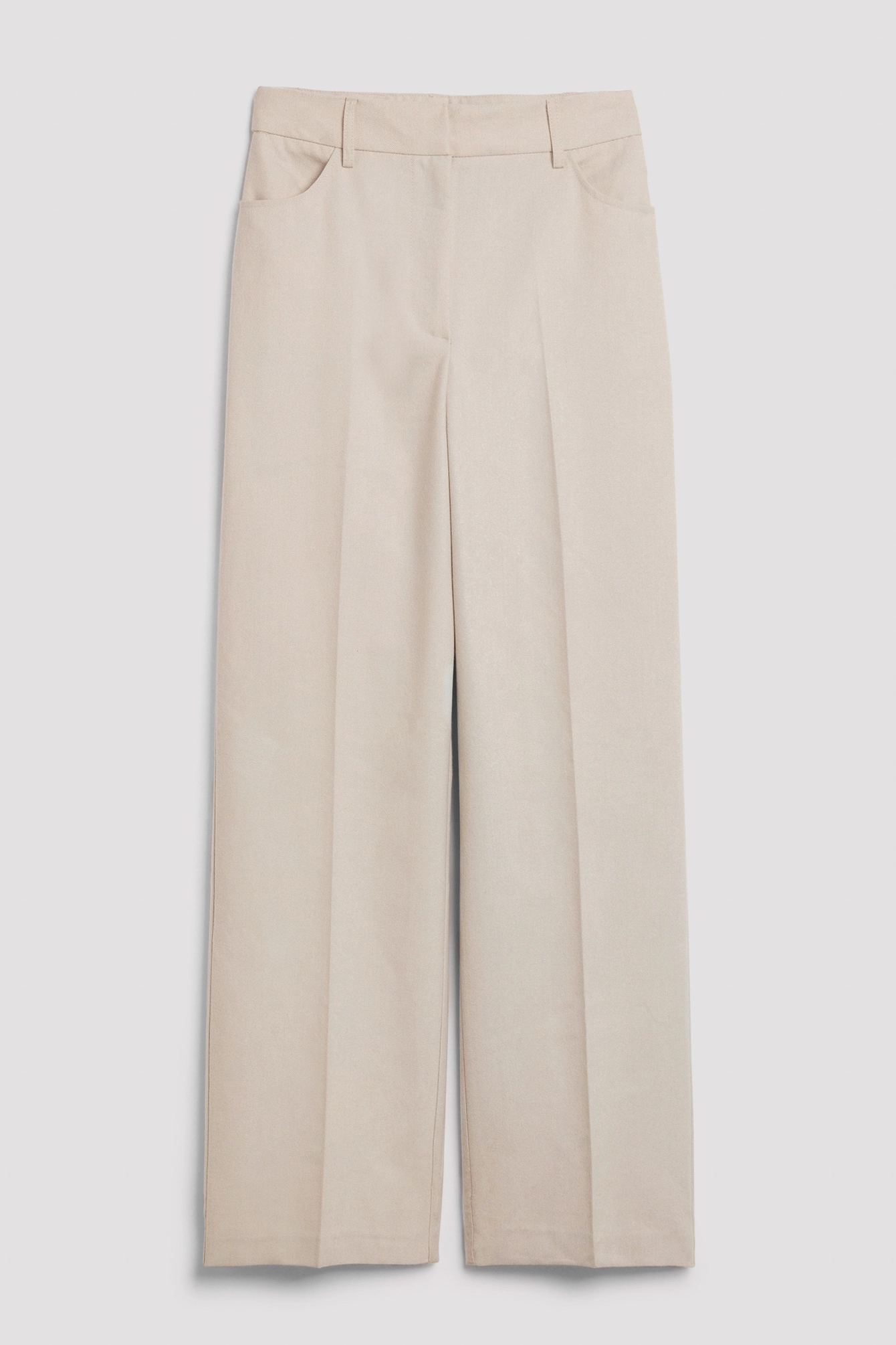 These trousers feature straight legs, a zipper, hook and button closure, belt loops, front pockets and back mock pockets with buttons. Inseam length: 82 cm / 32.28 in.