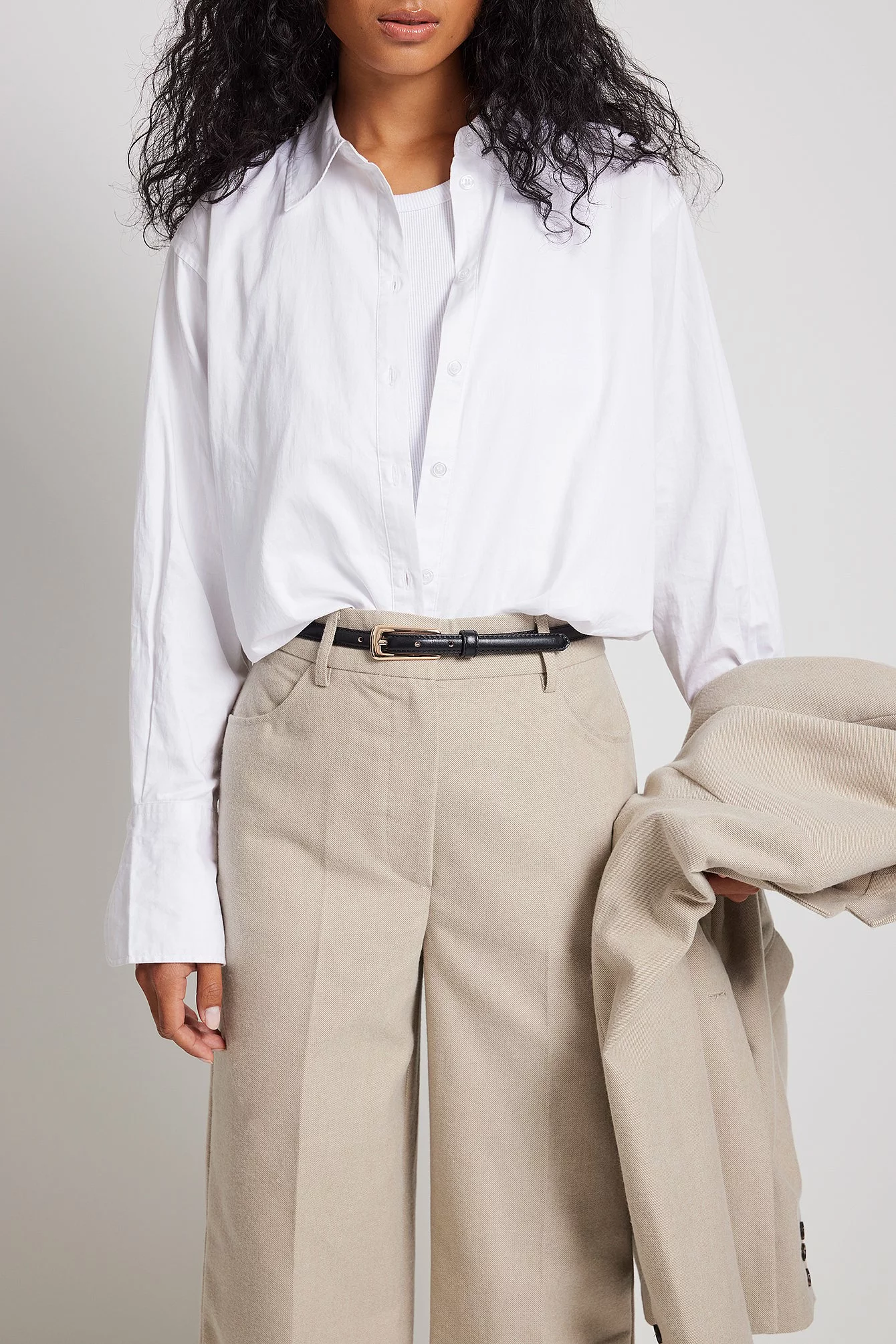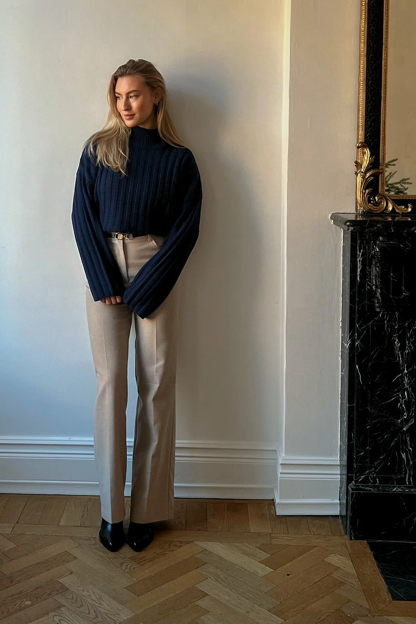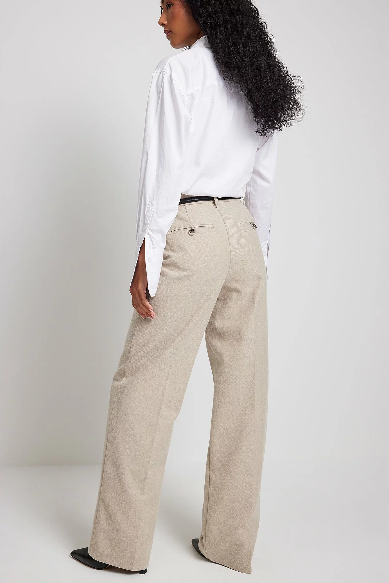These trousers feature straight legs, a zipper, hook and button closure, belt loops, front pockets and back mock pockets with buttons. Inseam length: 82 cm / 32.28 in.