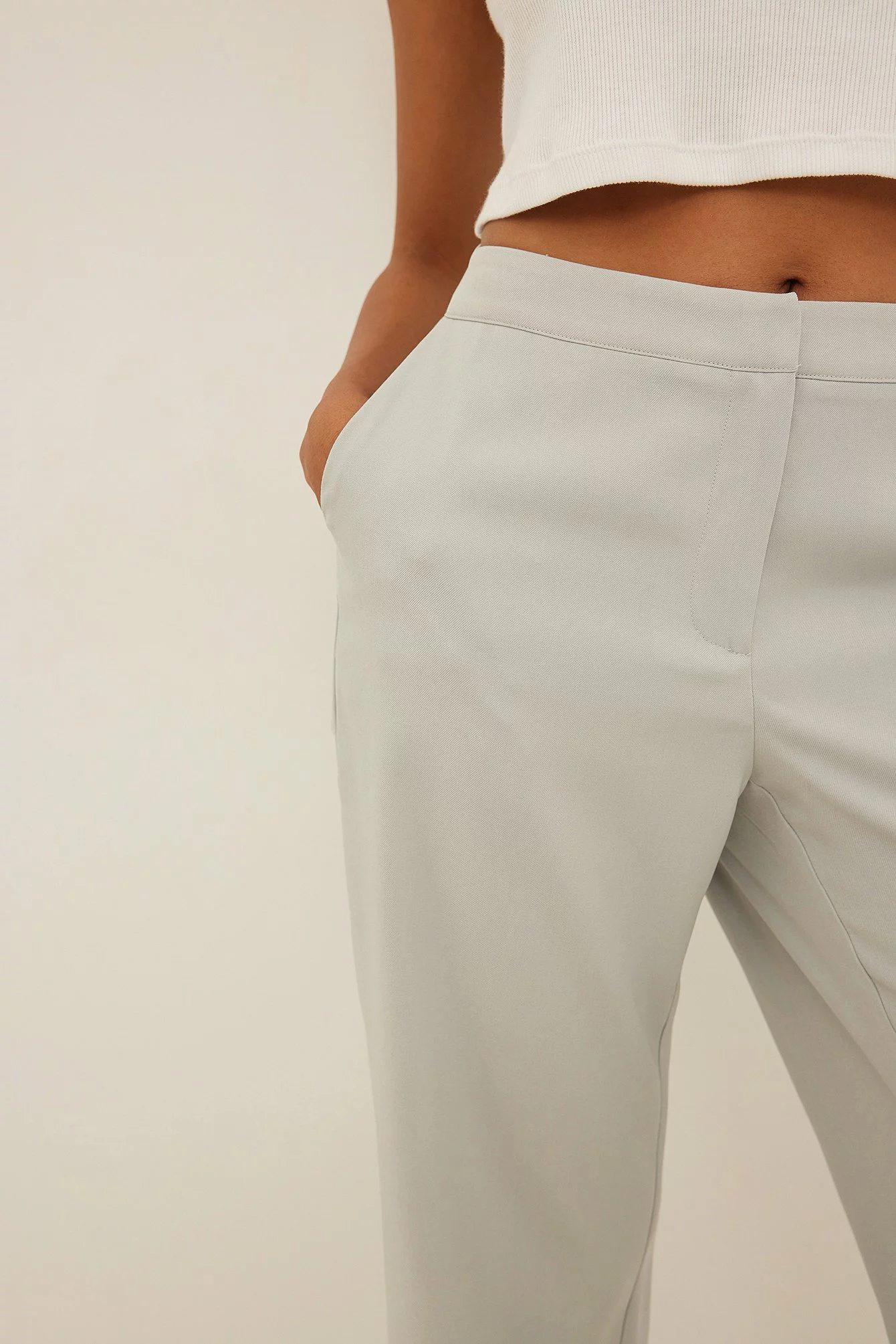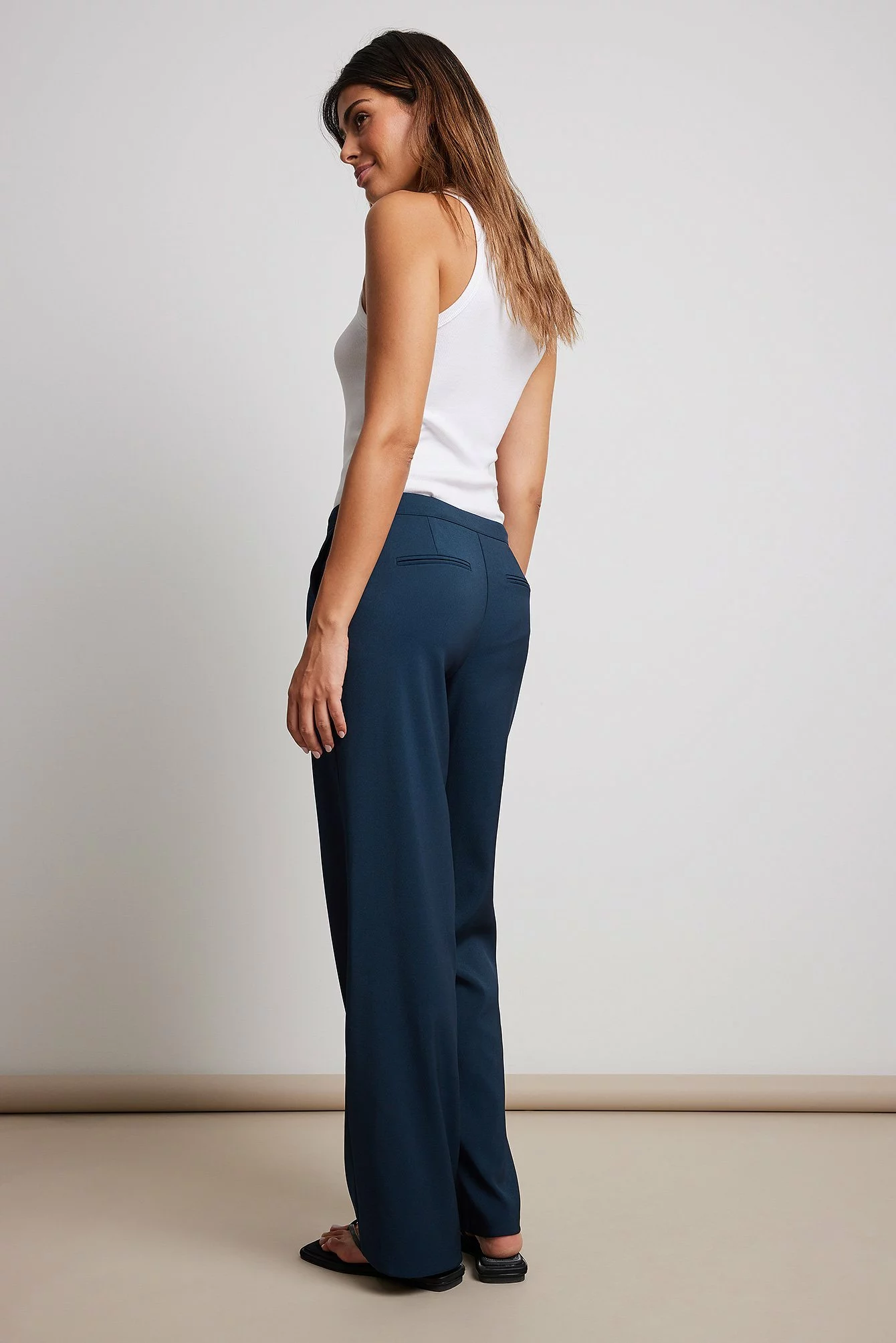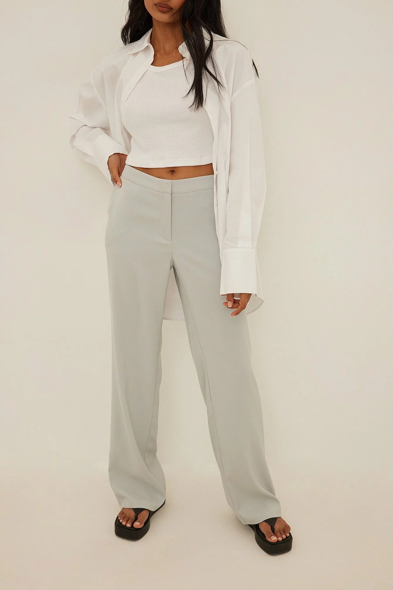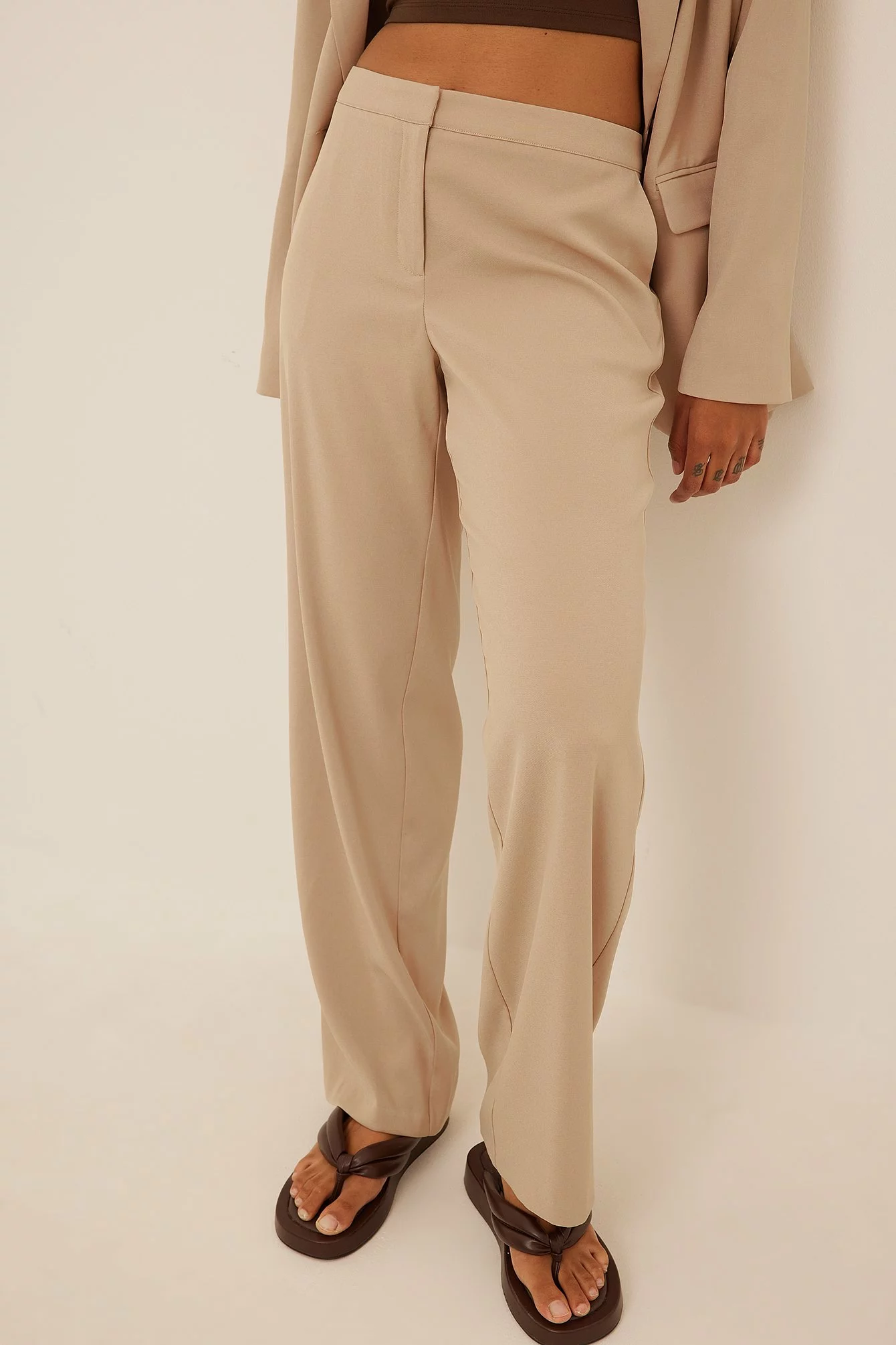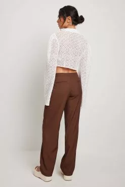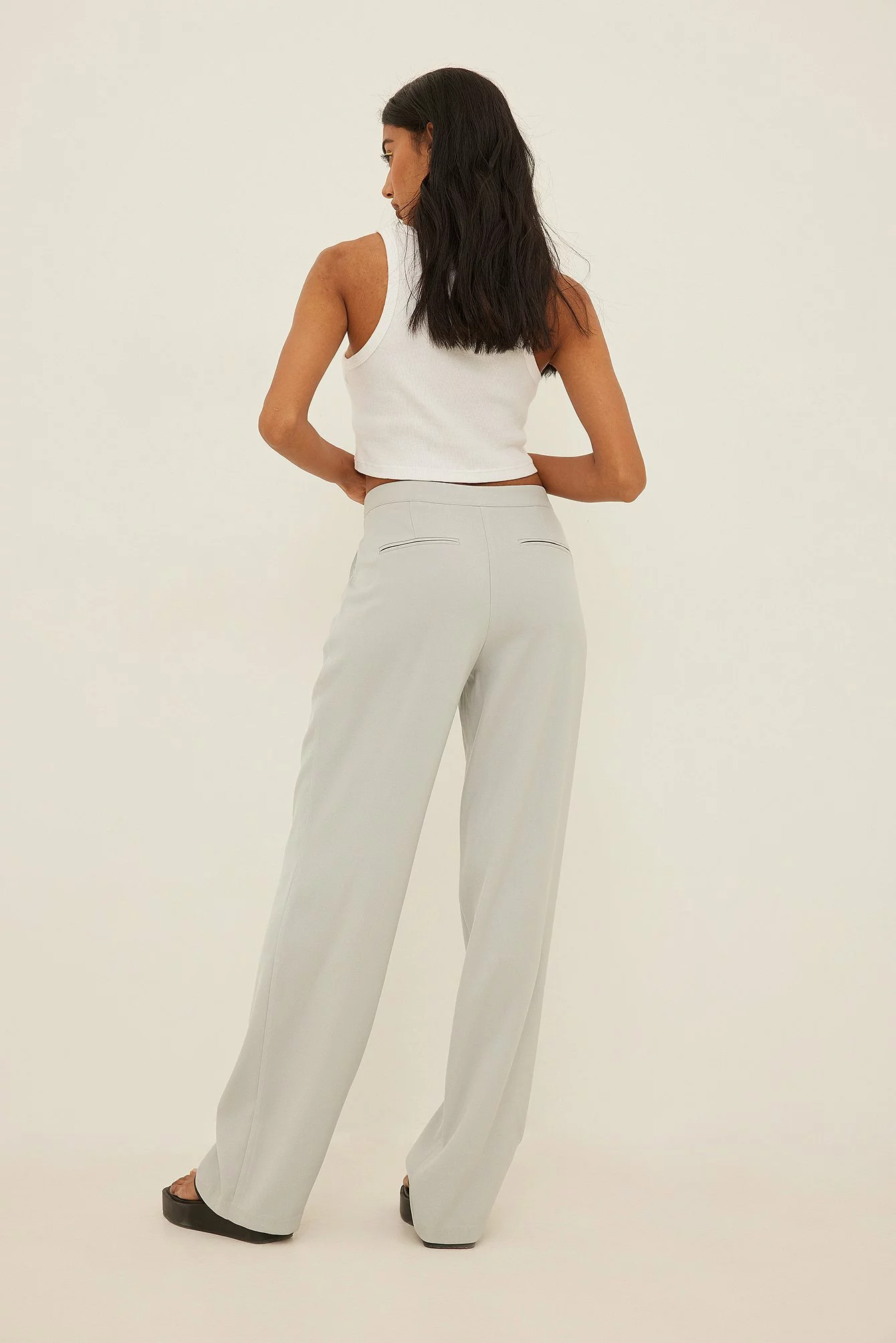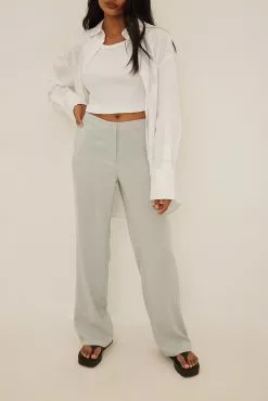 These trousers feature a low waist, a zipper fly, side pockets, back mock pockets and straight legs.