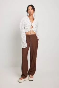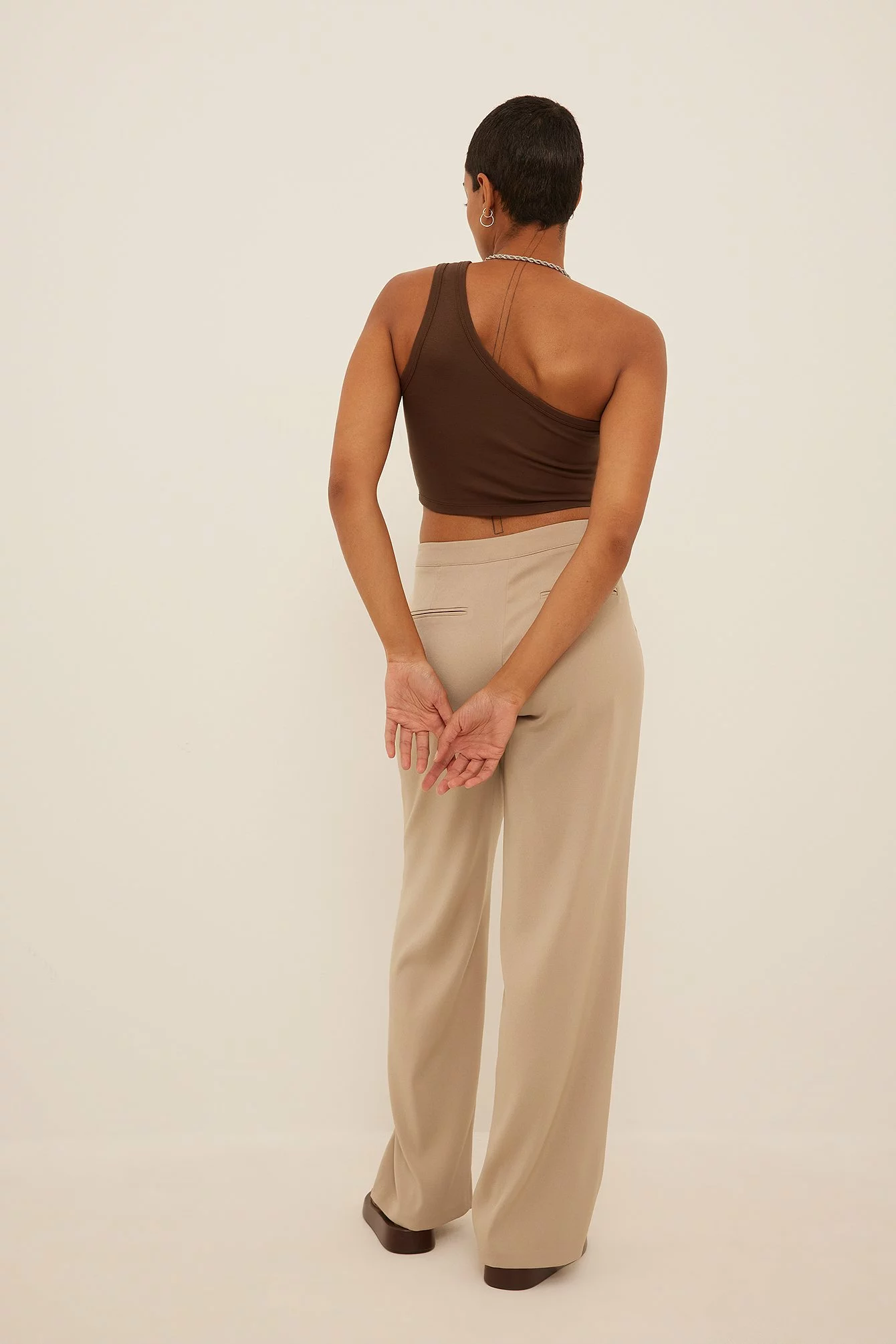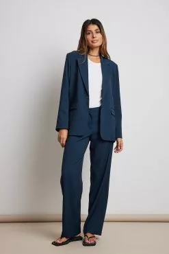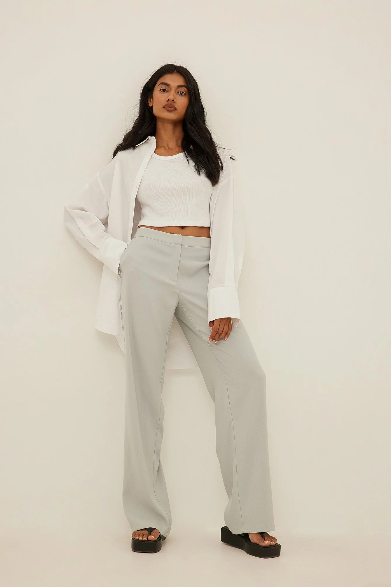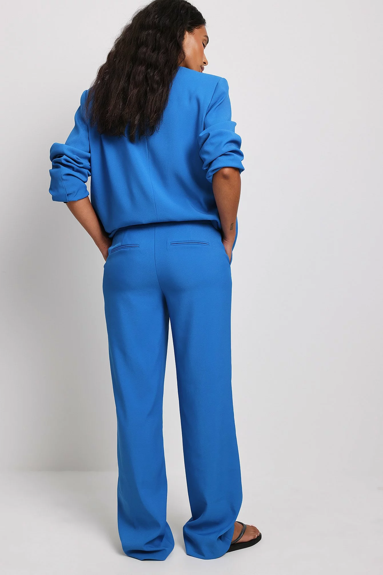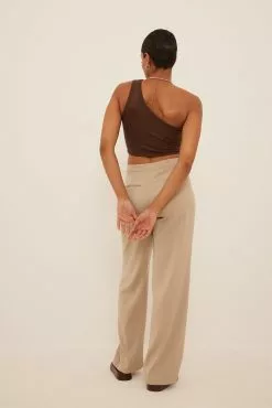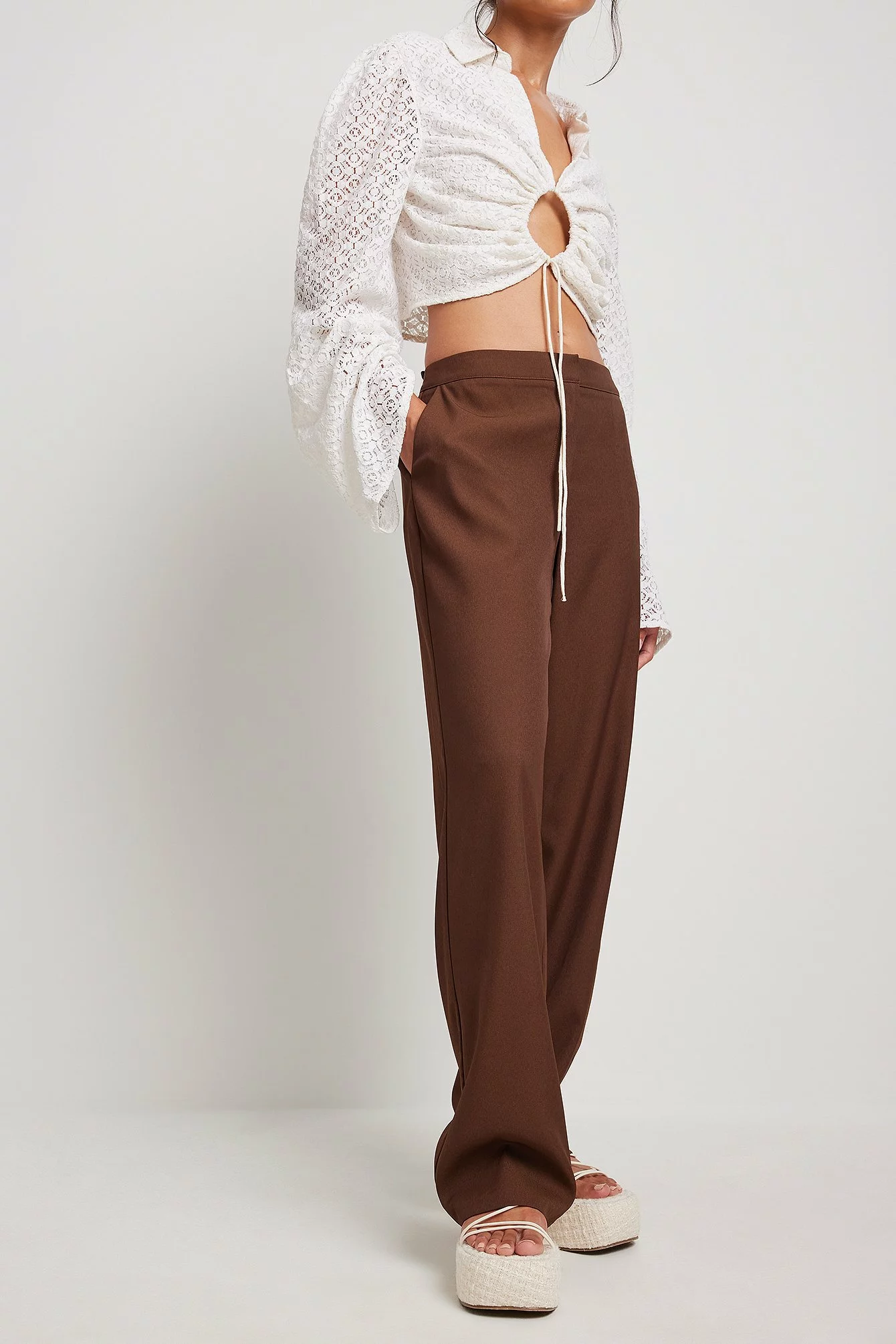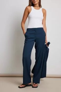These trousers feature a low waist, a zipper fly, side pockets, back mock pockets and straight legs.