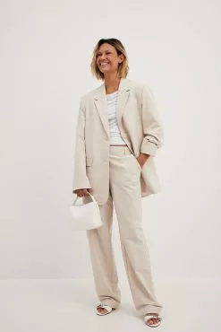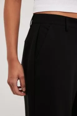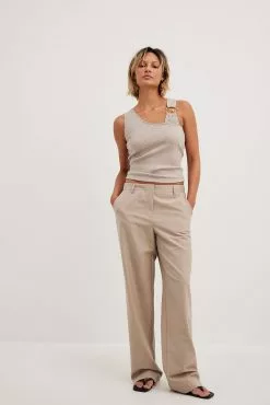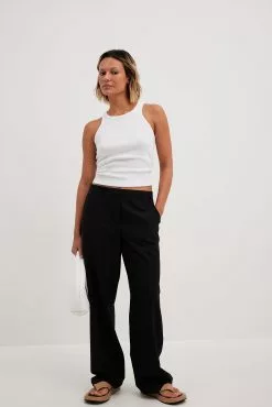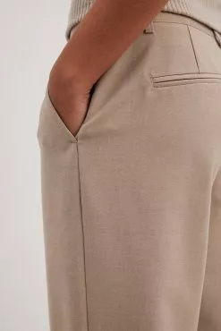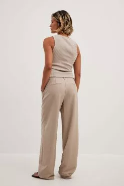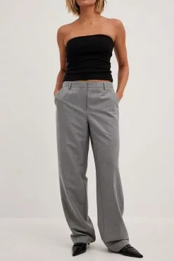 These trousers feature a mid rise fit. They have belt loops and a zipper, hook and button closure. These trousers feature side pockets, fake pockets on the back and wide legs.