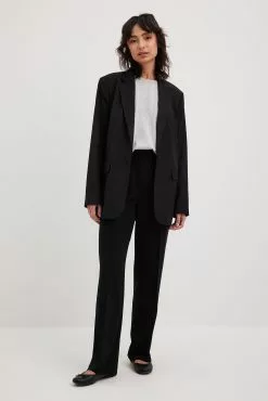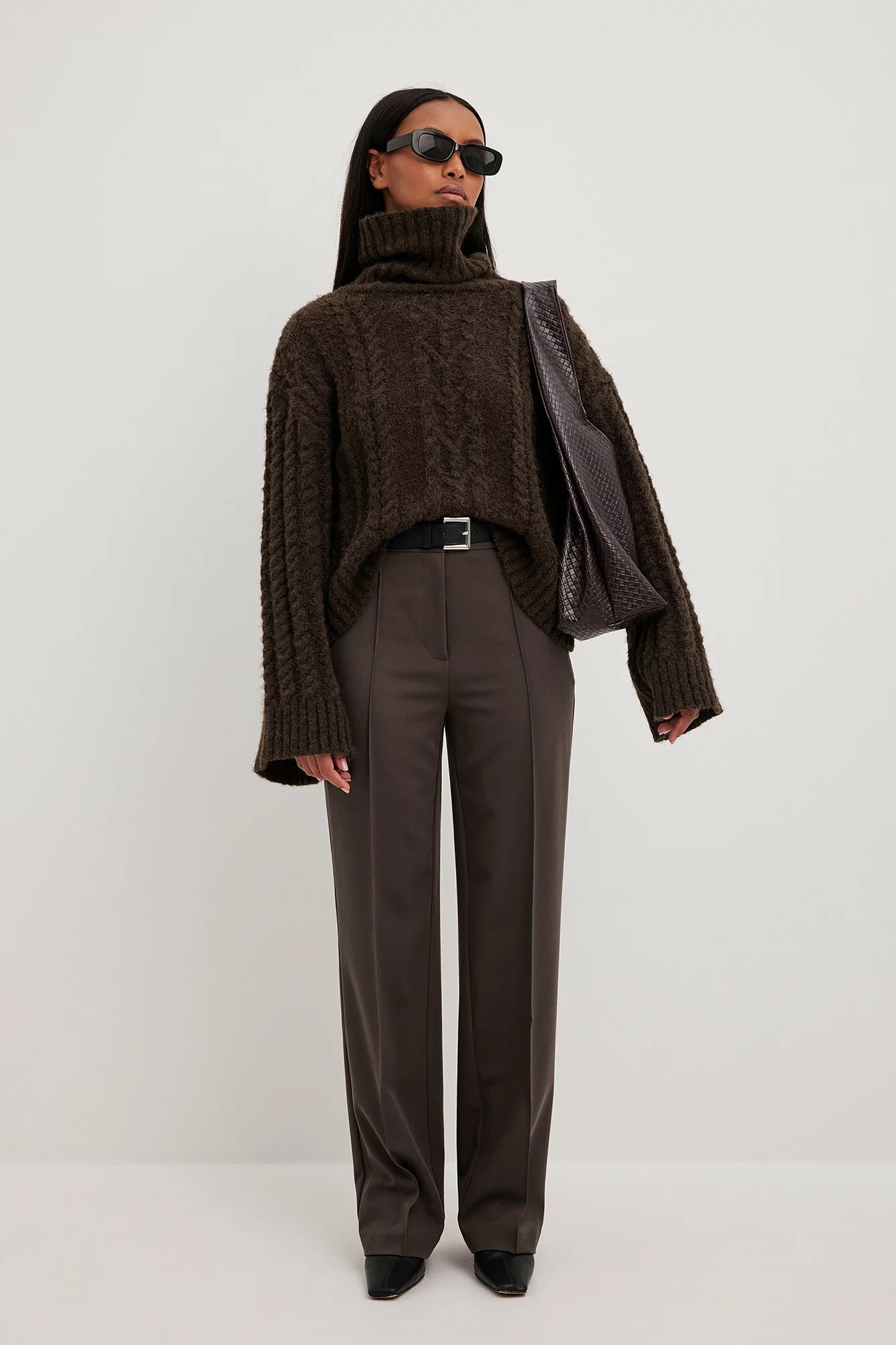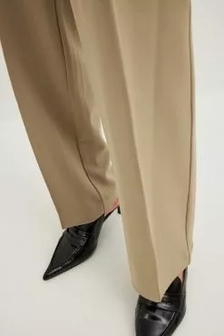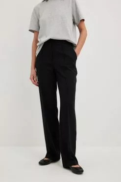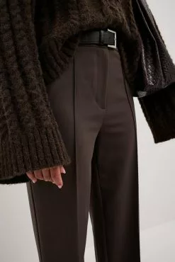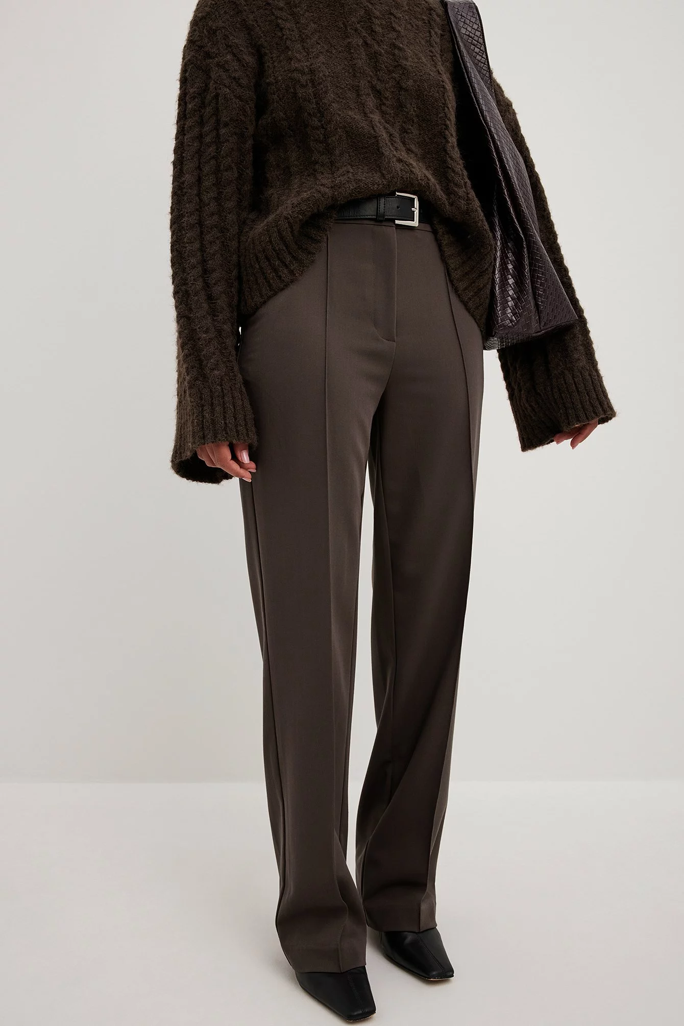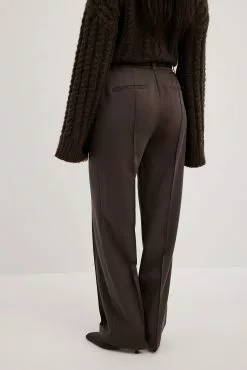 These trousers feature a mid waist. They have a straight fit and seam details along each leg. These trousers feature two side slanting pockets at the front, two back mock pockets, belt loops and a fabric lining on the inside with a contrast color. Inseam length in size 36: 80 cm / 31.49 in.