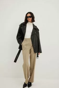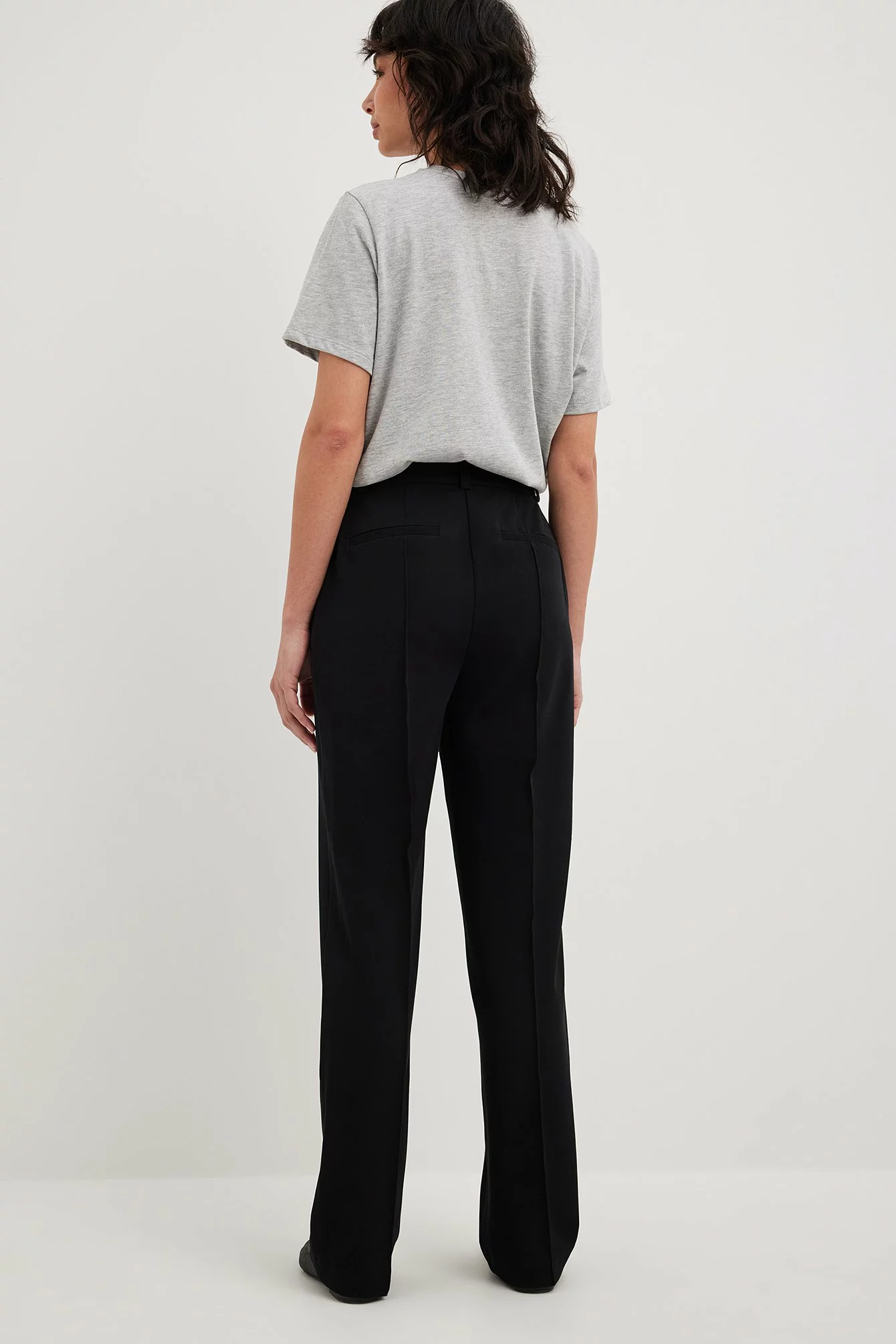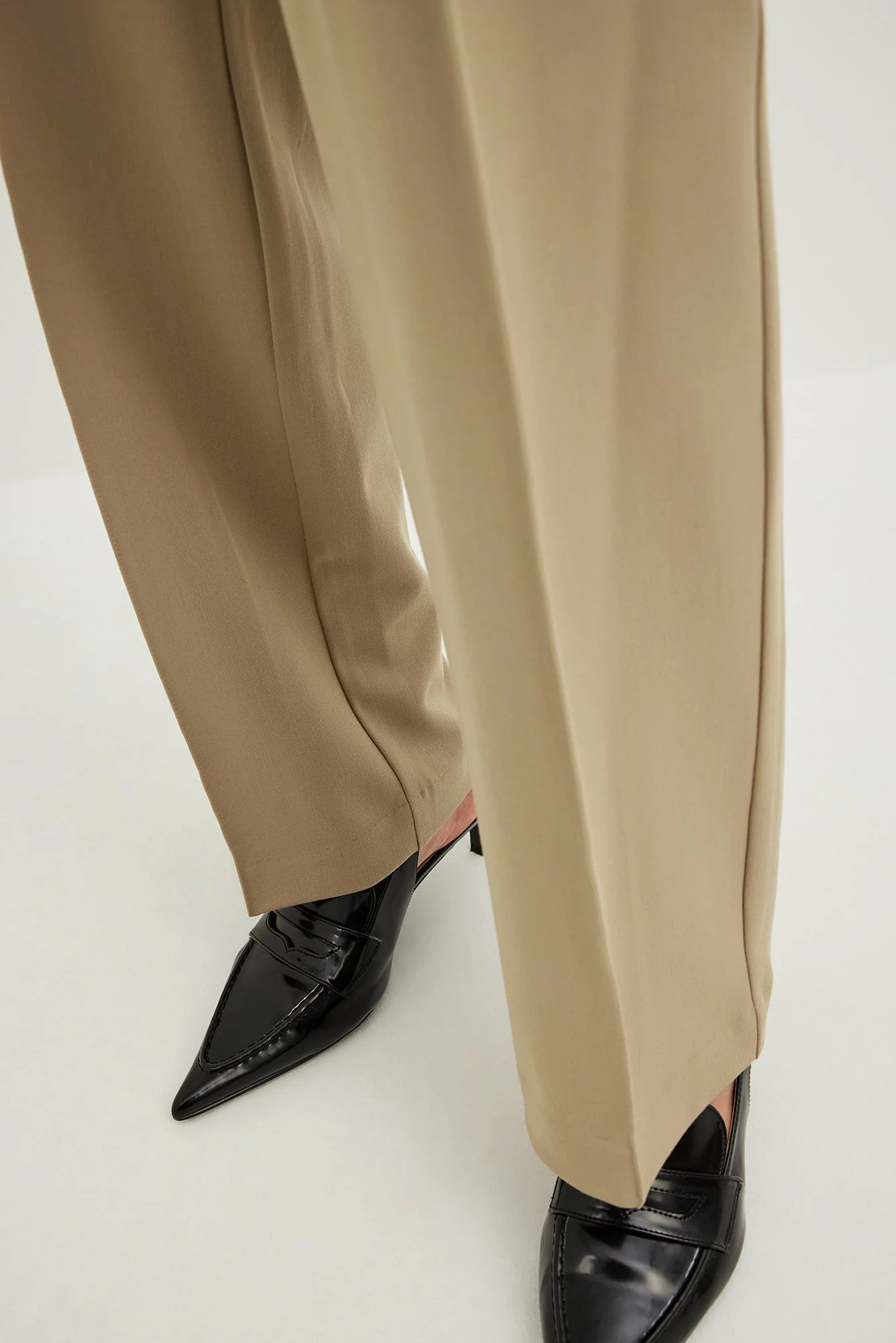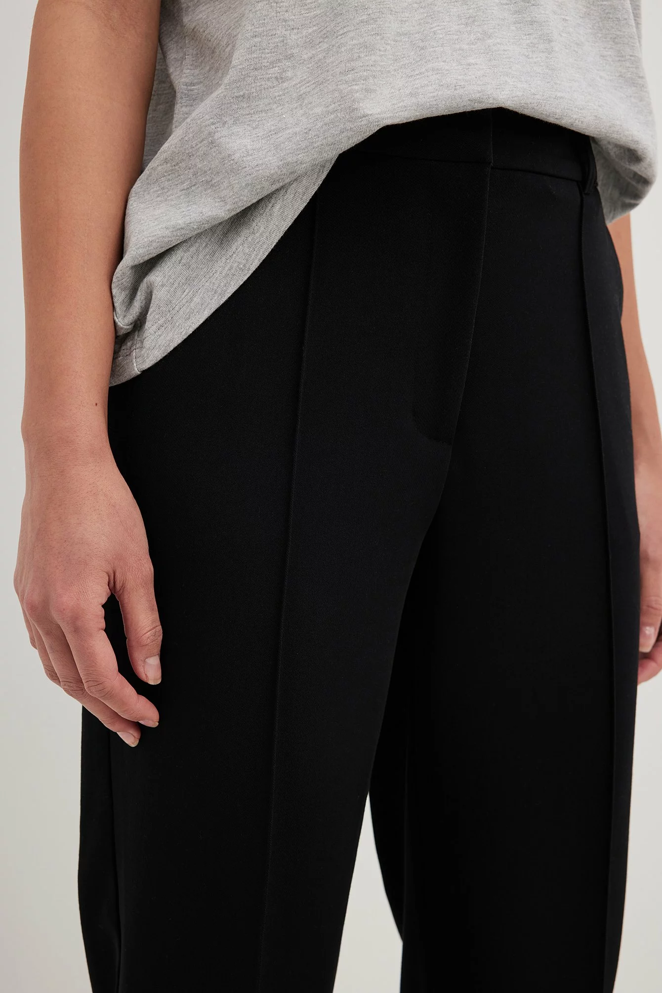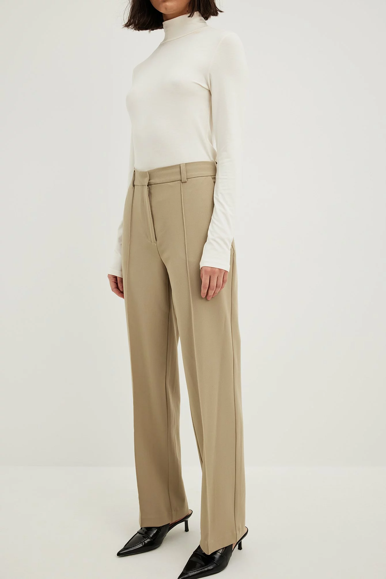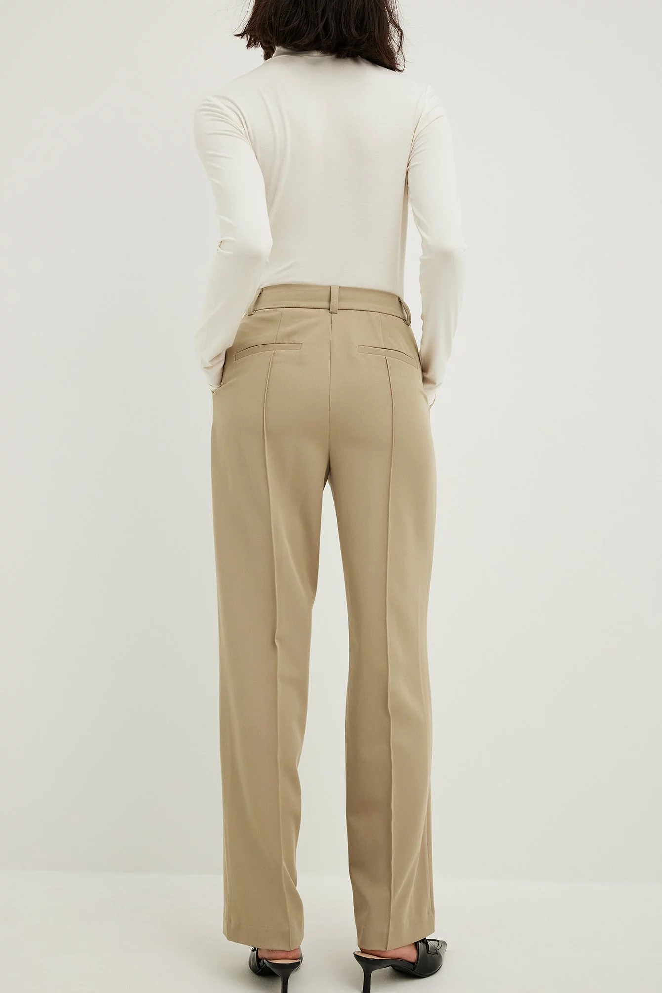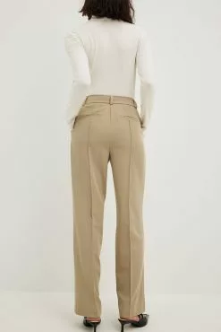 These trousers feature a mid waist. They have a straight fit and seam details along each leg. These trousers feature two side slanting pockets at the front, two back mock pockets, belt loops and a fabric lining on the inside with a contrast color. Inseam length in size 36: 80 cm / 31.49 in.