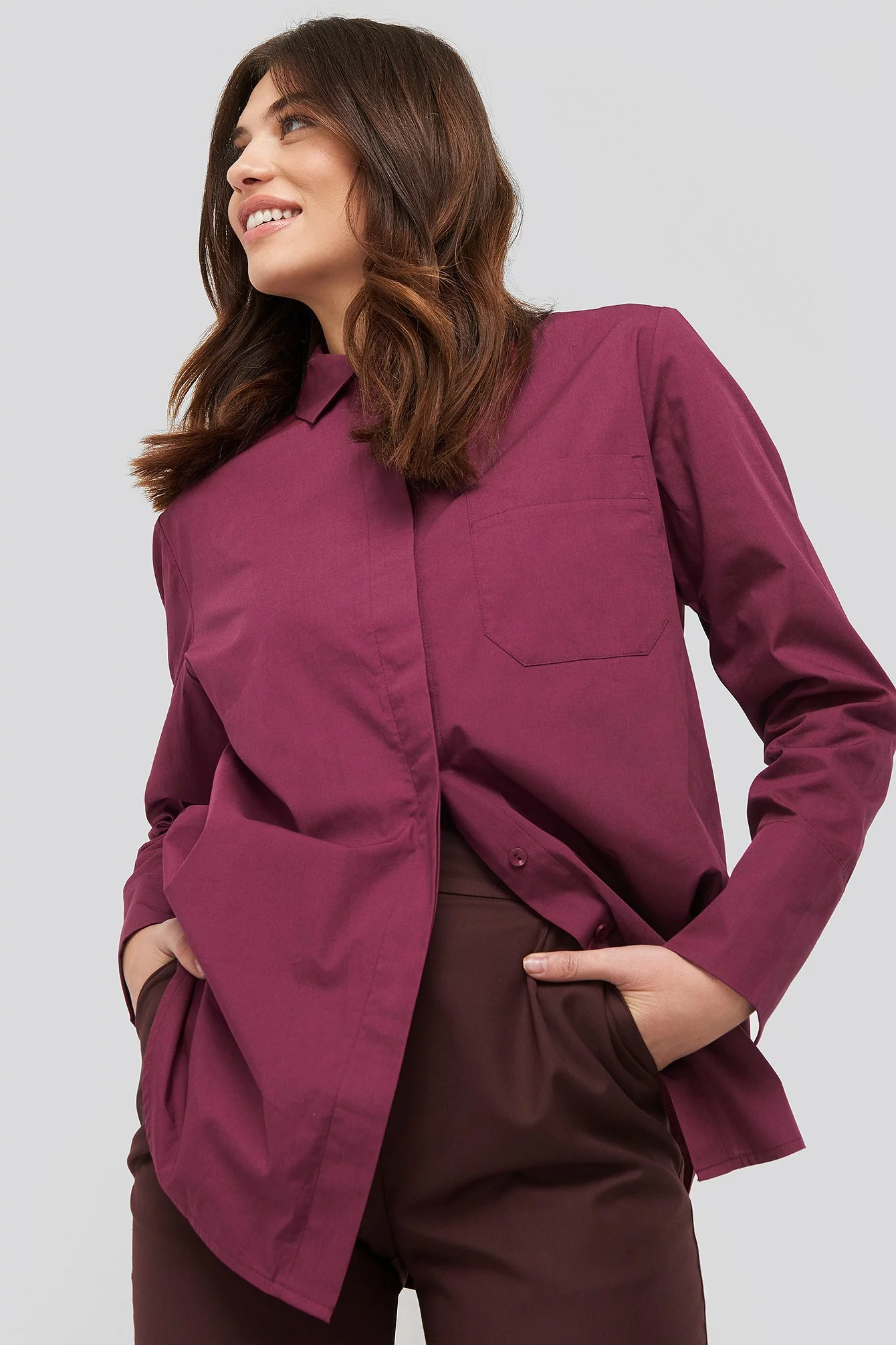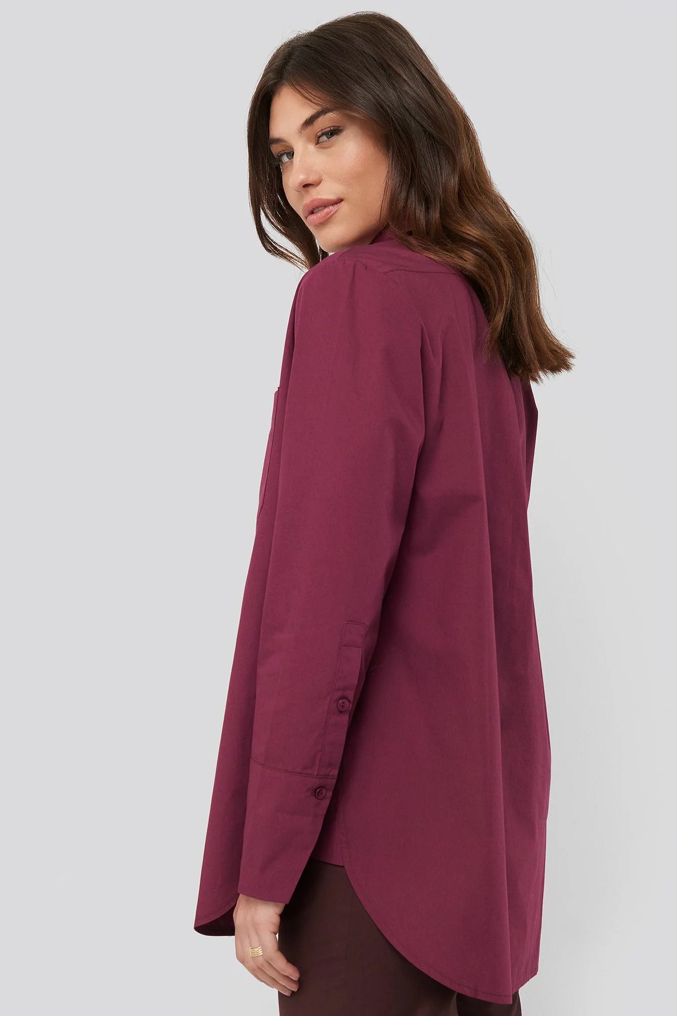 This shirt features a classic collar, long sleeves with two buttons on the ends, a chest pocket, button closures down the front and a long oversized fit.