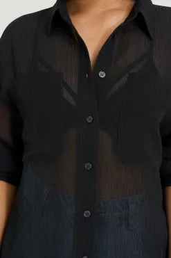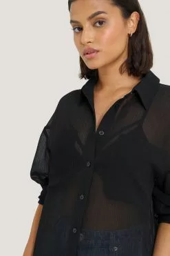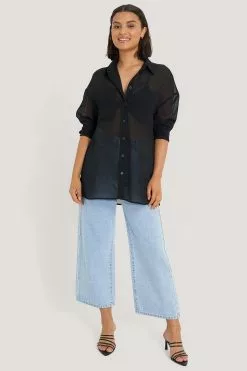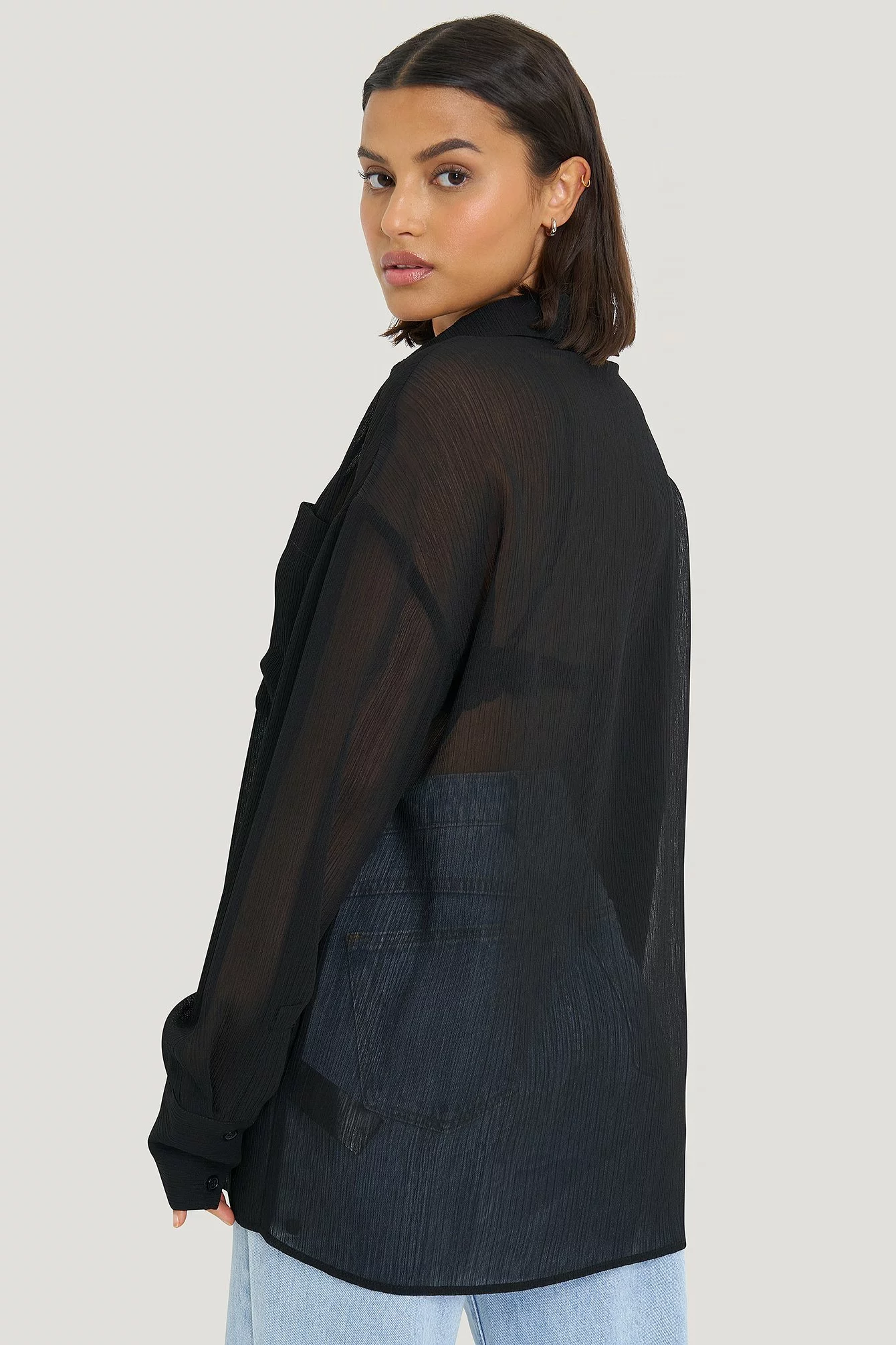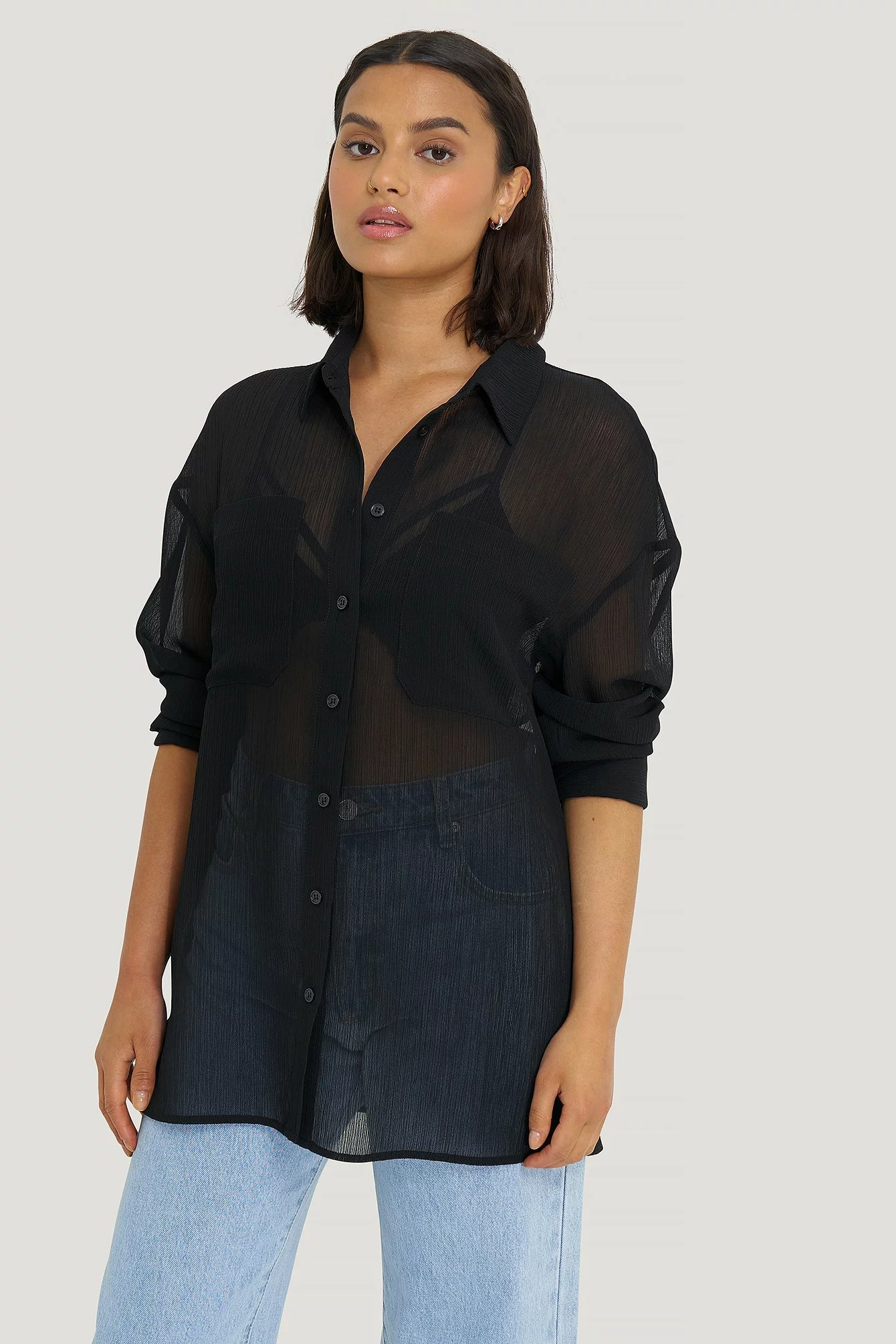 This blouse features a structured material, a classic collar, a button closure down the front, two front pockets, two button closures on the cuffs and an oversized fit.