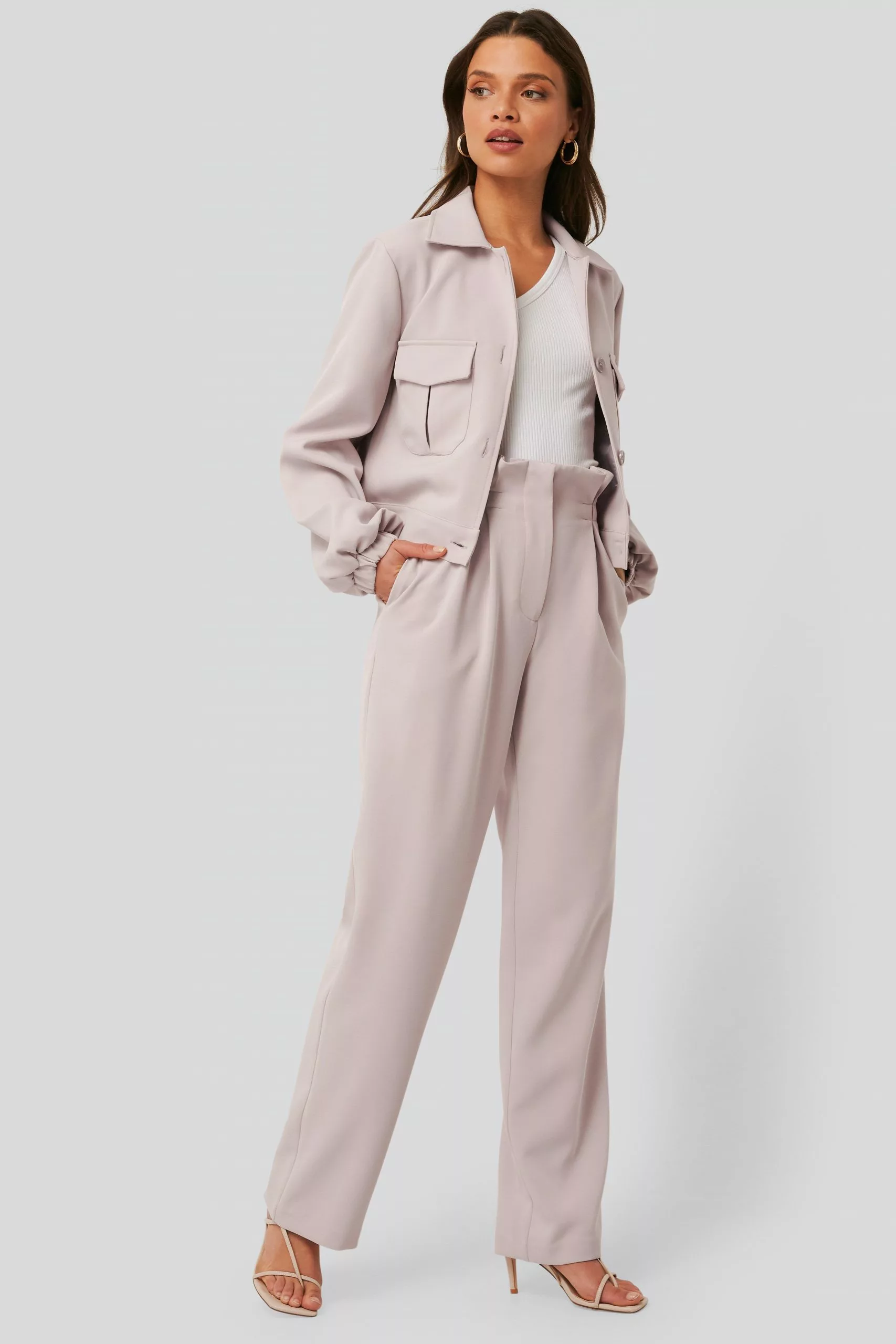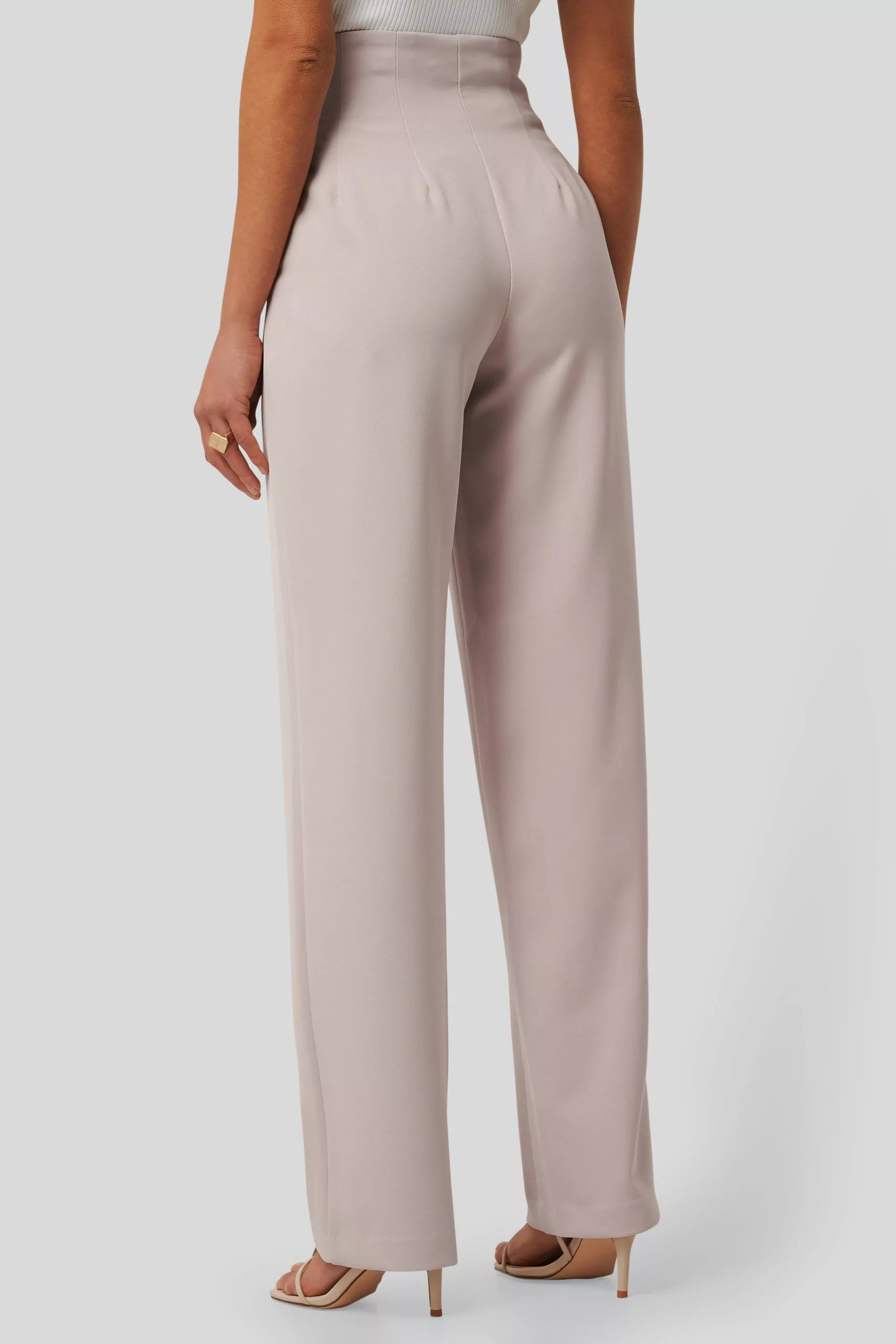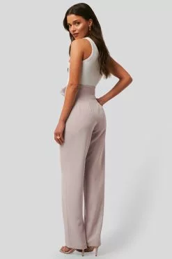 These pants feature a high waist, a hidden zipper and button closure, seam details around the waist, wide legs and two side slant pockets.