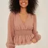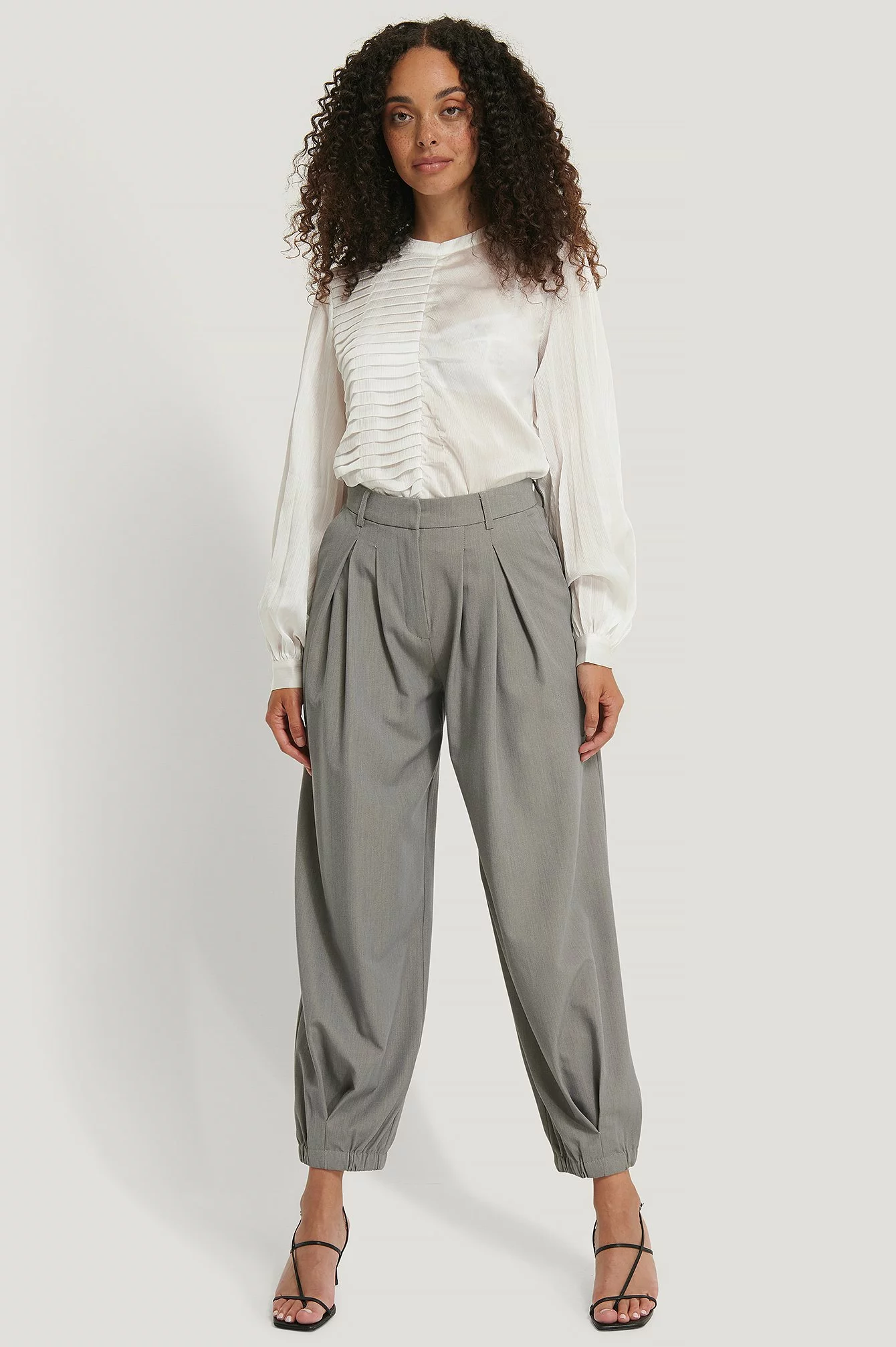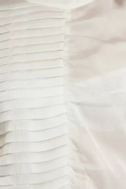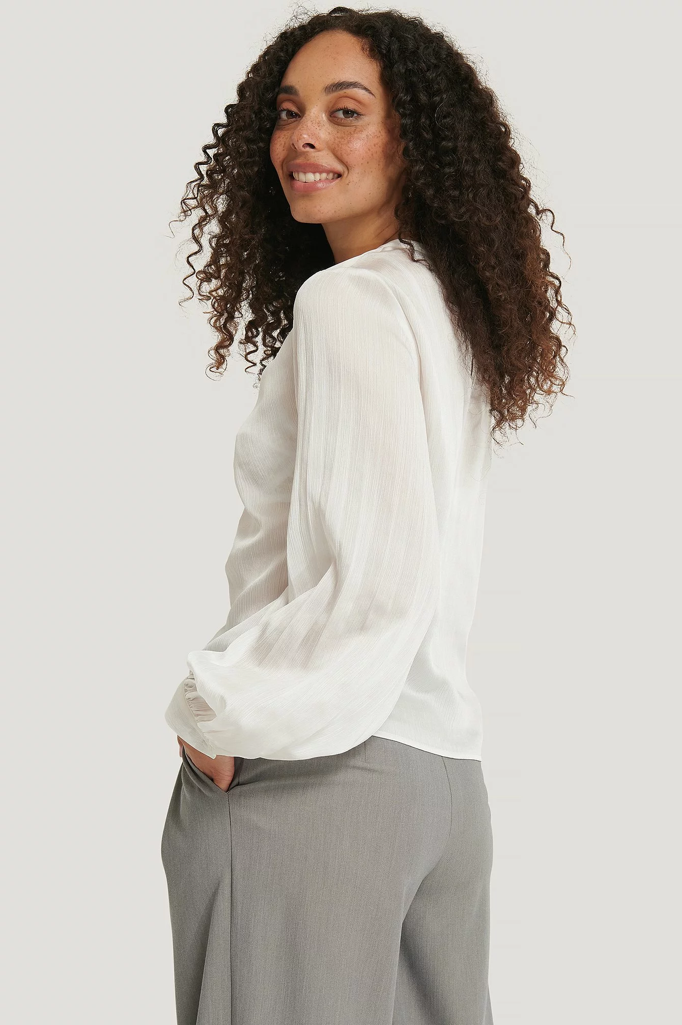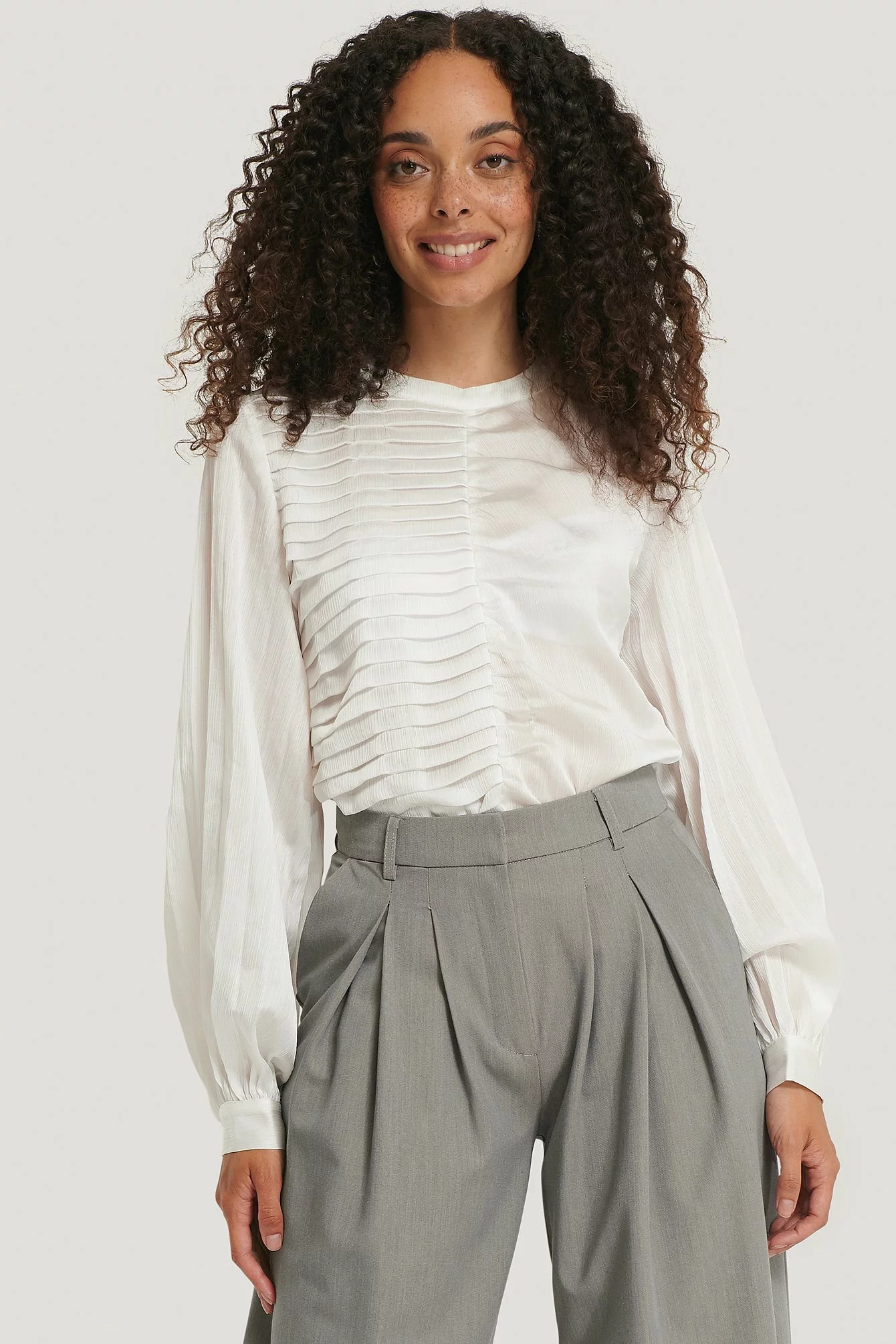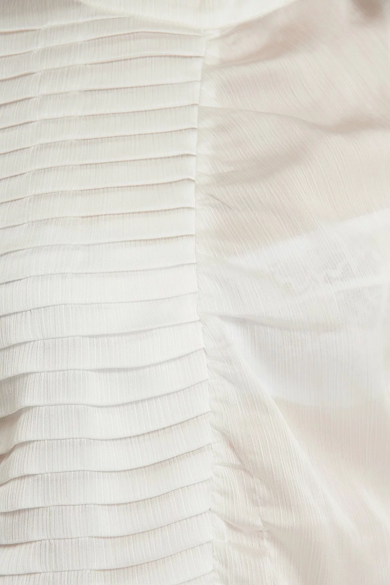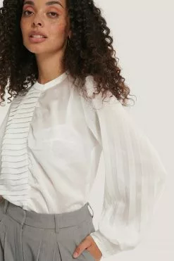 This blouse features a rounded neckline, a button closure behind the neck, long sleeves, a ruched, pleated design at the front, gathered single button cuffs and a slightly transparent loose fit.