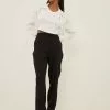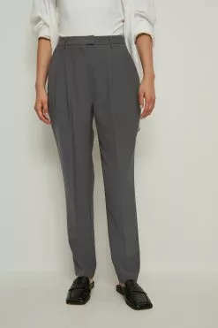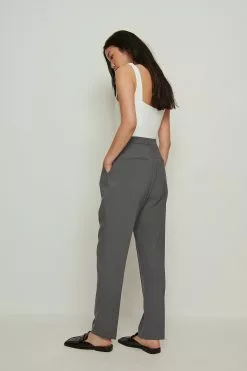 These suit pants feature a high waist, a pleated design, 2 front pockets, back mock pockets and cropped length.