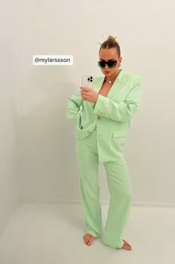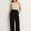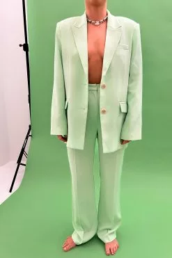 These suit pants are tailored and feature a high waist with a belt loop and a zipper, hook and button closure, wide legs, side slanting pockets and back mock pockets.