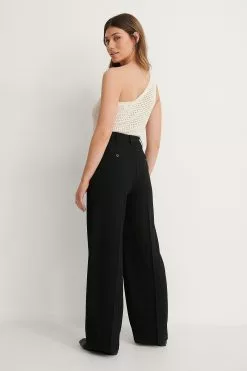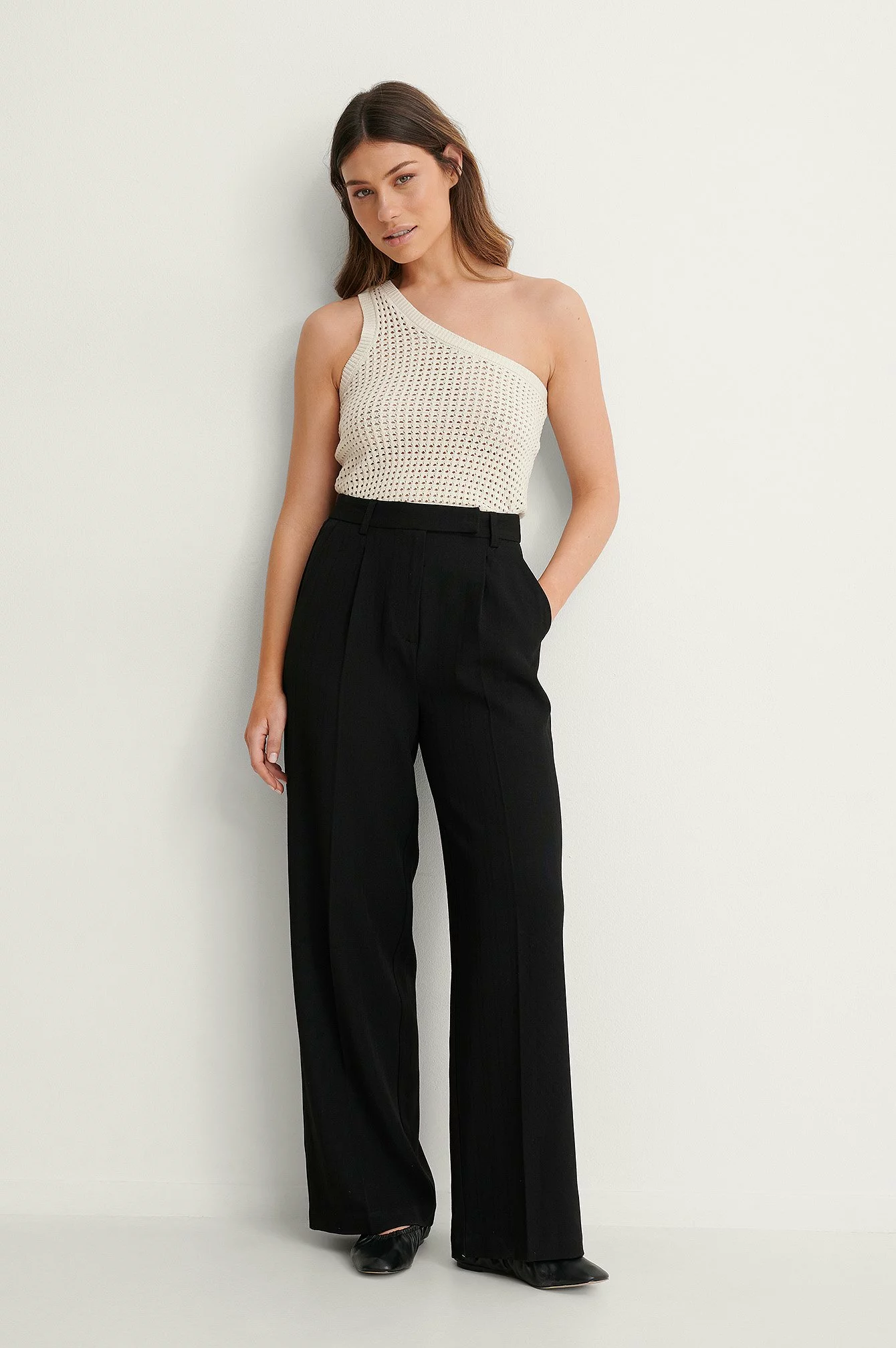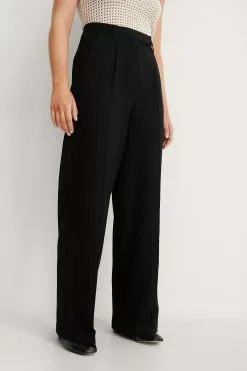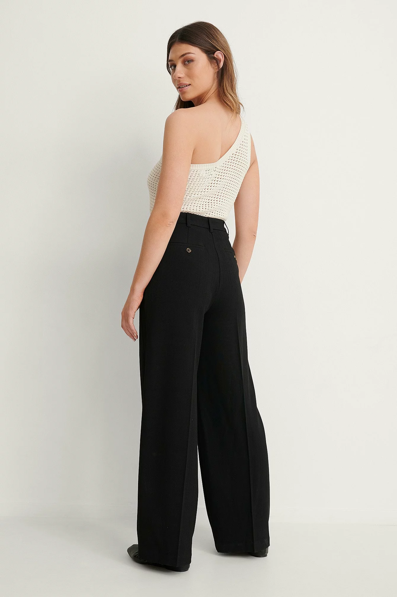 These pants feature a high waist with belt loops, side pockets, pleated details and wide legs.