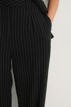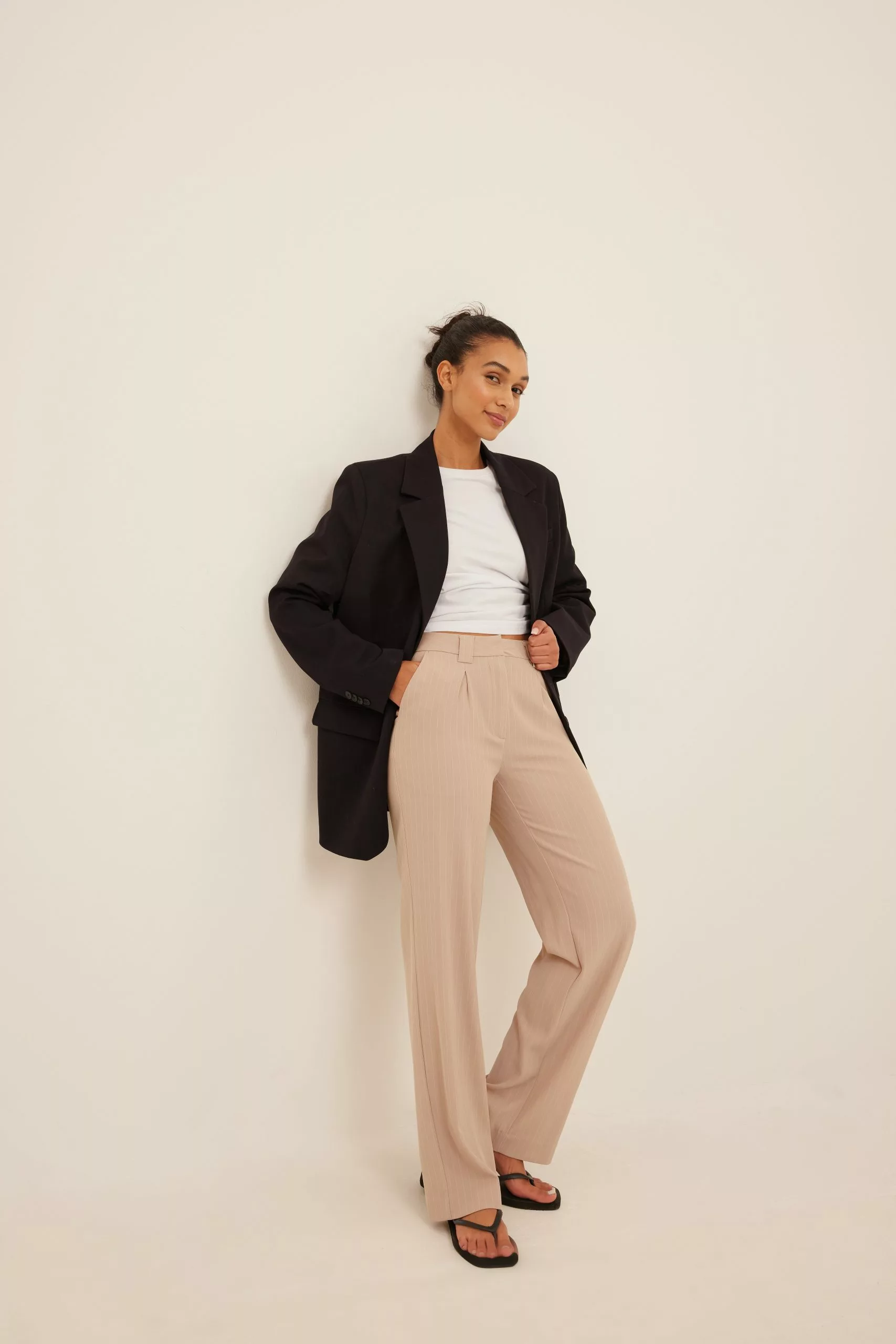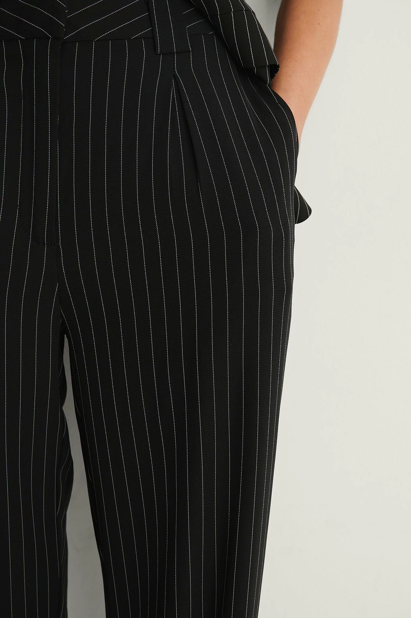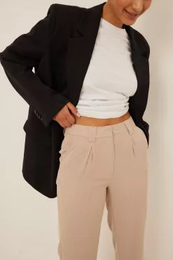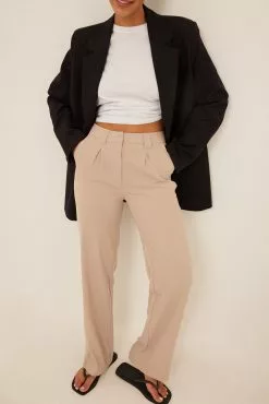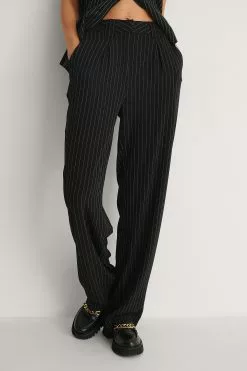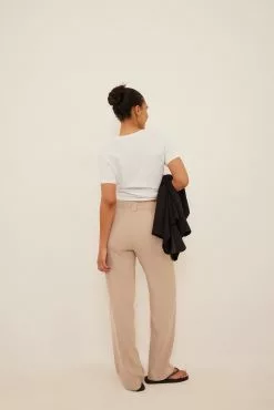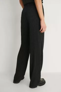These pants feature a high waist, two side slanting pockets, a zip and hook closure, wide legs and a soft touch.