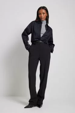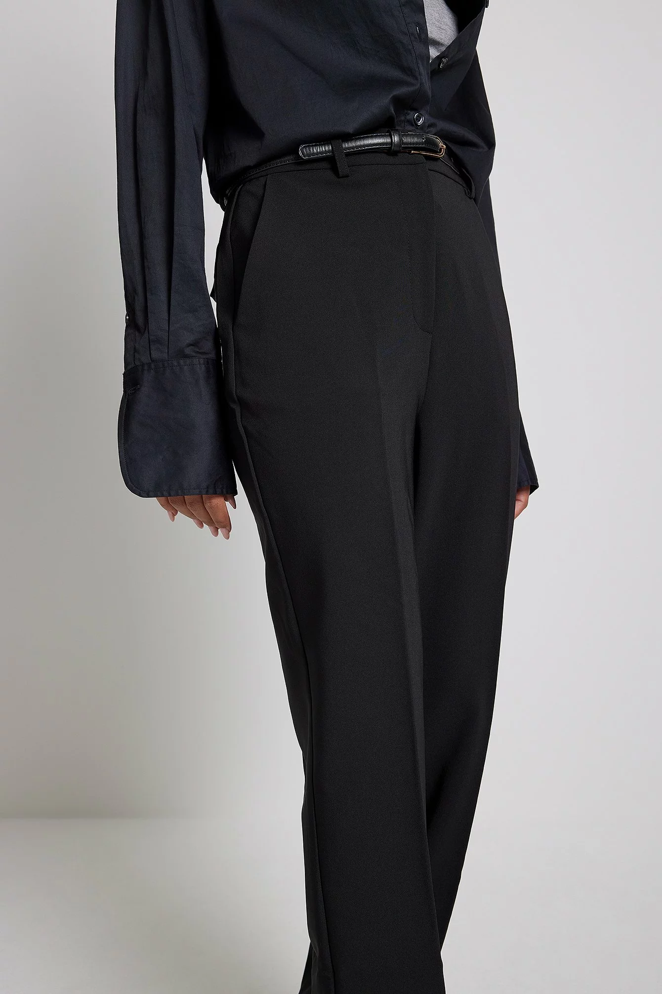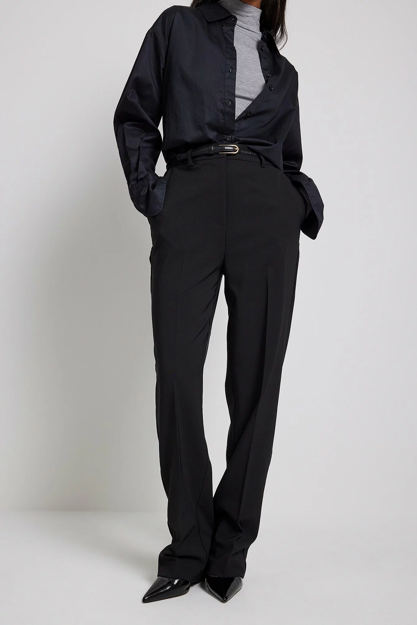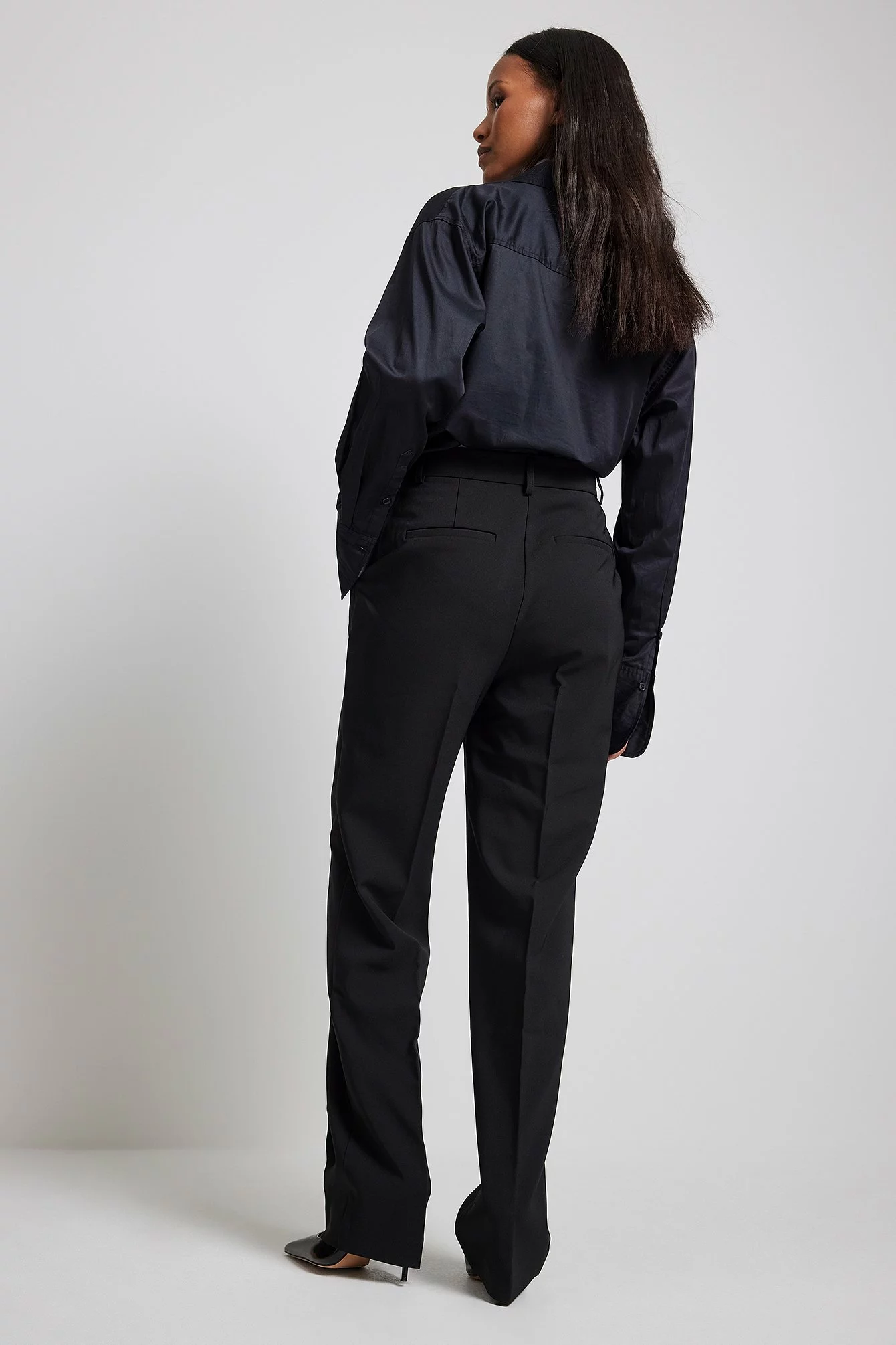 These pants feature a tailored fit, a zipper, hook and button closure, side slant pockets, a straight leg and a back mock pocket.