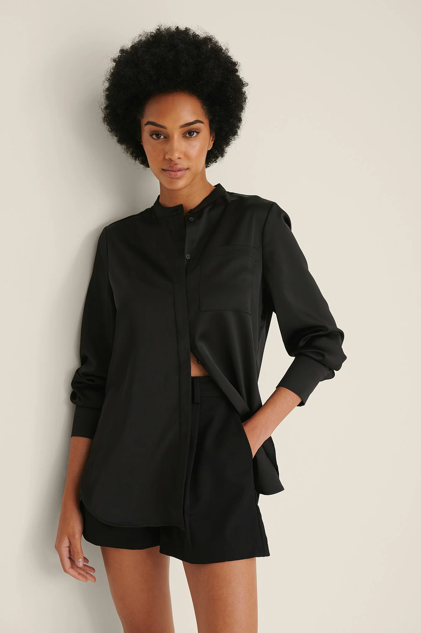 This blouse features a rounded neckline, long sleeves with double button cuffs, one chest pocket, button closures down the front, a silky touch and a long fit.
