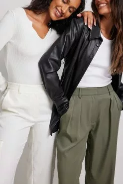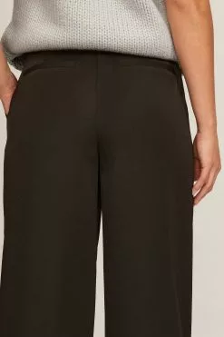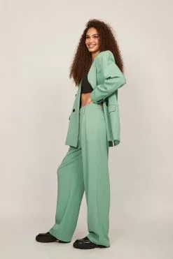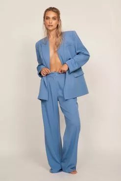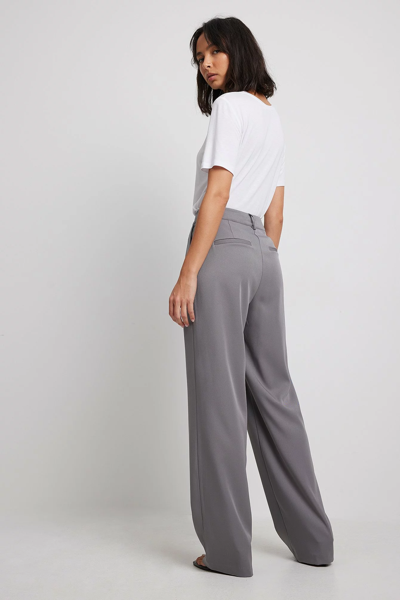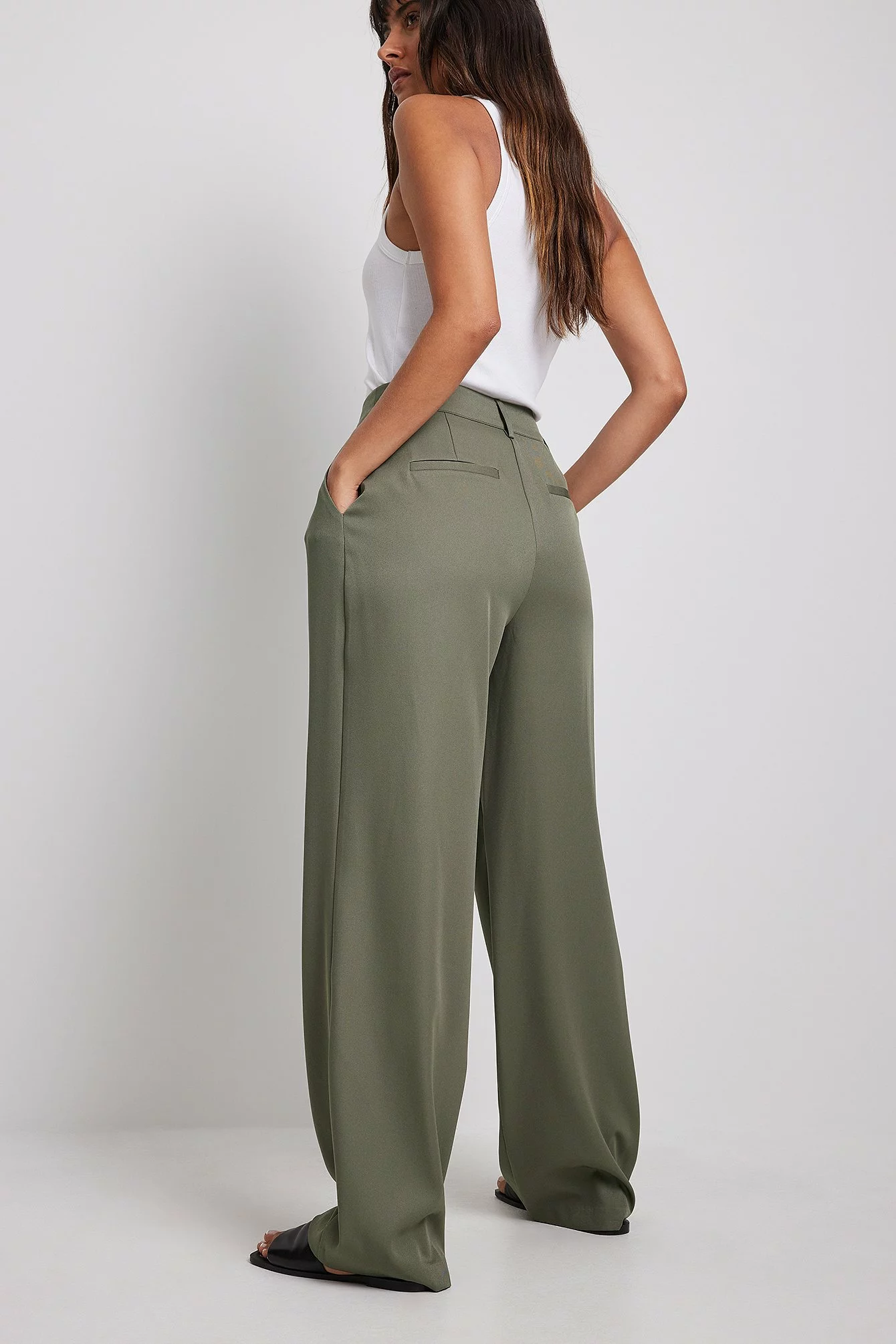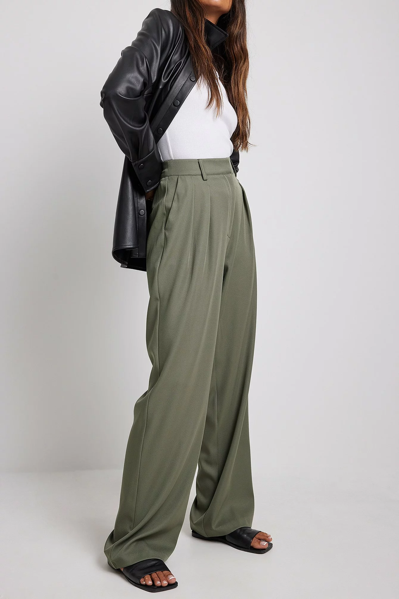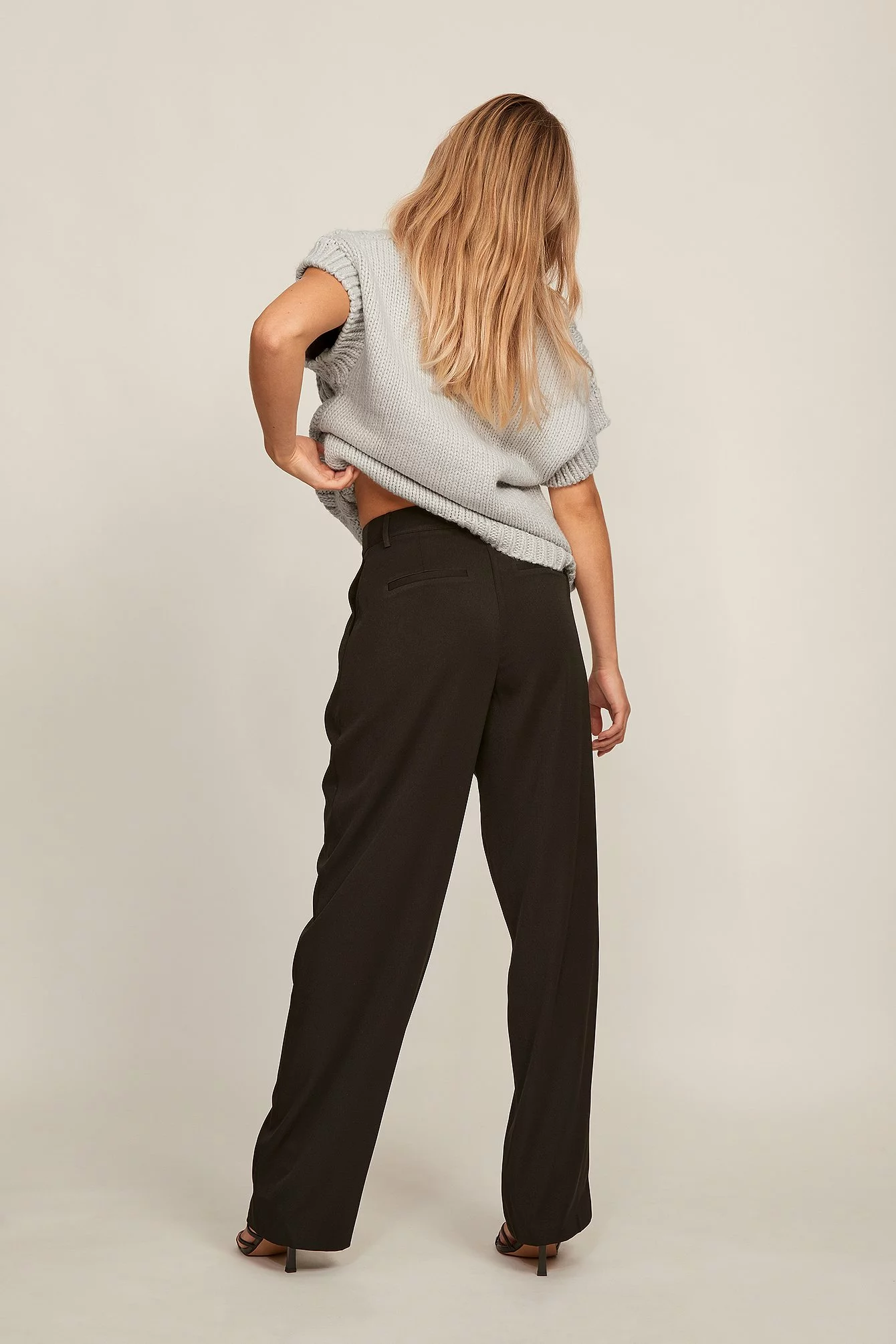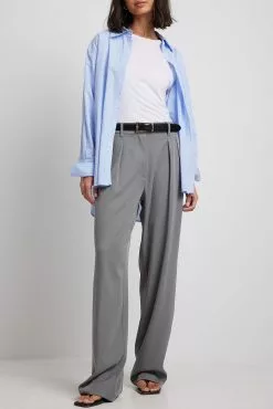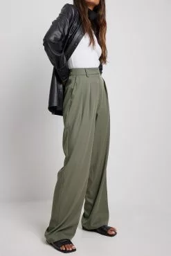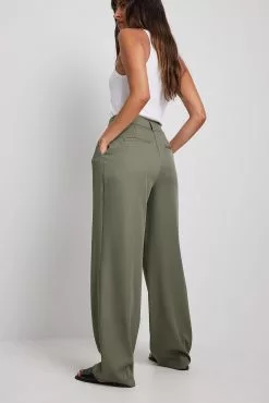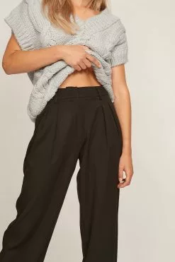 These trousers feature a high waist. They have a zipper, hook and button closure and belt loops. These trousers feature pleats at the waist, side pockets, back mock pockets and wide legs.