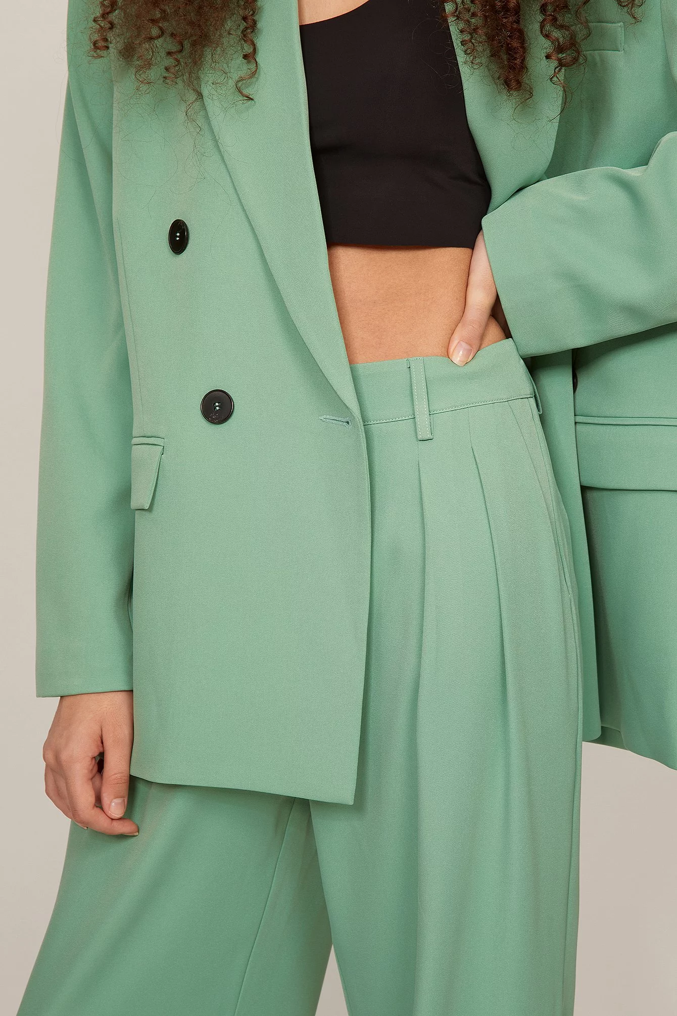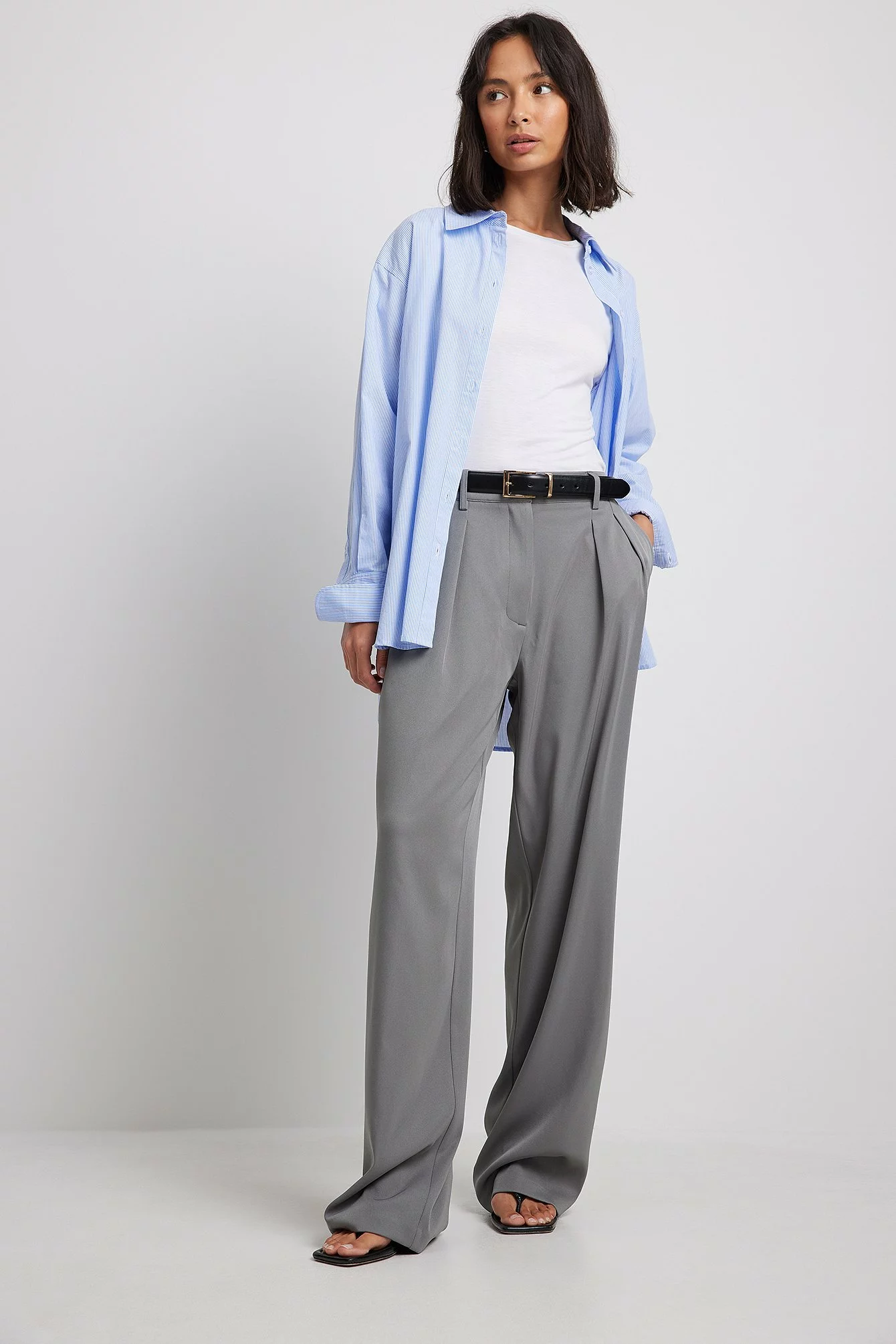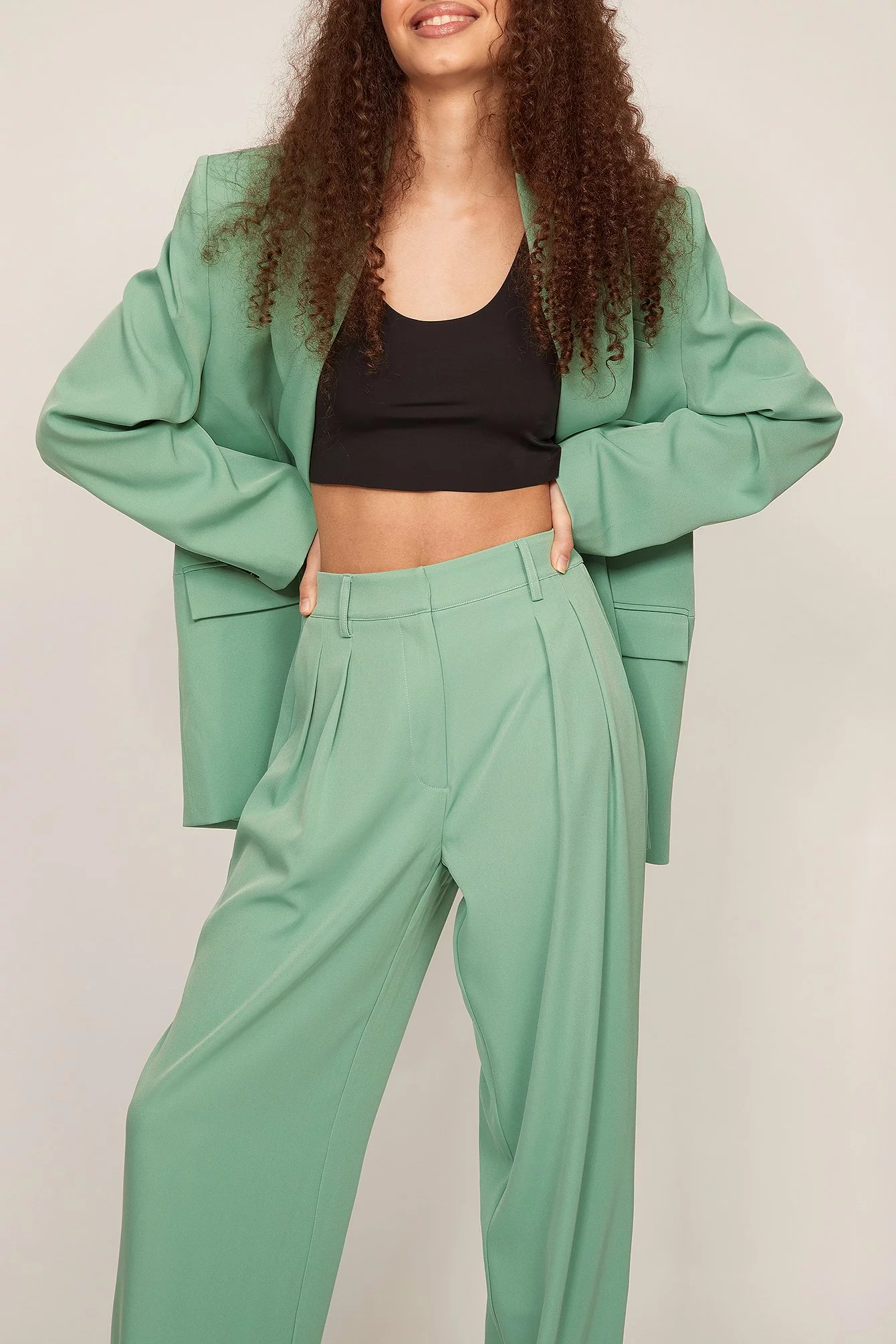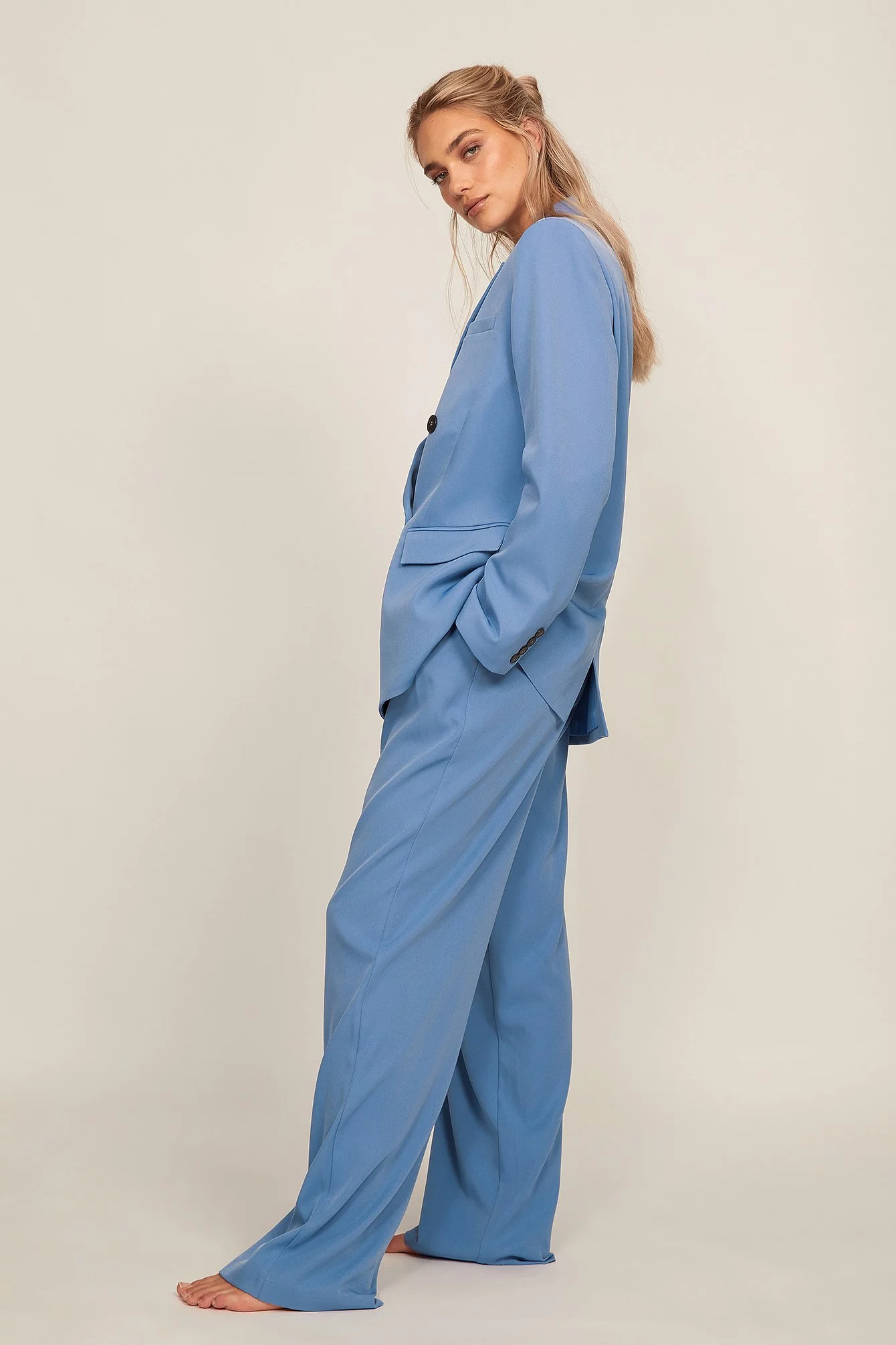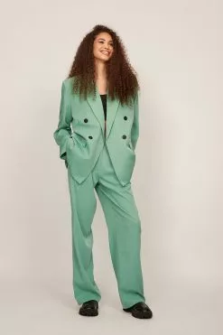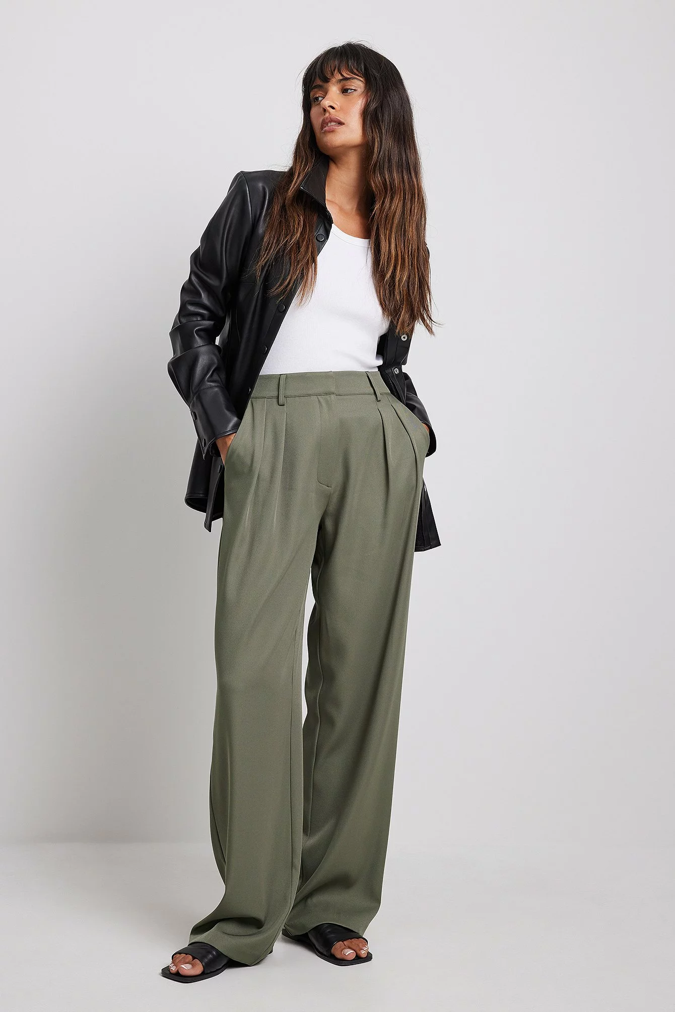 These trousers feature a high waist. They have a zipper, hook and button closure and belt loops. These trousers feature pleats at the waist, side pockets, back mock pockets and wide legs.